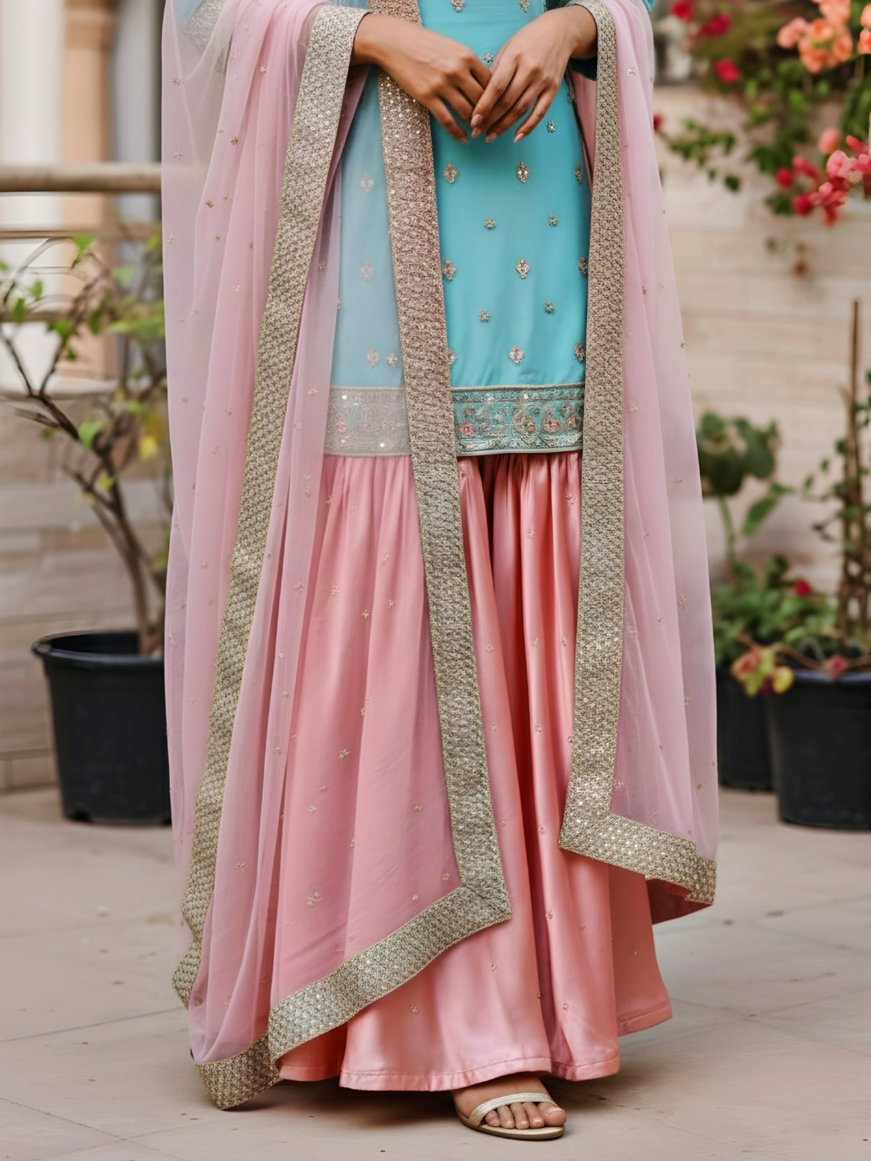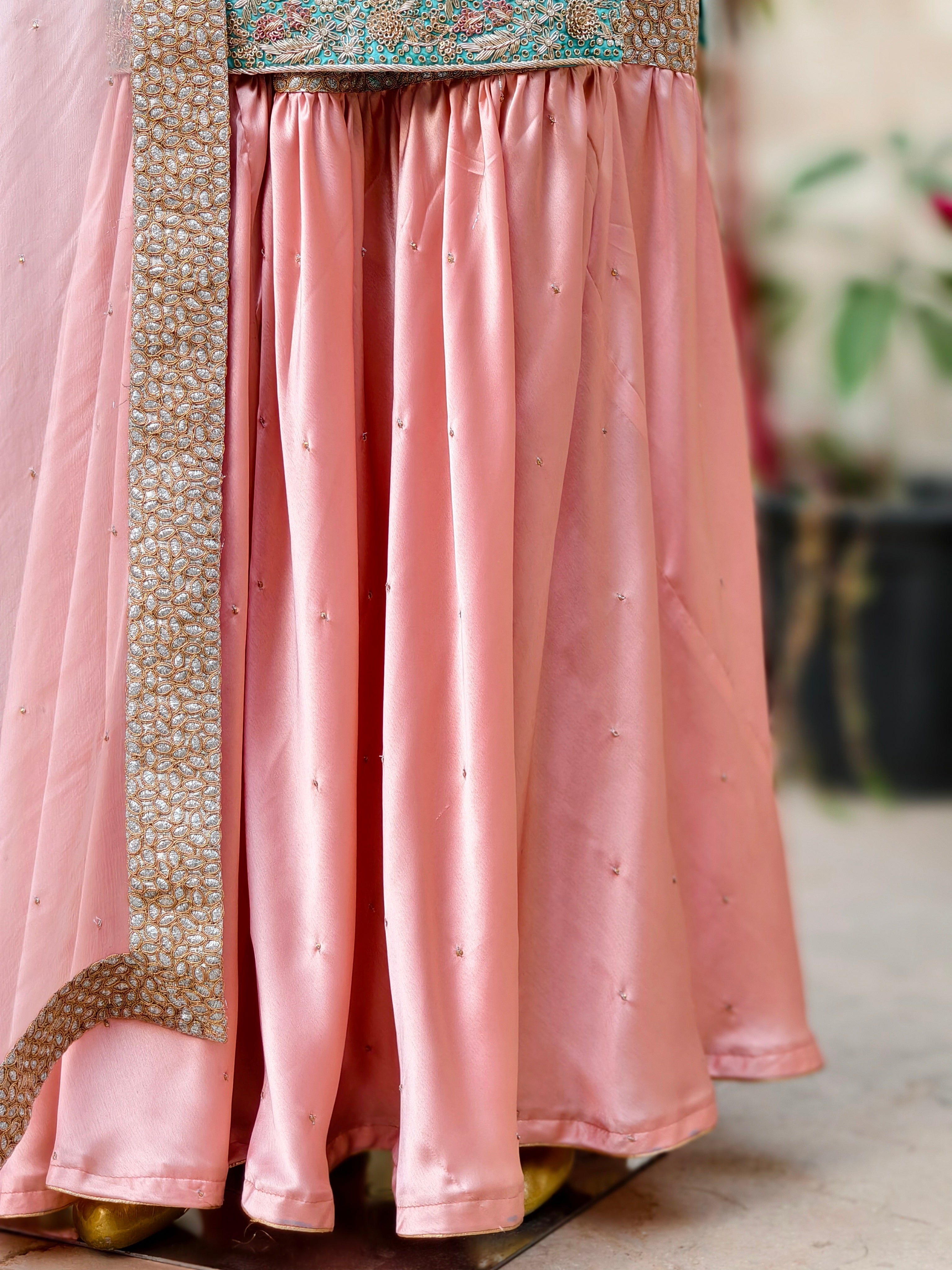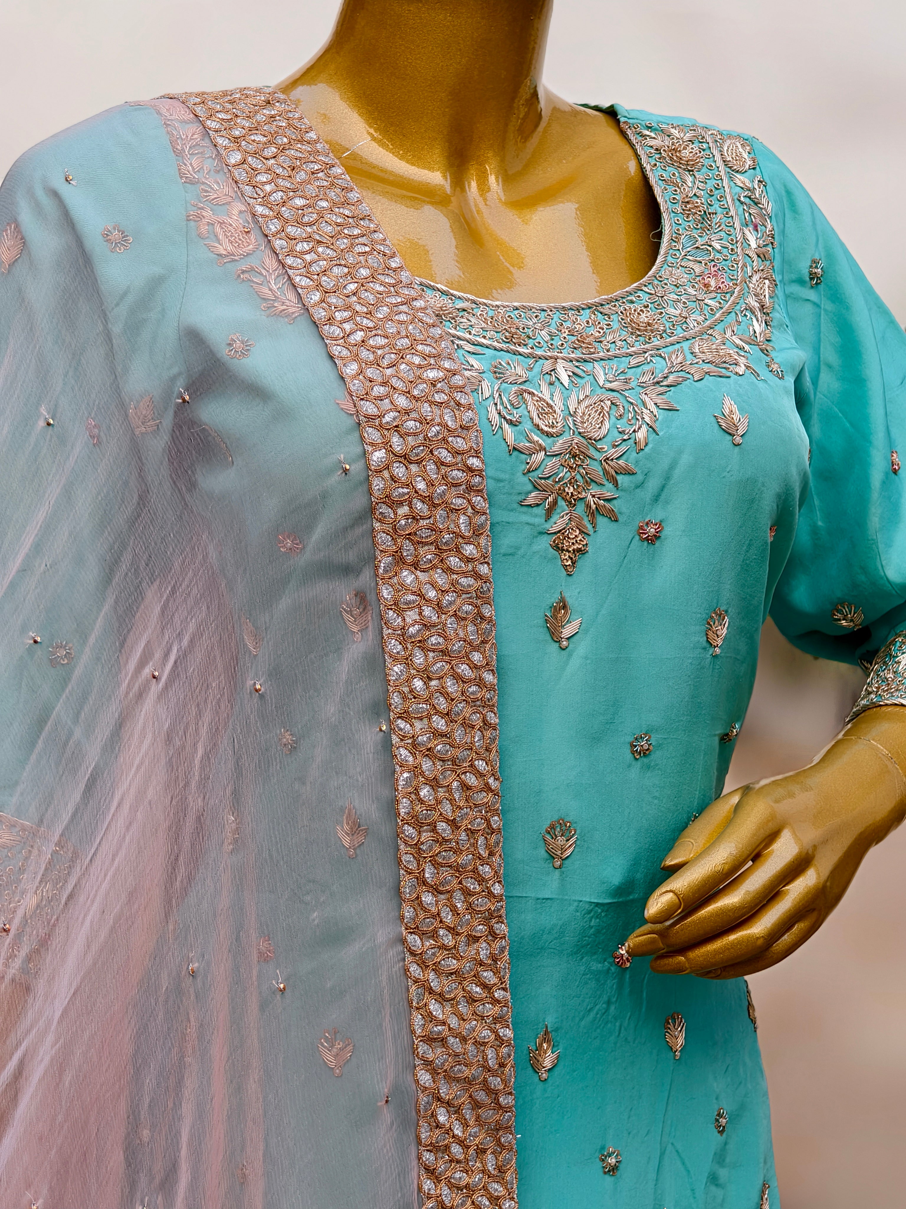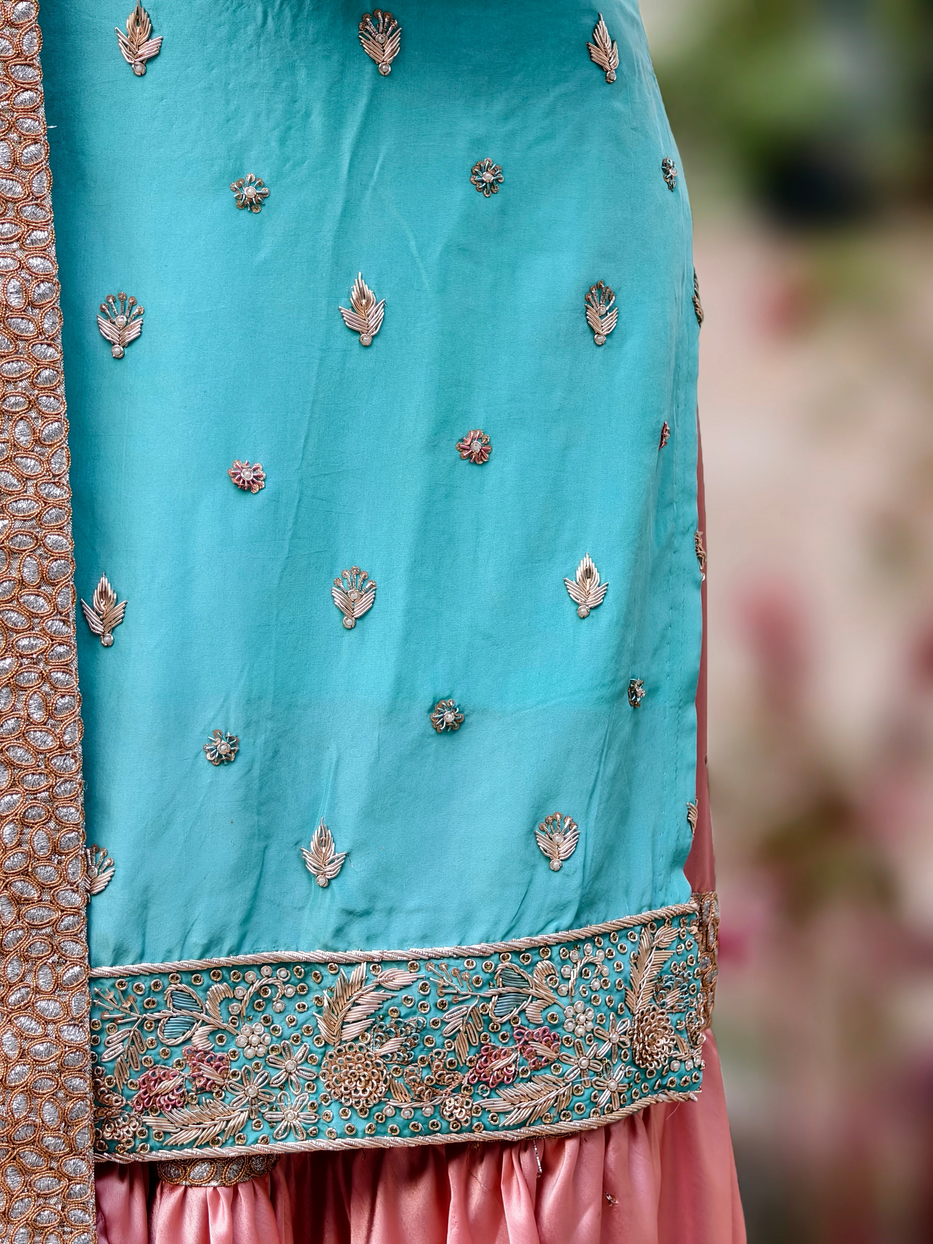 The soothing aqua pure silk shirt is beautifully embellished with handcrafted dabka zardozi embroidery, adding a touch of royalty with every intricate detail. Paired with a graceful Satin Silk Gharara in a delicate blush shade — it flows like a dream, capturing every moment with grace.