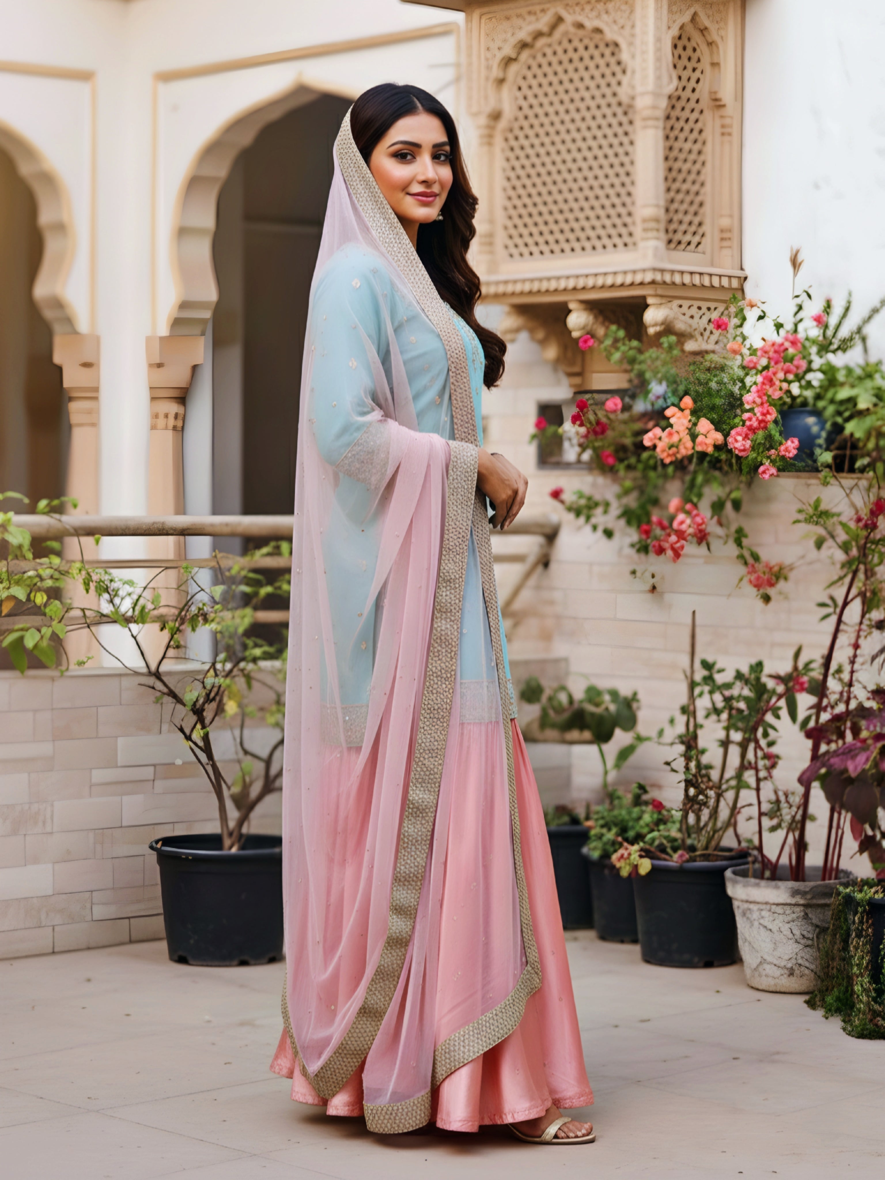 This Aqua & Blush Pure Silk Gharara Set is made for the girl whose presence brings calm, joy, and charm to every celebration. The one who laughs freely, spreads love effortlessly, and steals hearts without even trying.