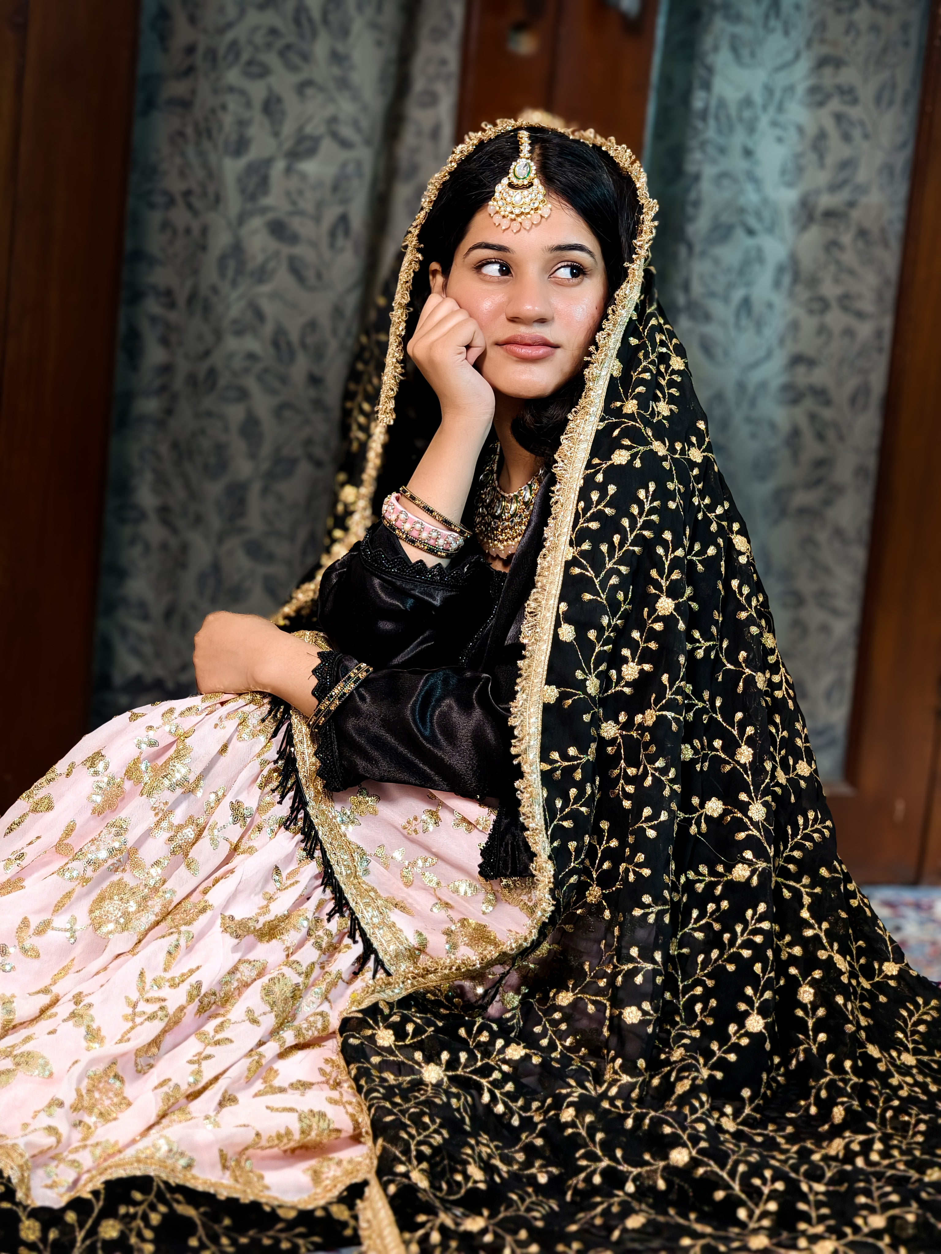 This exquisite black and pink gharara set is a perfect blend of elegance and tradition, designed for wedding festivities, nikkah ceremonies, and festive occasions. The black satin kameez adds a touch of sophistication, while the soft pink gharara with intricate golden embroidery enhances the royal charm. The look is completed with a heavily embroidered black dupatta, making it an ideal choice for bridesmaids, wedding guests, or cultural celebrations.