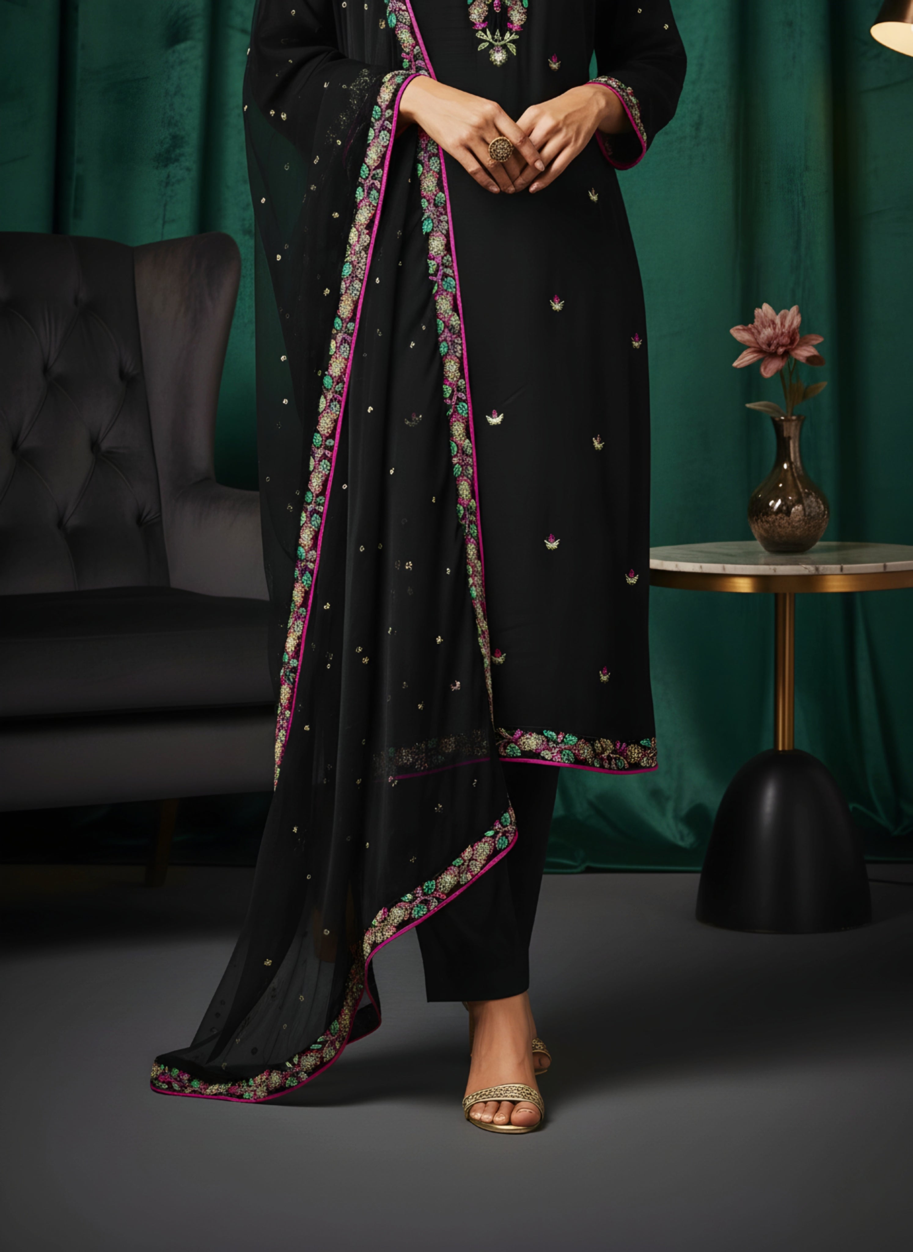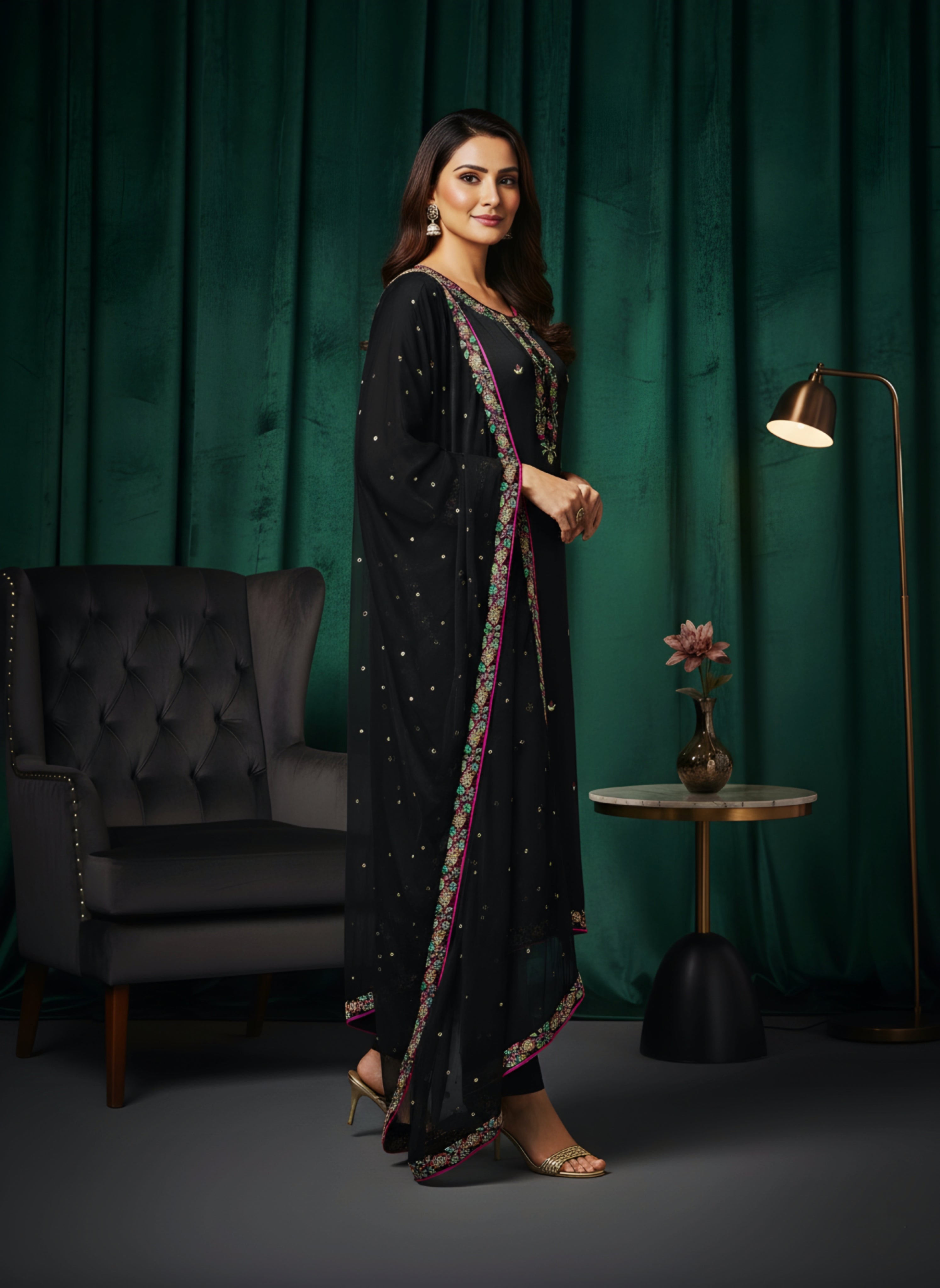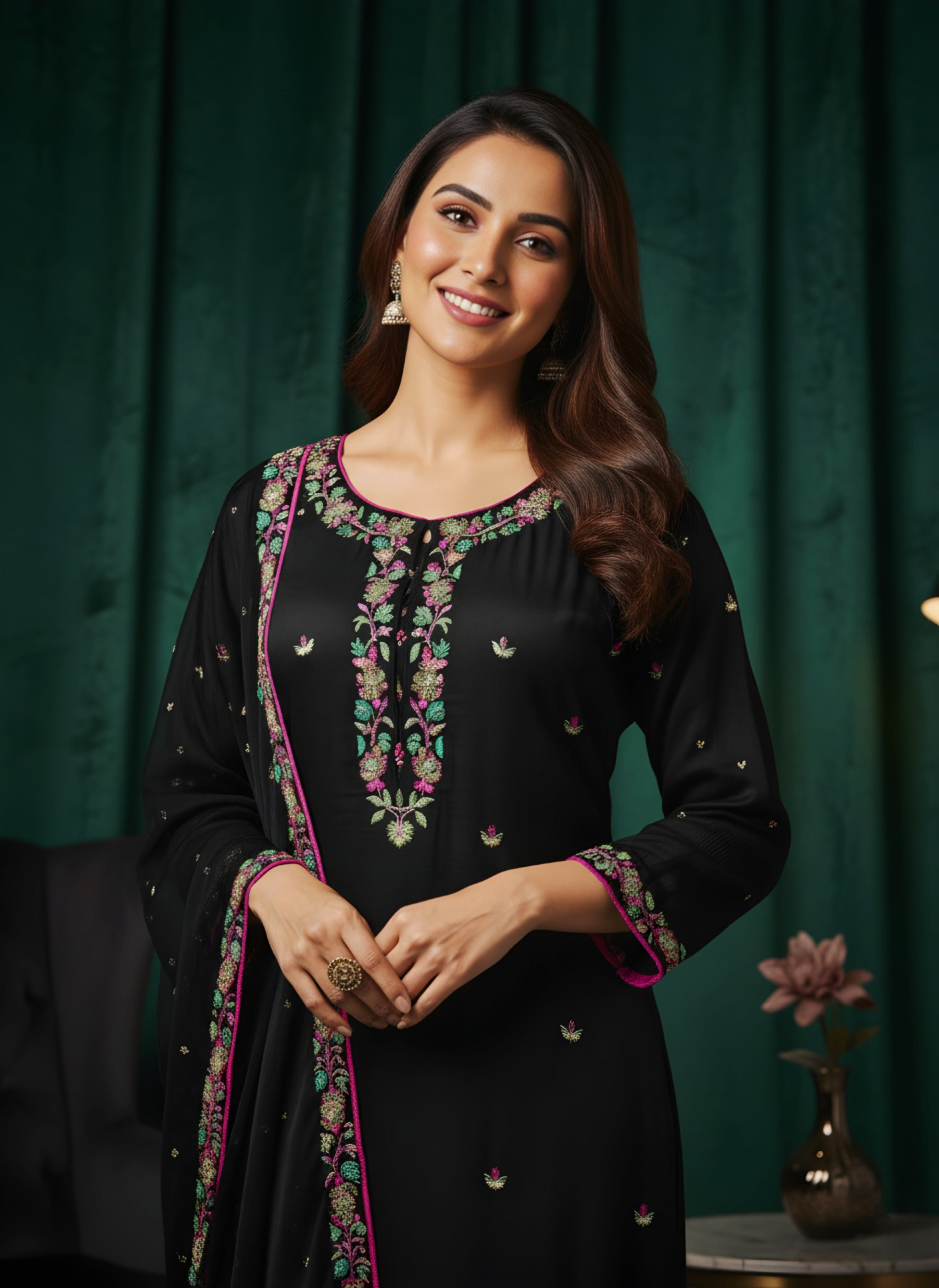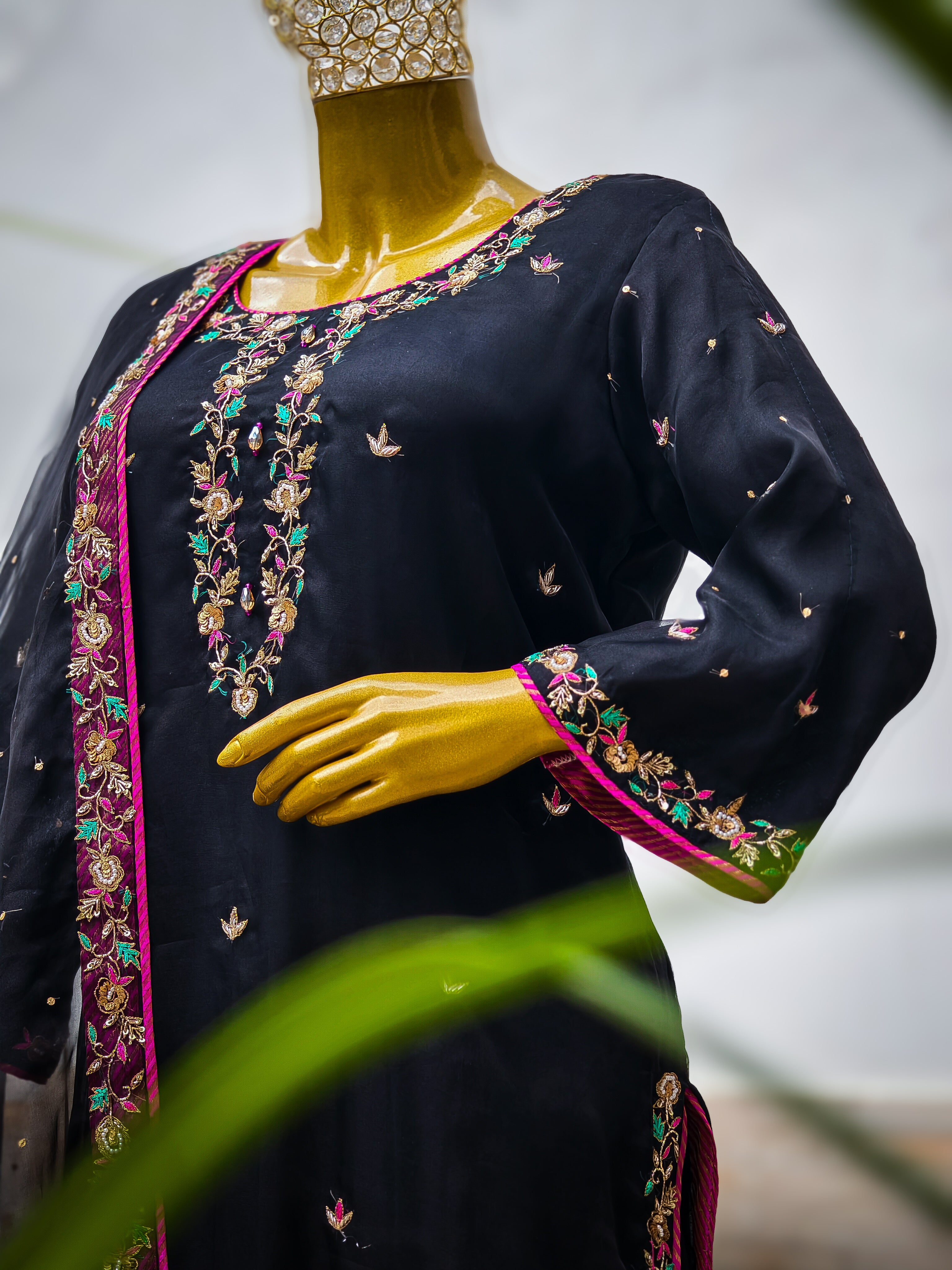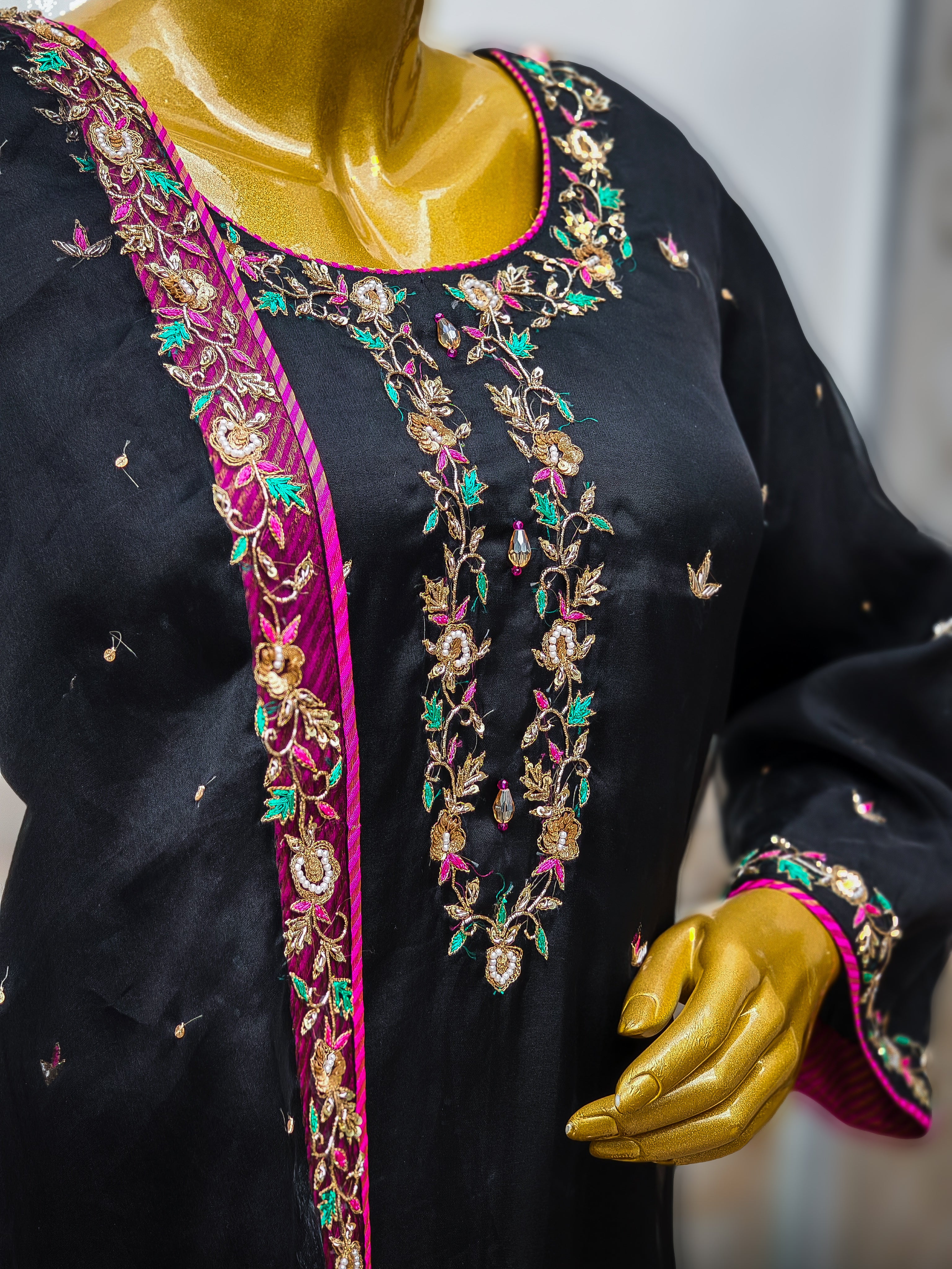 Step into timeless elegance with this Black Pure Organza Suit, an outfit that beautifully blends luxury and heritage. Crafted from premium pure organza fabric, both the kurta and dupatta are enhanced with hand-done dabka zardozi and resham zari embroidery, showcasing delicate floral and traditional motifs.