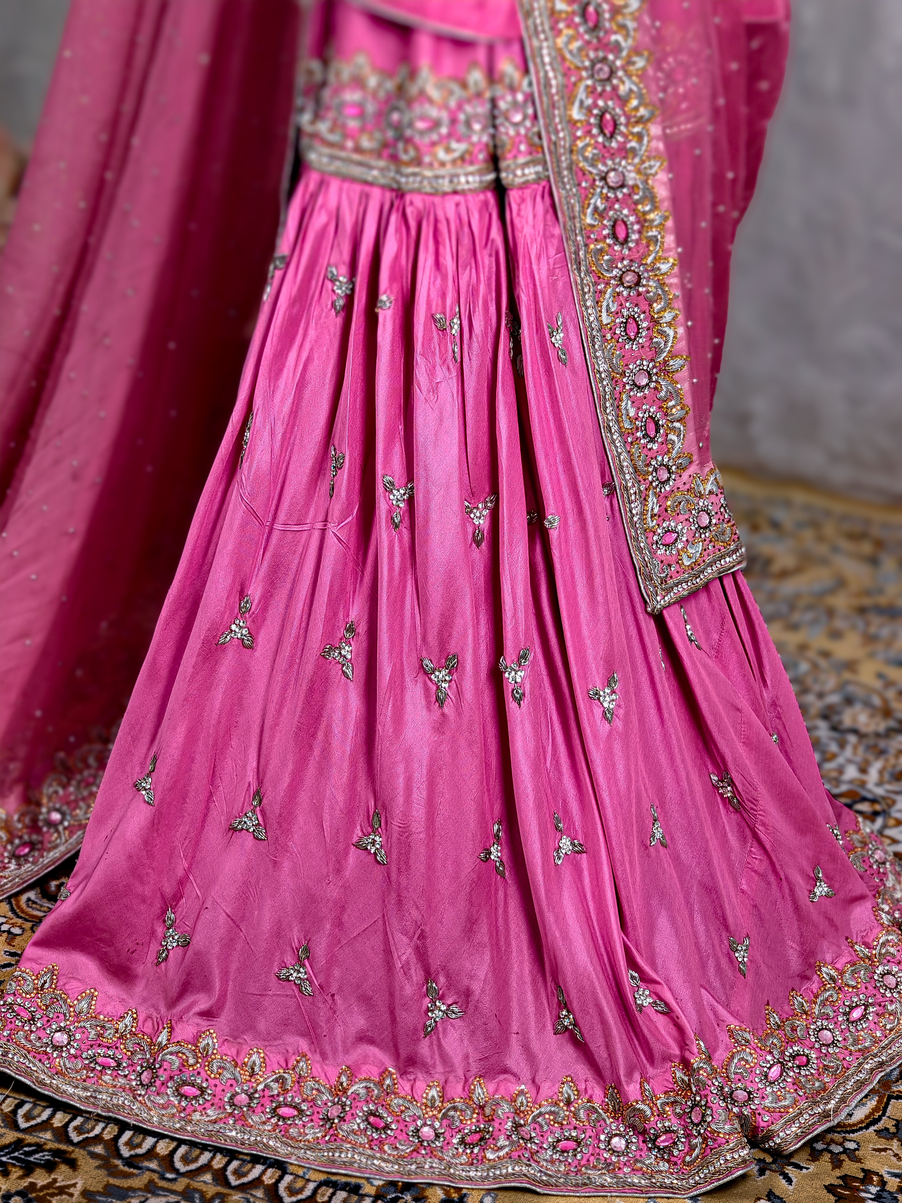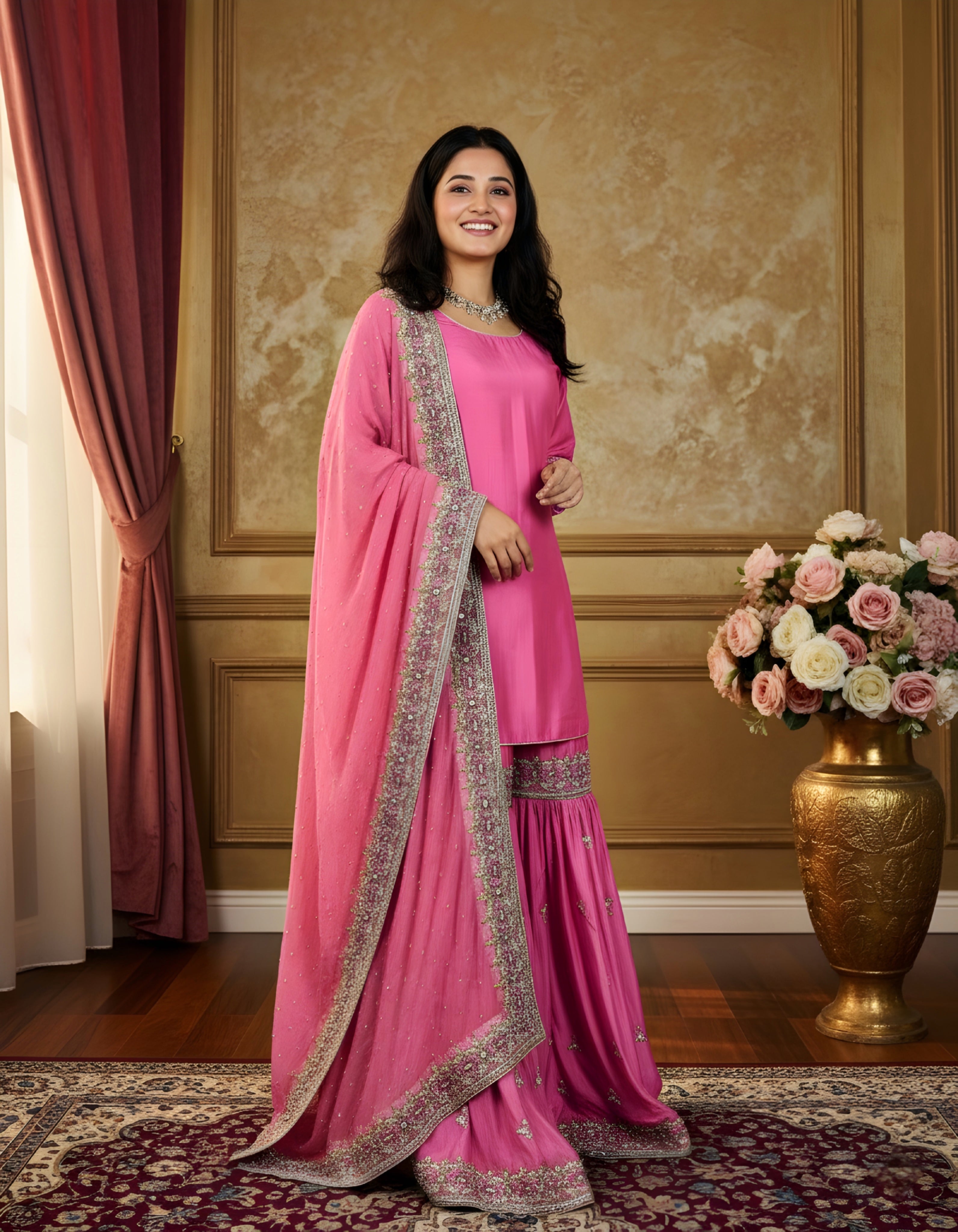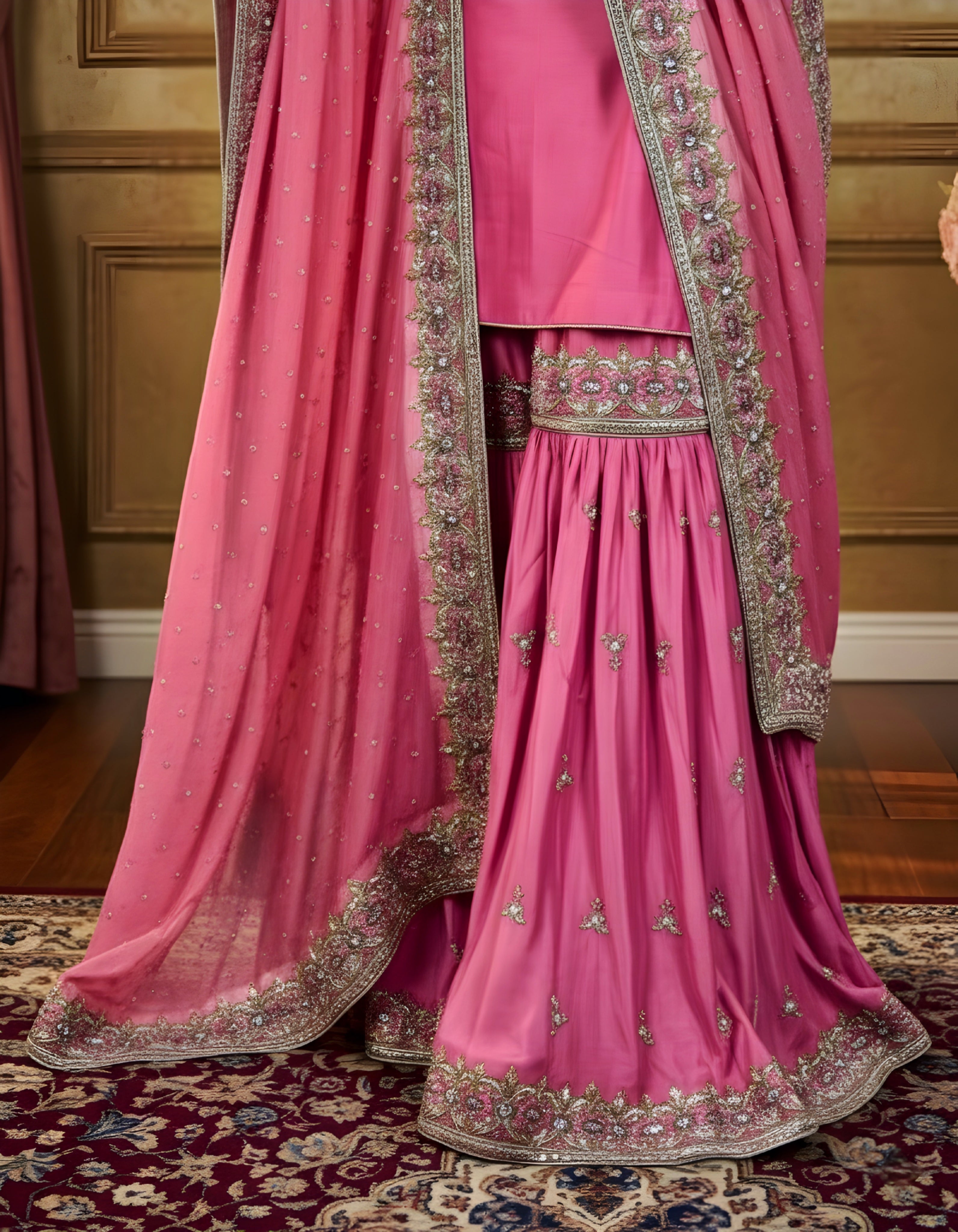 Step into elegance and tradition with this exquisite blush pink gharara set, perfect for weddings, festive celebrations, and special occasions. This beautifully designed ensemble features a soft silk kurti, paired with an intricately embroidered gharara and a heavily embellished dupatta. The delicate mirror and zari work enhance the charm of this outfit, making it a perfect blend of grace and grandeur.