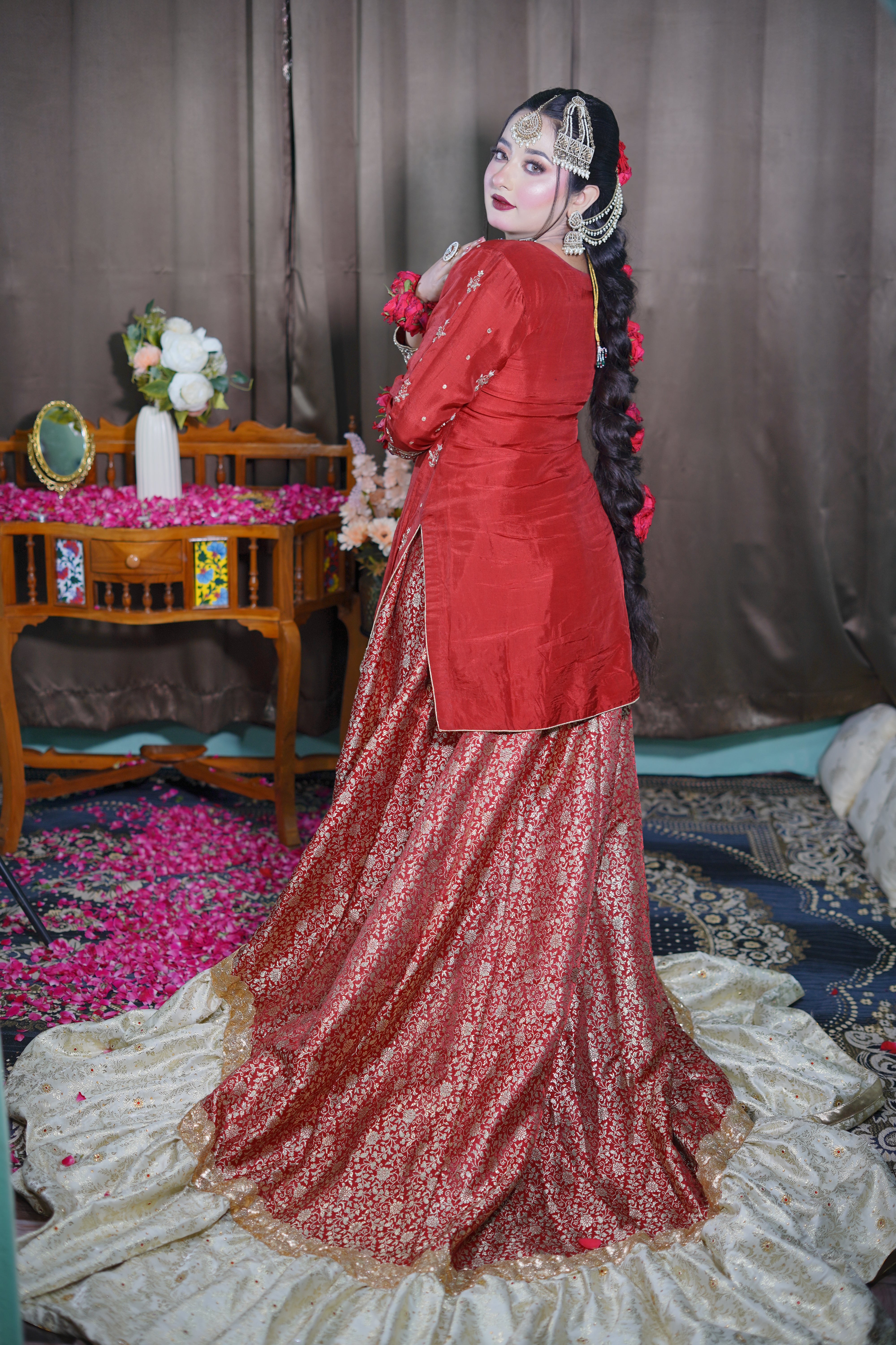 Exude royal elegance on your wedding day with this breathtaking bridal farshi gharara set, designed for the modern bride who cherishes tradition. The deep red kameez, crafted from rich Upara silk, features delicate hand-done dabka zardozi embroidery for a regal finish. The highlight of the ensemble is the farshi-style gharara, made from premium Khamkhab fabric with a sweeping trail and intricate lace detailing that enhances its grand look. The set is completed with a pure chiffon dupatta, beautifully bordered on all four sides with matching dabka zardozi work, adding a graceful touch to your bridal silhouette.