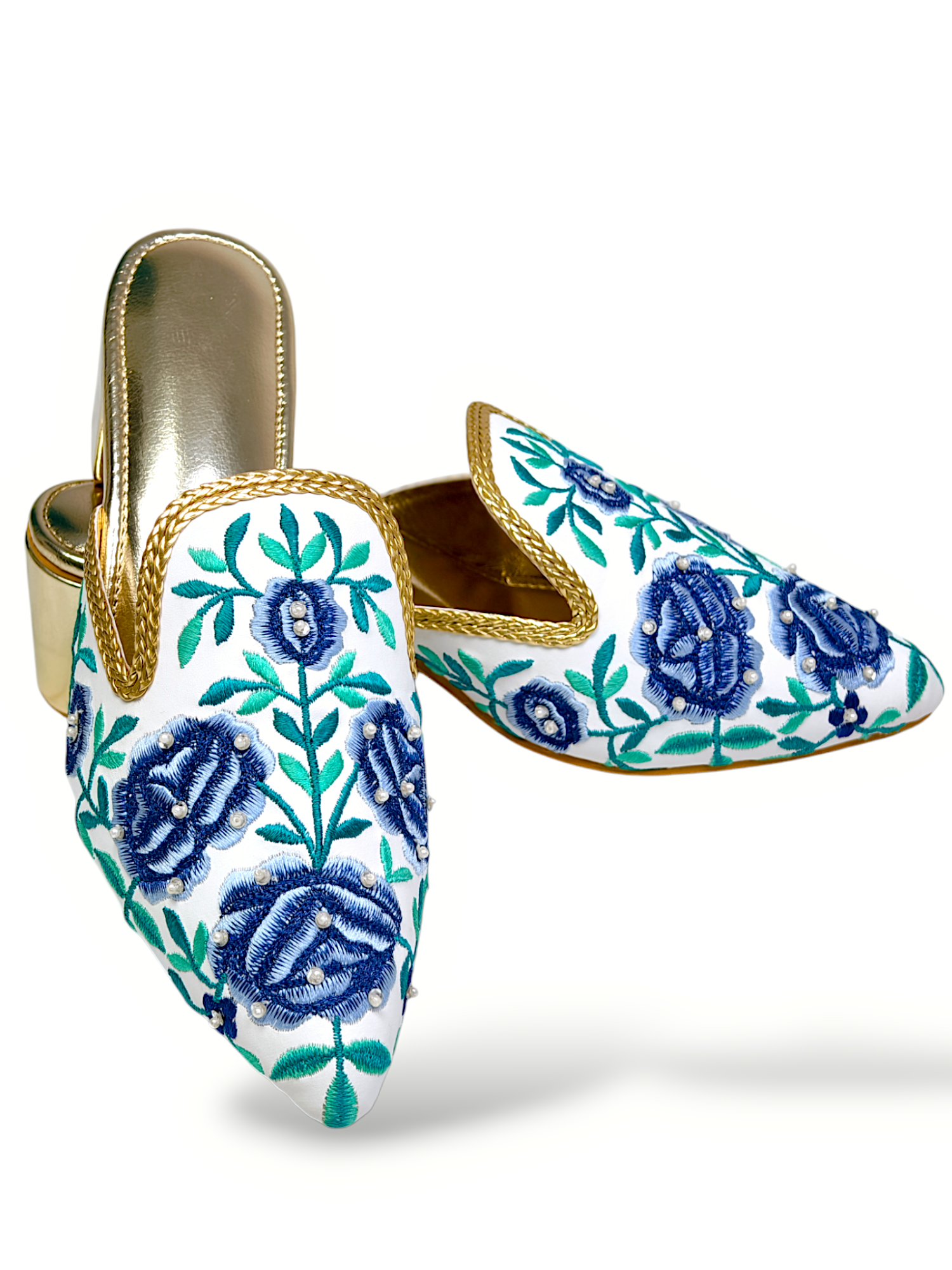 Buy Jutti that speaks elegance and tradition with this stunning handcrafted pair. Featuring exquisite floral embroidery in royal blue with pearl detailing on a white base, this jutti is the perfect match for your festive, wedding, or ethnic outfits. The golden cushioned insole not only adds a touch of luxury but also ensures all-day comfort.