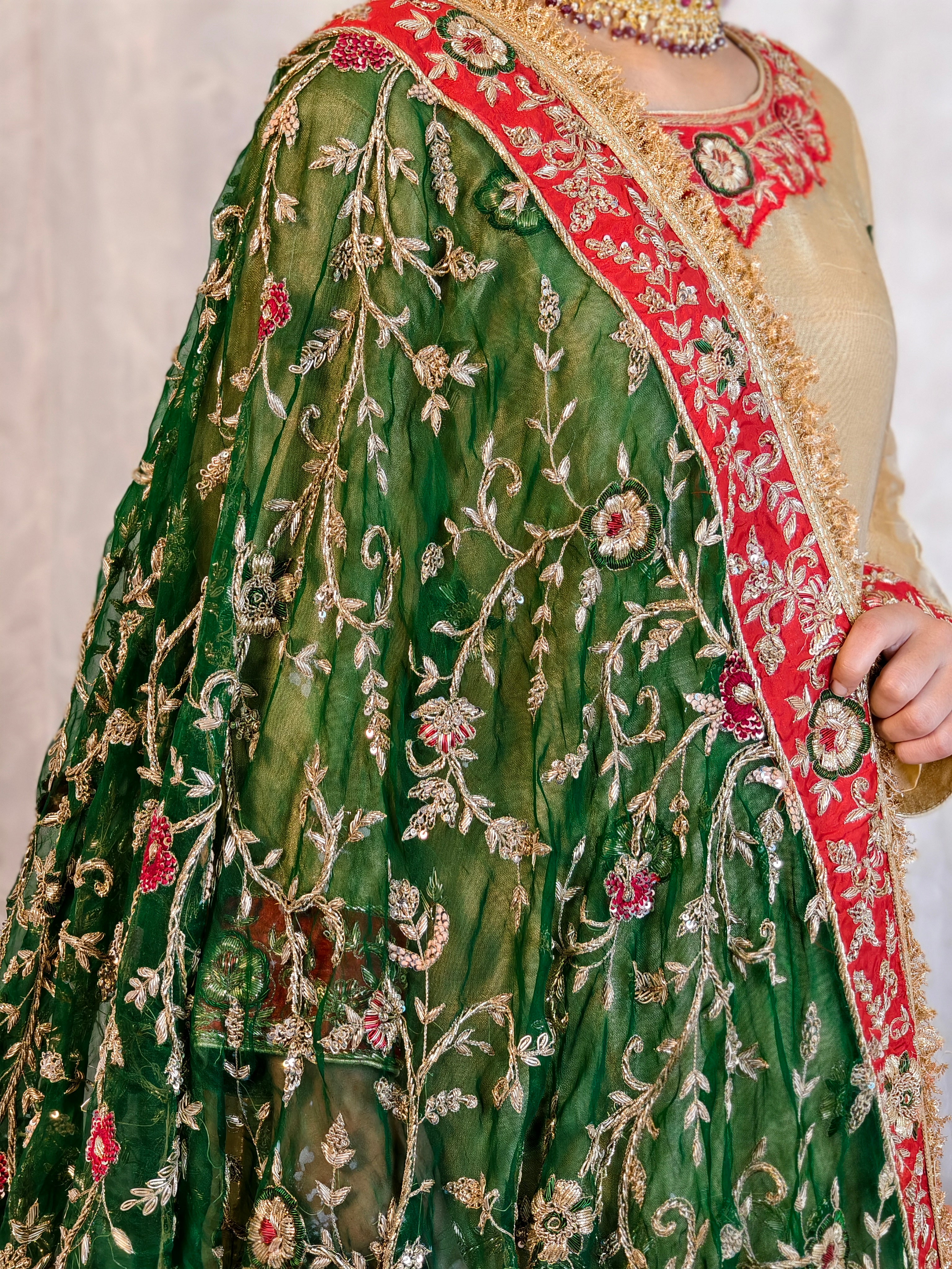 This exquisite gold and green bridal lehenga set exudes regal charm and traditional elegance. The golden kameez, featuring intricate zardozi embroidery, pairs perfectly with the deep green lehenga, adorned with delicate floral zari and resham work. The contrasting red-bordered dupatta enhances the richness of this bridal ensemble, making it a perfect choice for weddings, mehndi, or festive occasions.