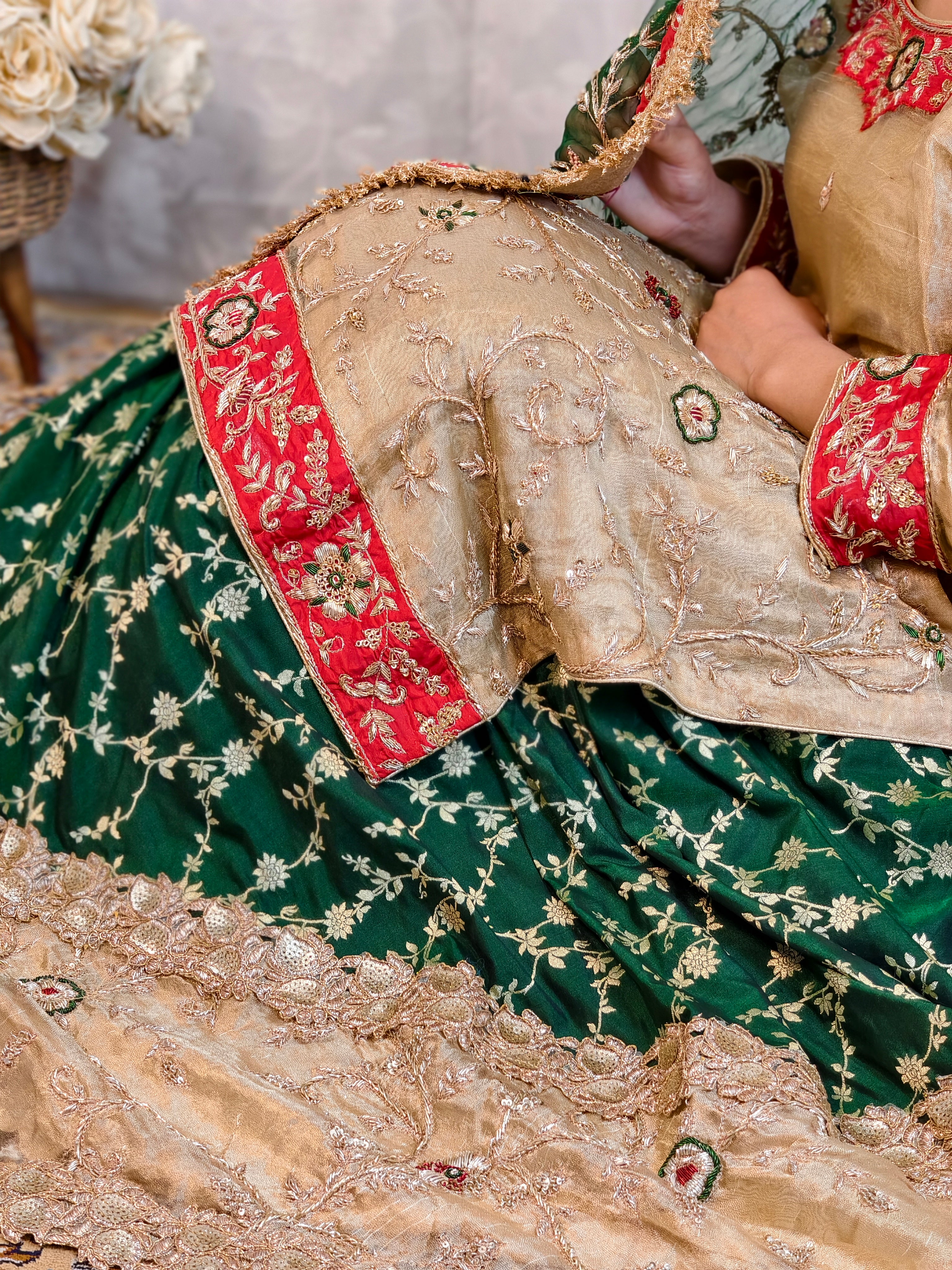 Lehenga: Pure Banarasi fabric with dabka zardozi embroidery and hand-stitched embellishments.