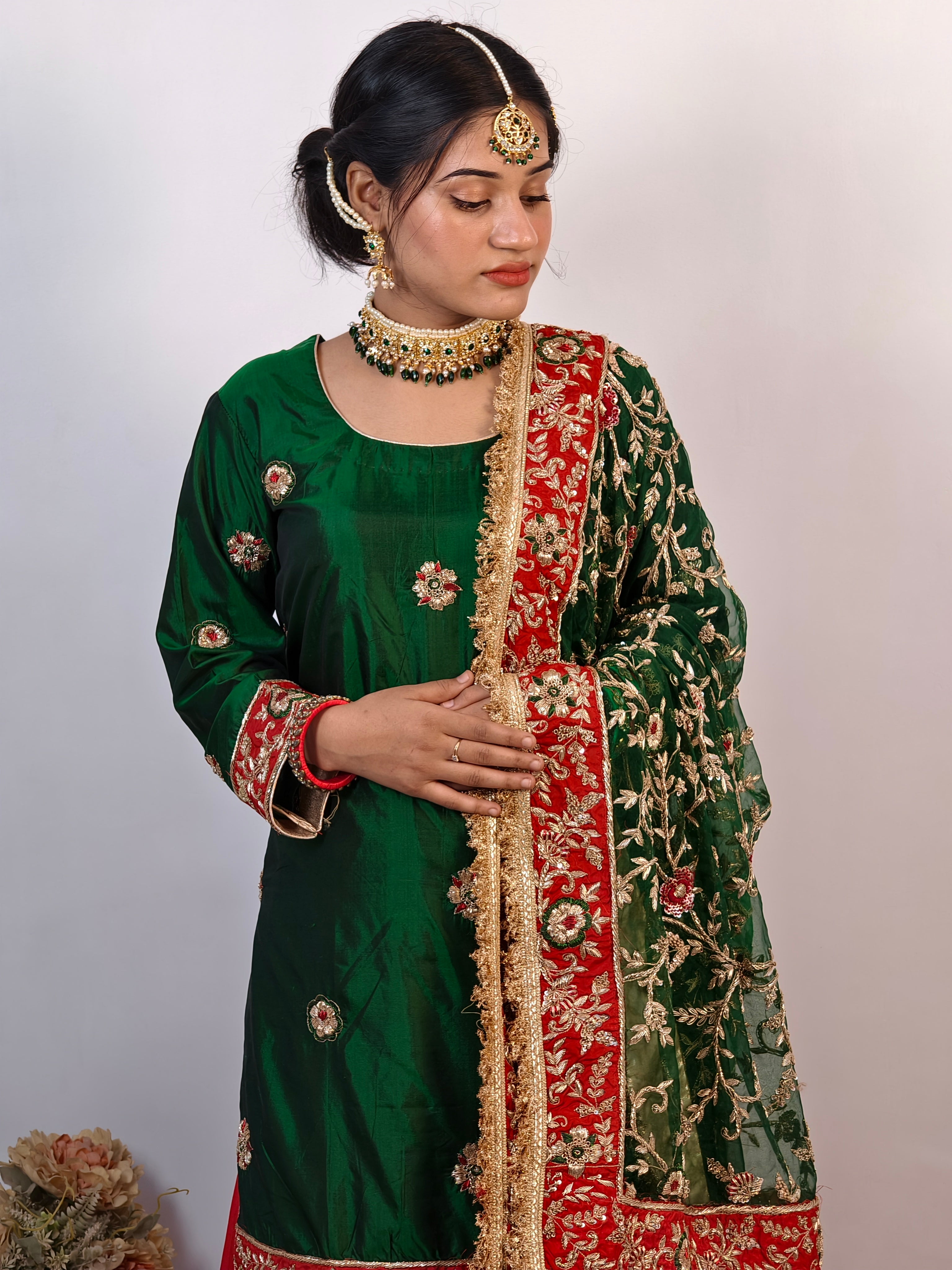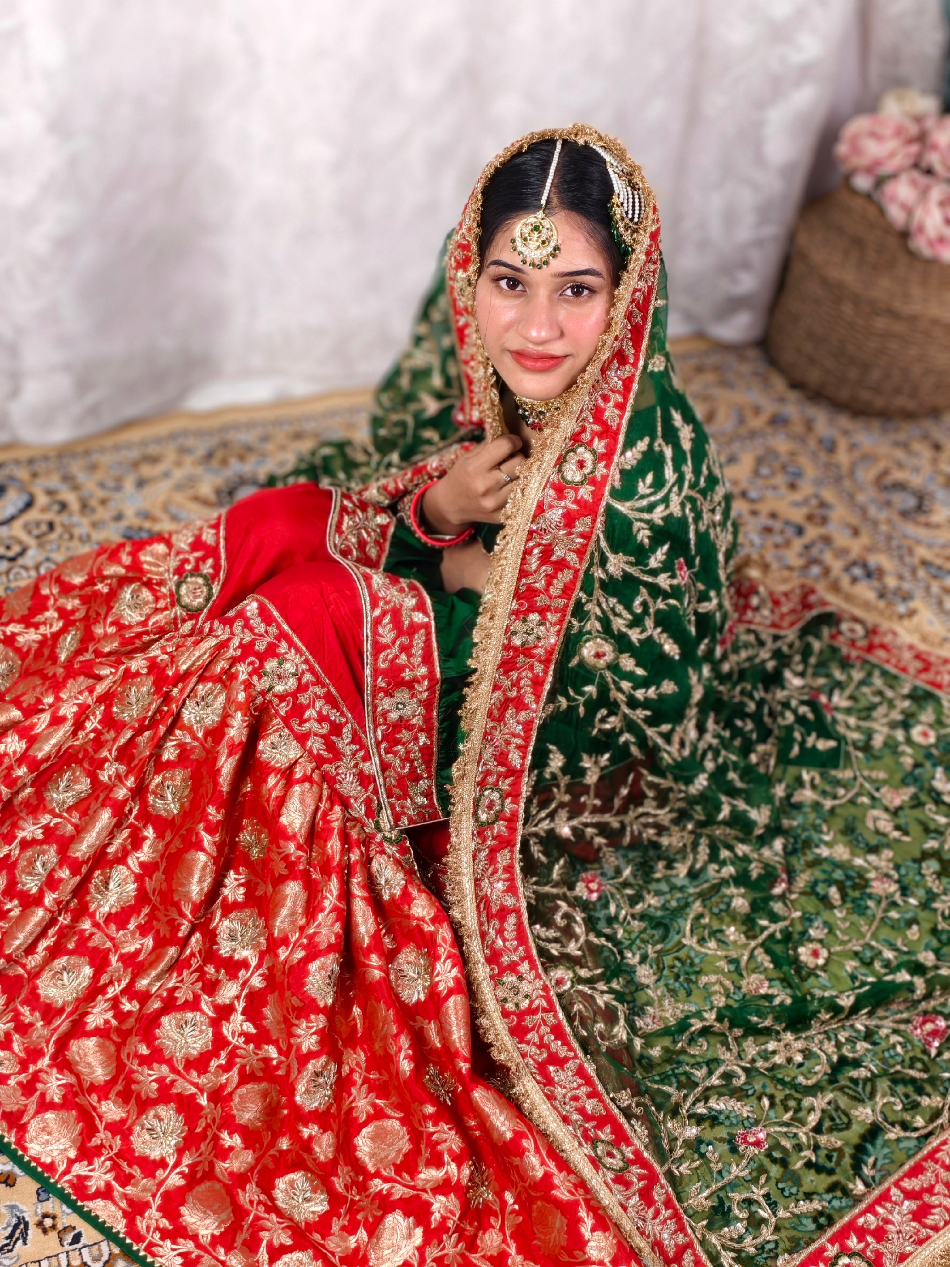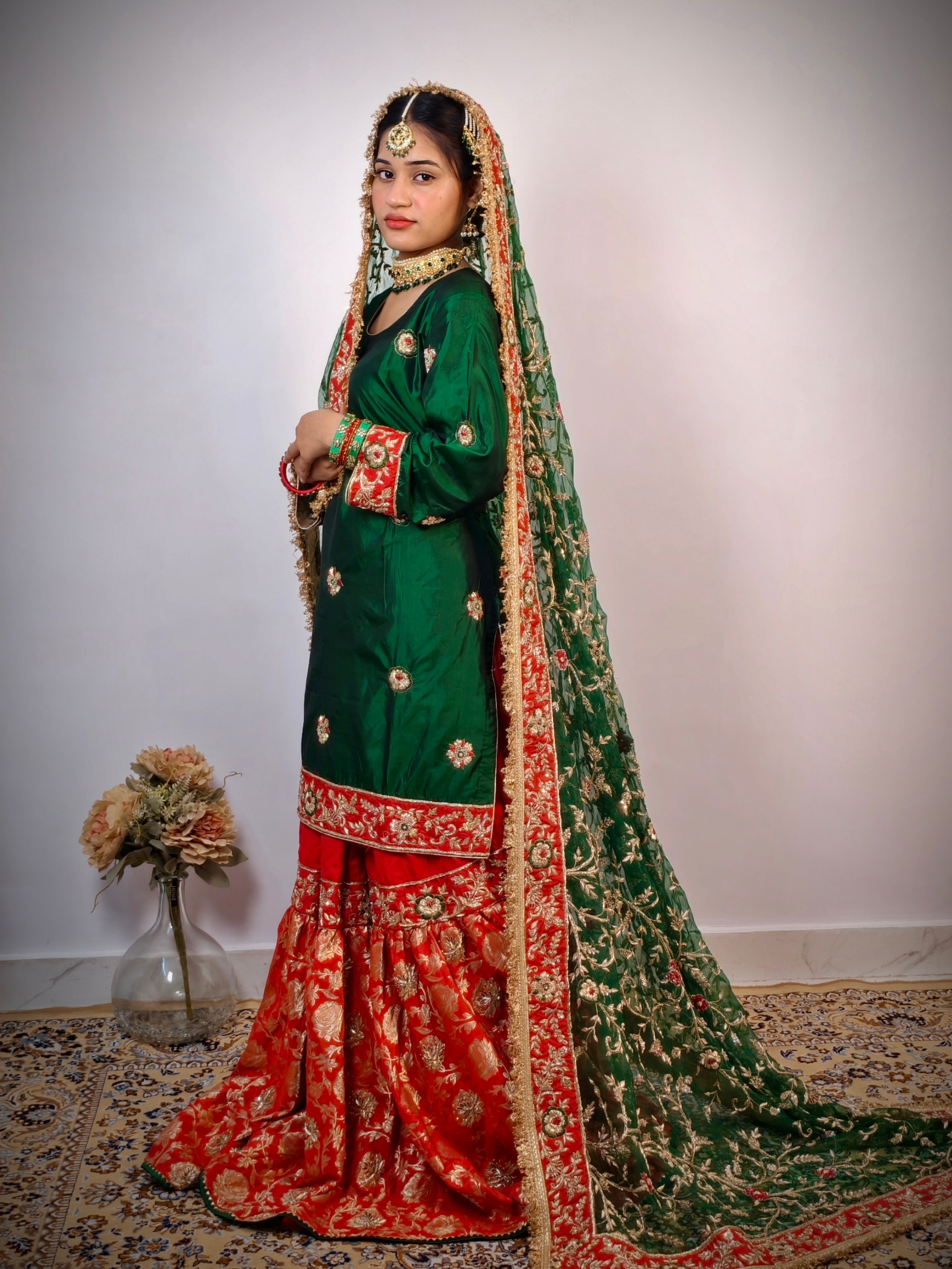 This stunning green and red embroidered gharara set is a true masterpiece, designed for brides and festive occasions. The deep emerald green kameez features intricate zari and resham embroidery, while the rich red gharara showcases gold brocade work, creating a perfect blend of tradition and elegance. The matching green dupatta with golden and red embroidery completes this luxurious outfit, making it ideal for weddings, mehendi, and cultural celebrations.