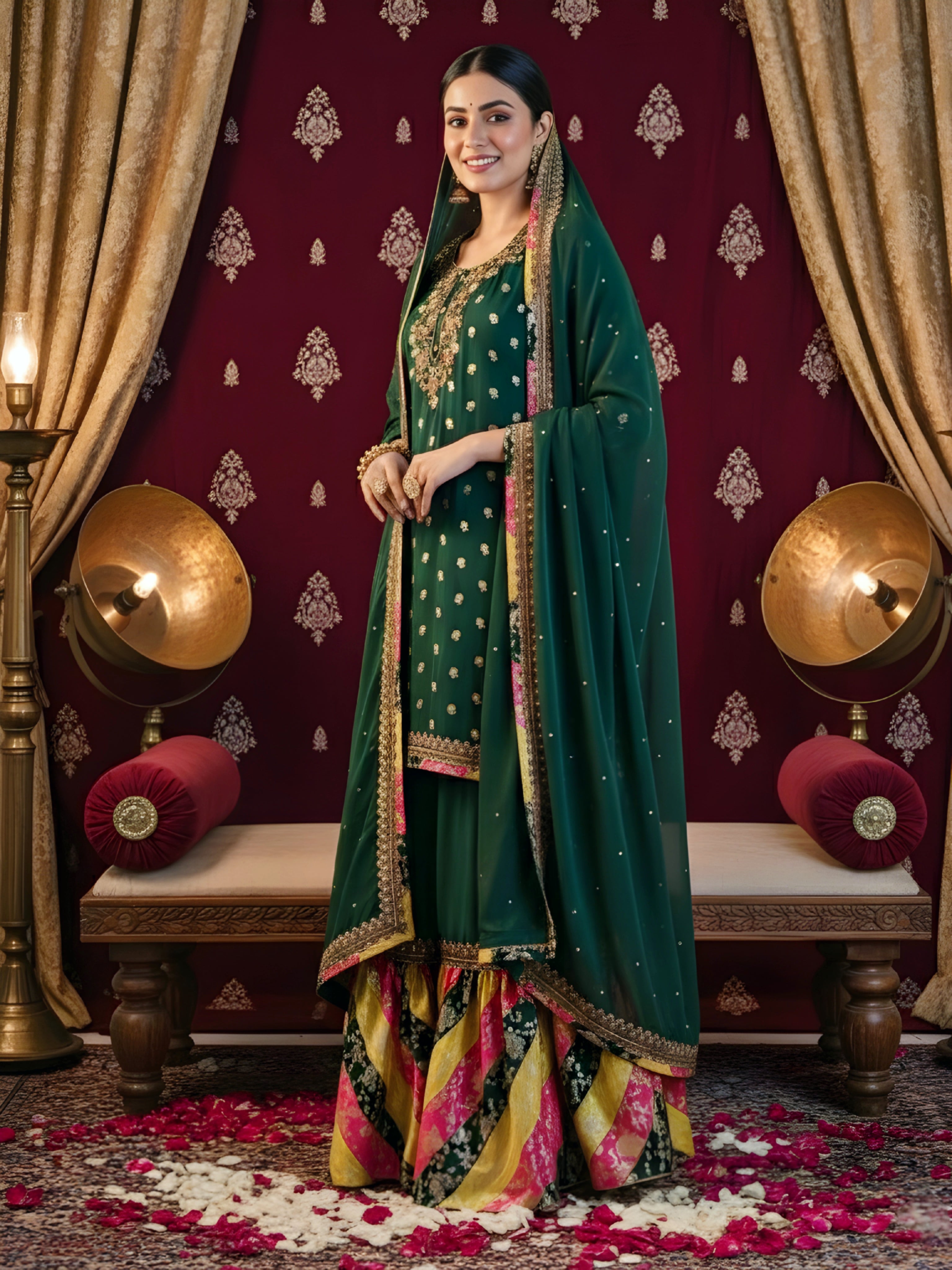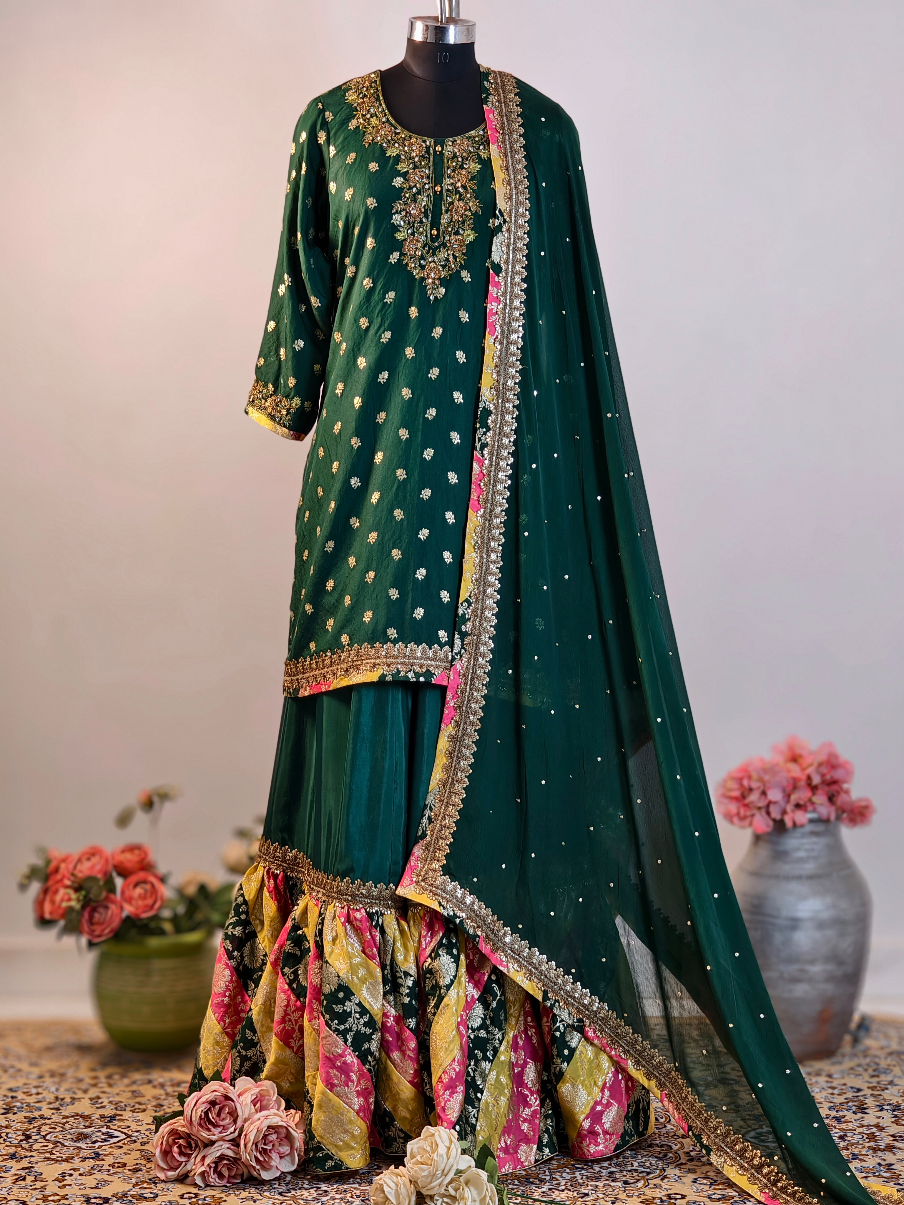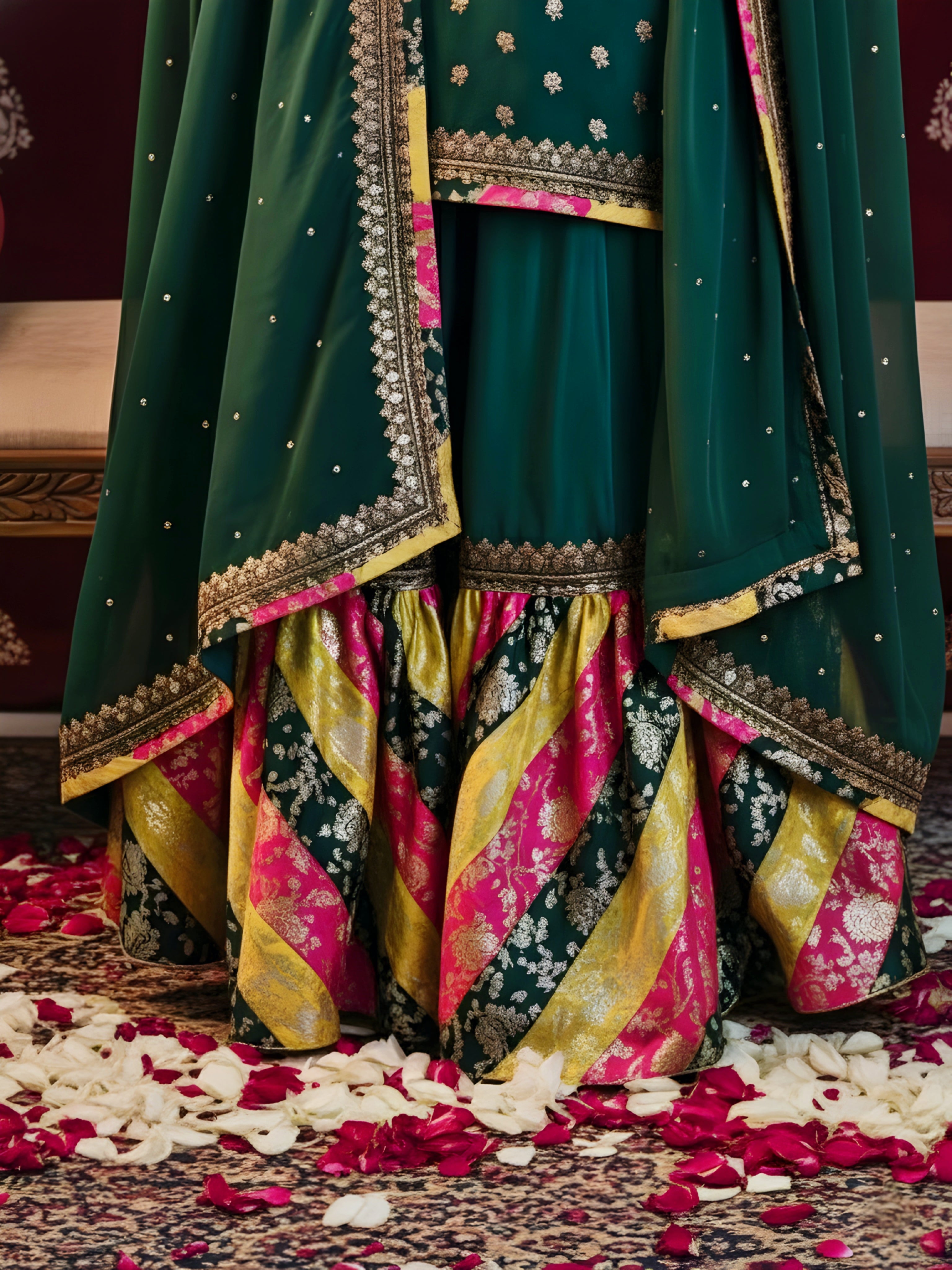 Color Combination: Emerald green base with multicolor gharara flair