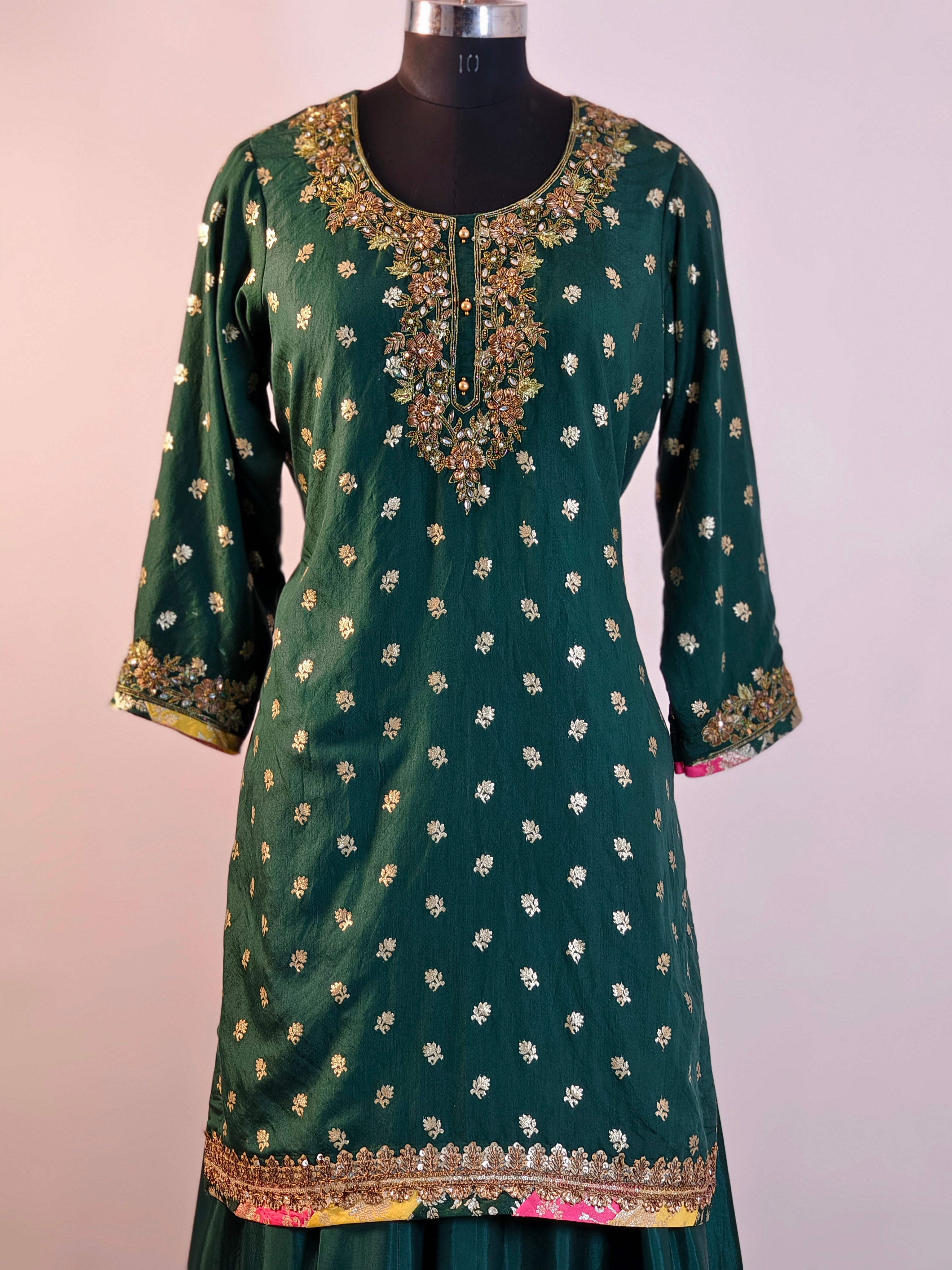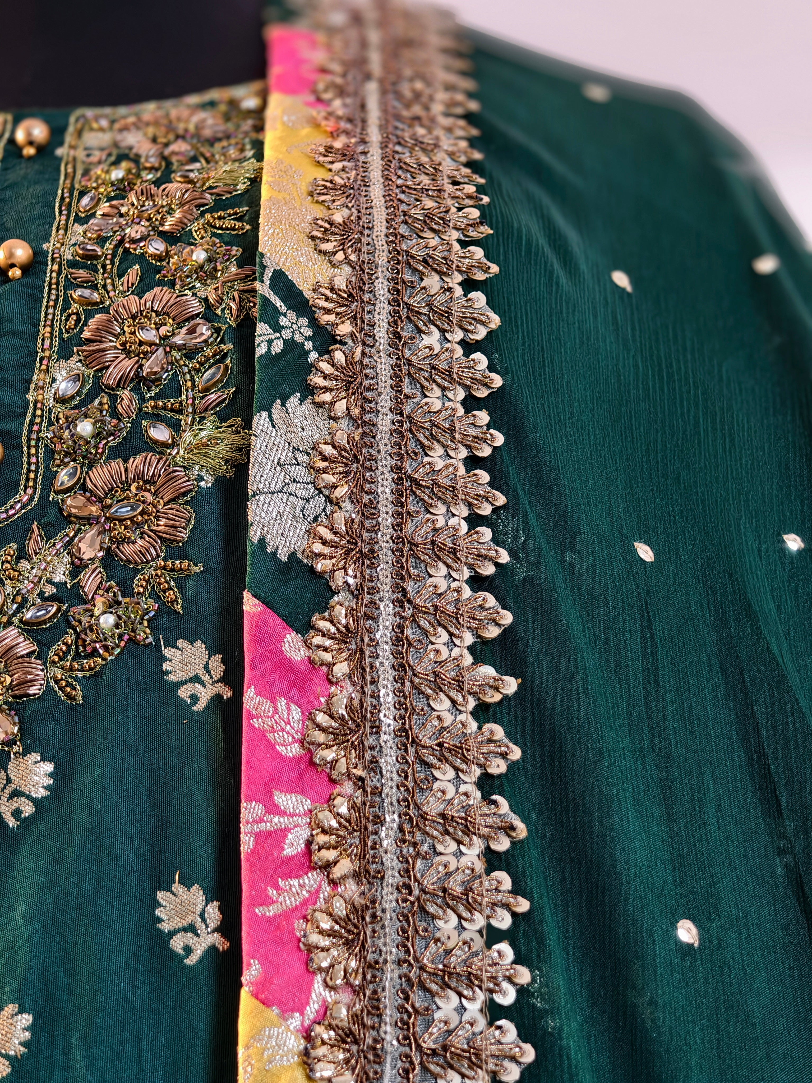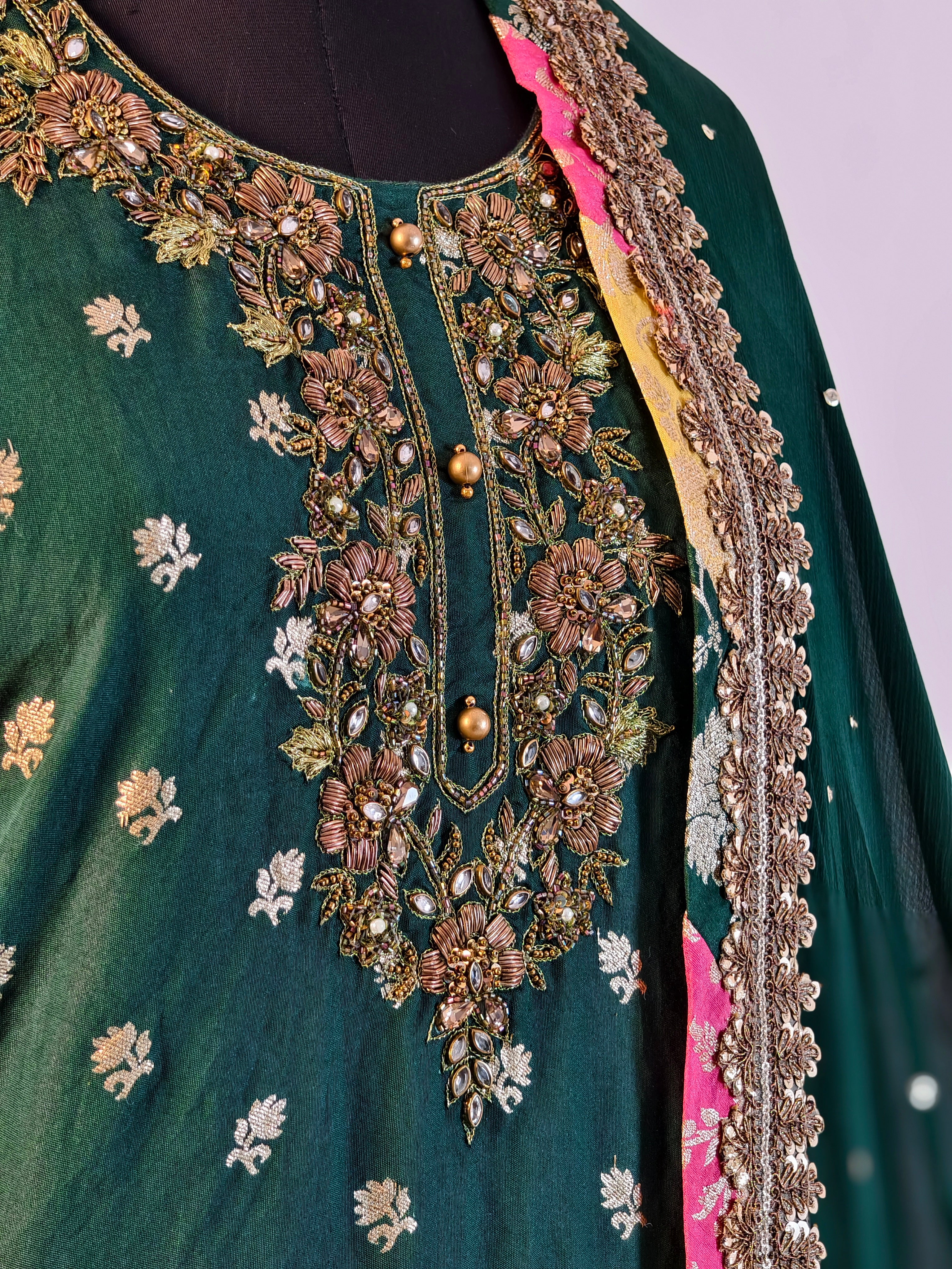Color Combination: Emerald green base with multicolor gharara flair