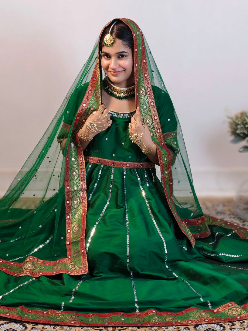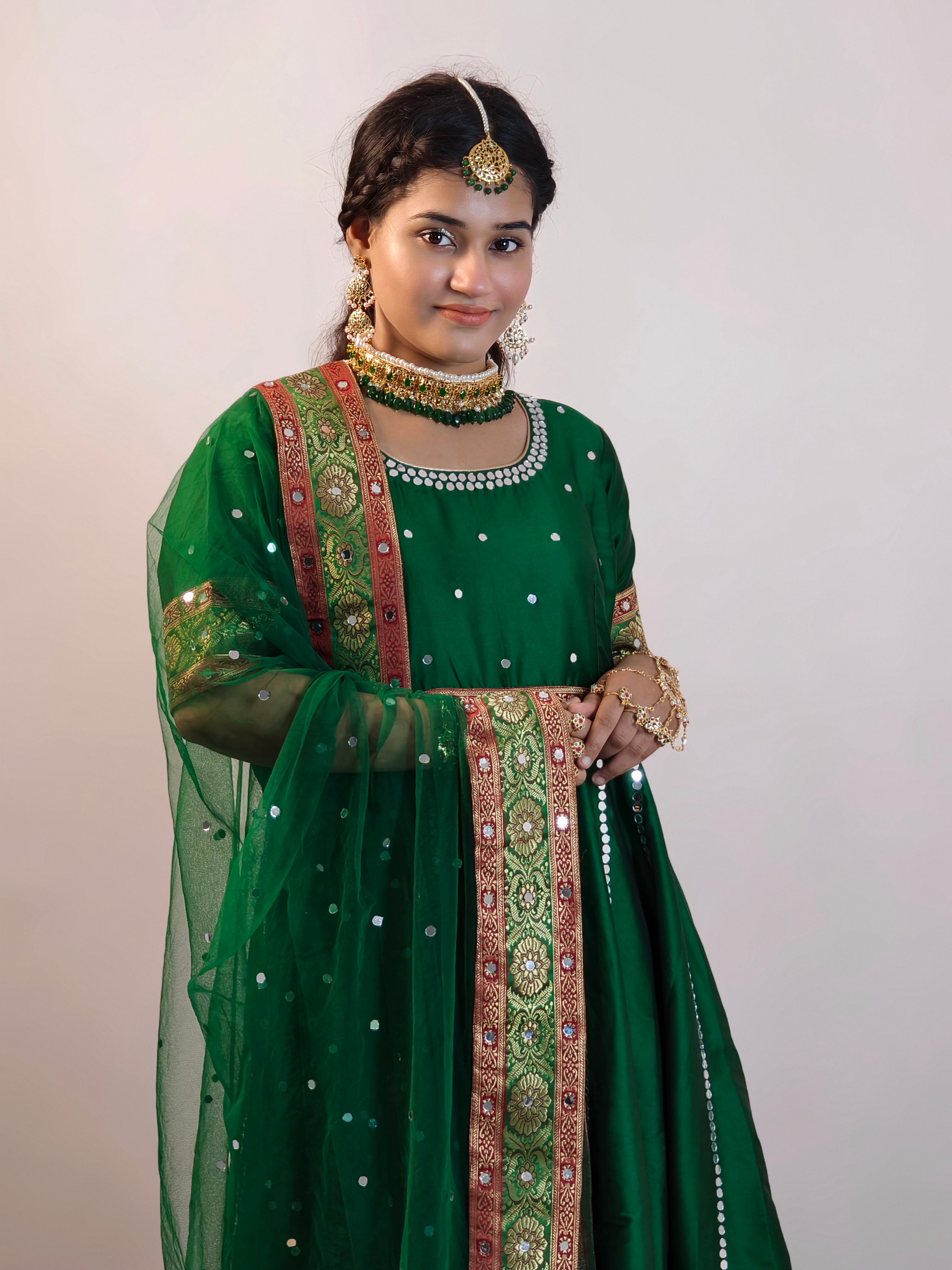 Make an unforgettable entrance in this regal emerald green gown made from luxurious taffeta silk. Designed for the modern woman with a love for traditional charm, this gown features delicate mirror work across the bodice and panels, adding a sparkling finish that catches the light beautifully.