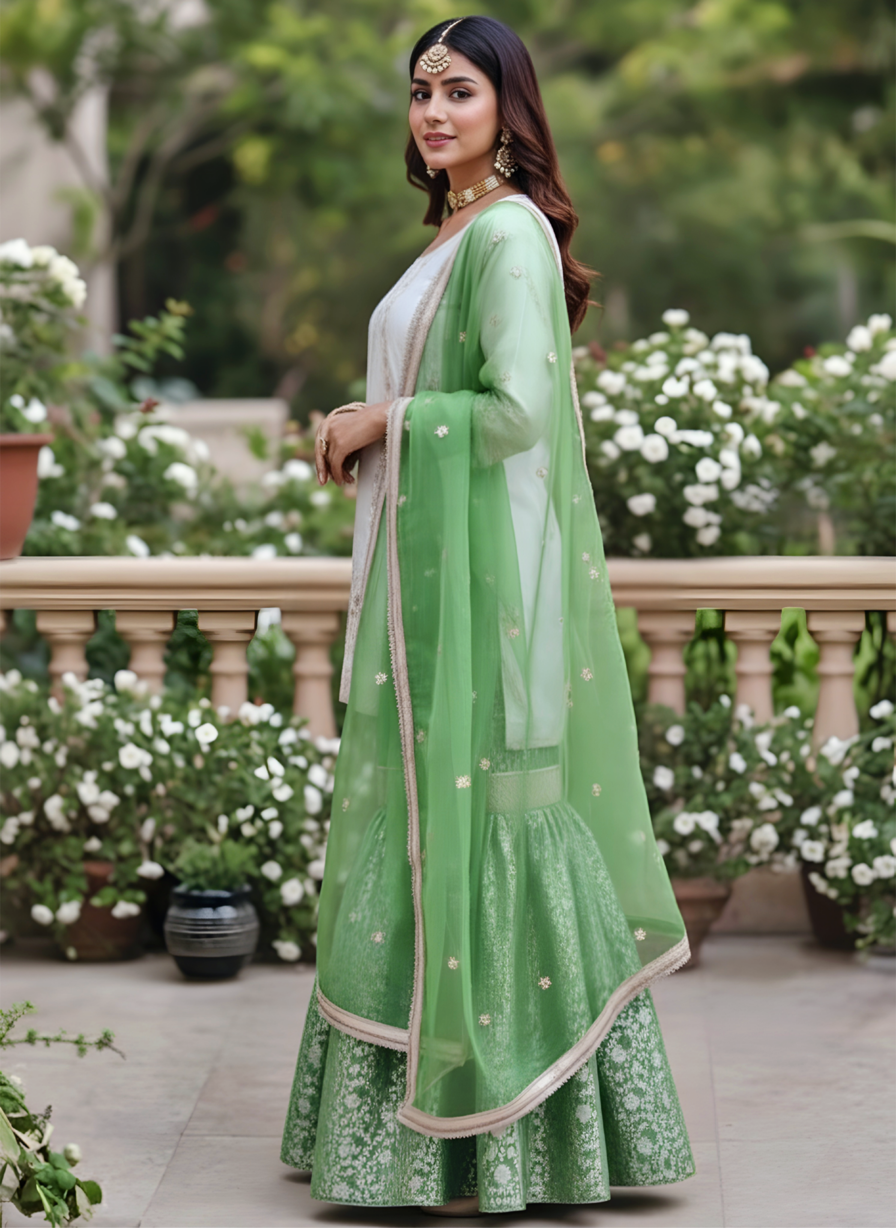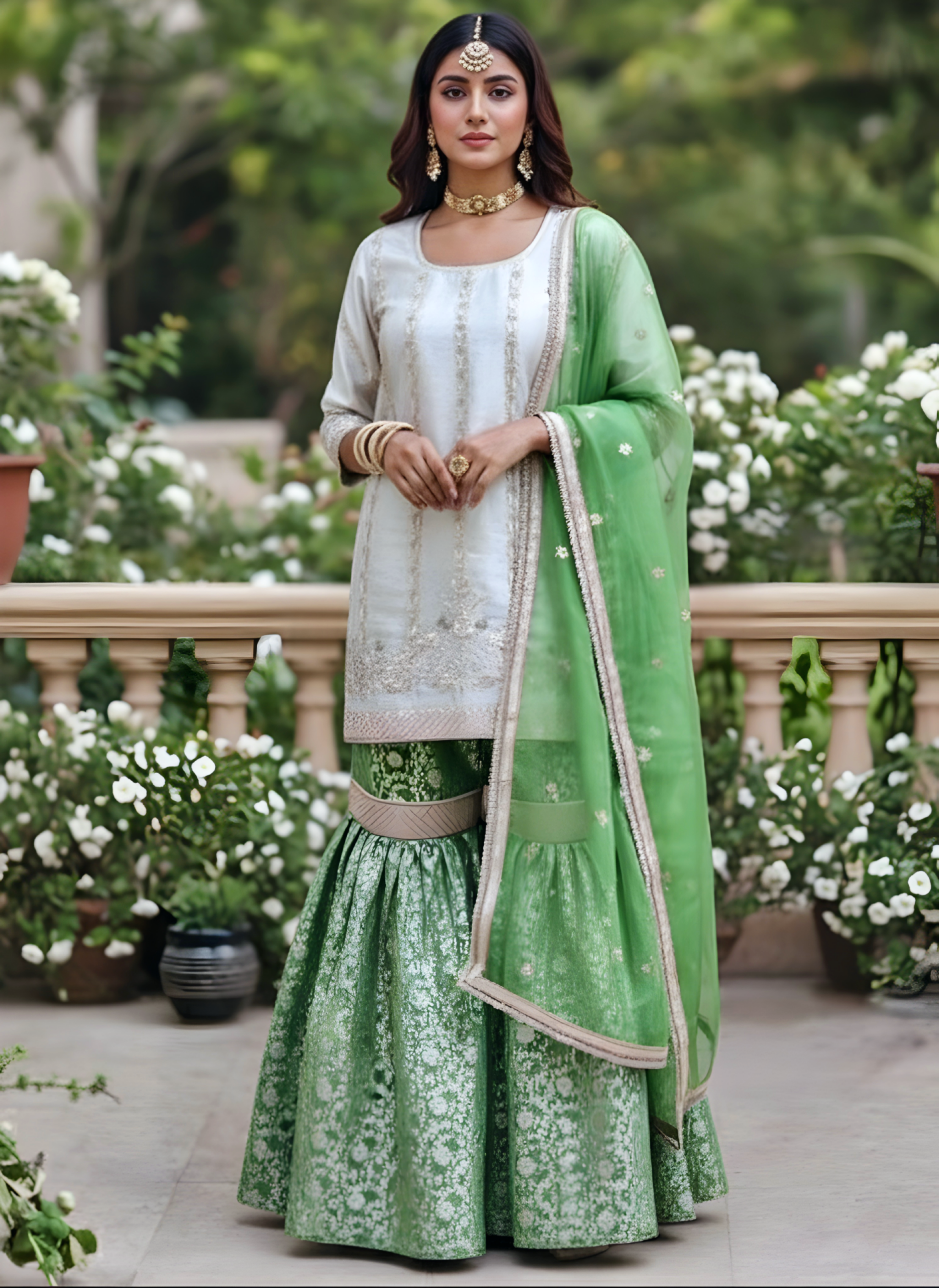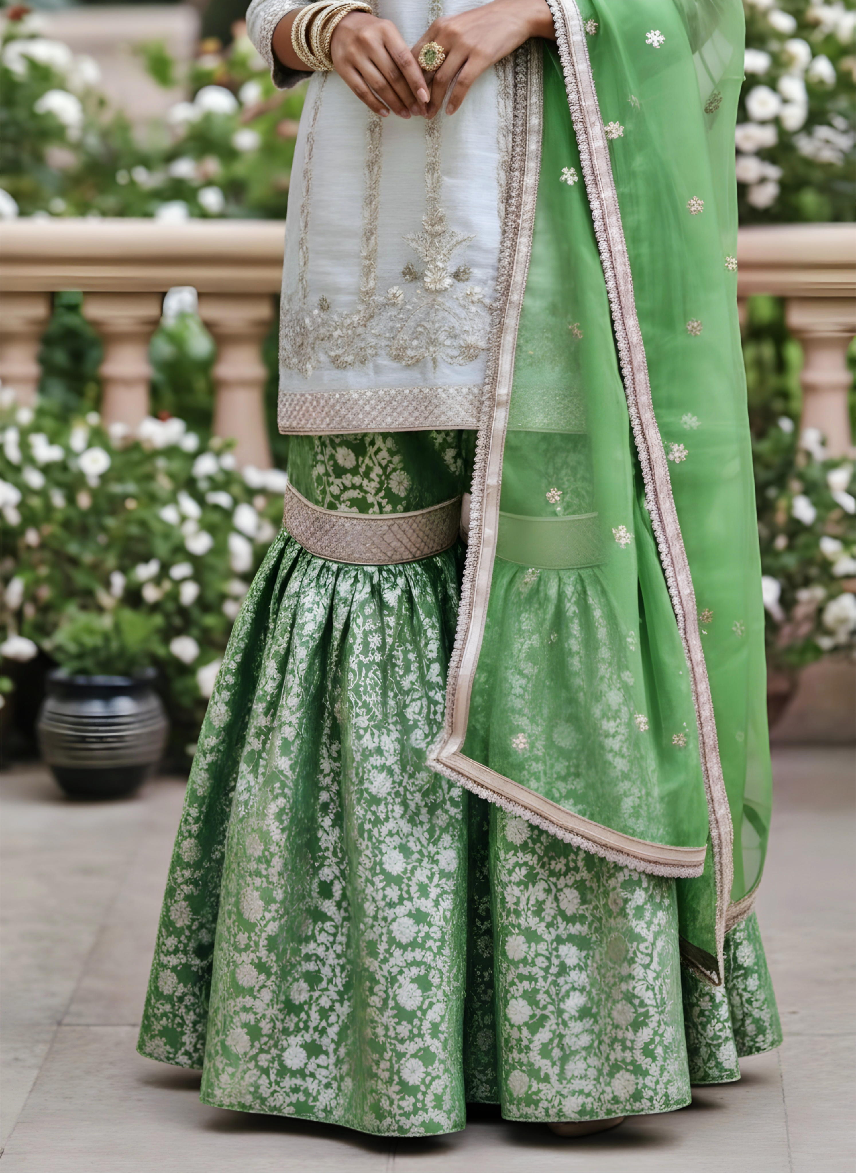 💚 Gharara: Premium Banarasi fabric with handcrafted dabka, zardozi, and resham work border
