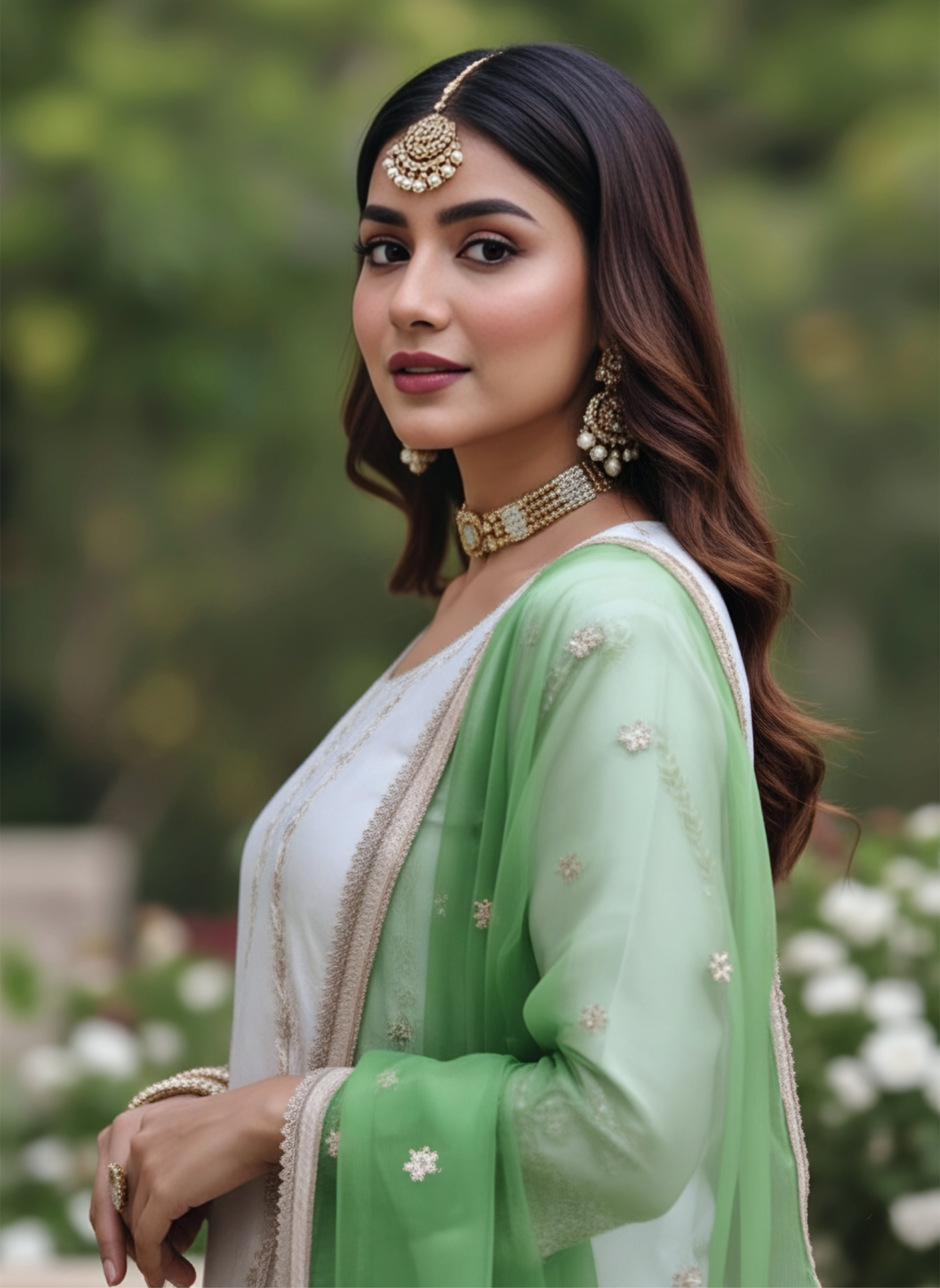 💚 Dupatta: Lightweight organza with buti work, pearls, and intricate dabka-zardozi border embroidery