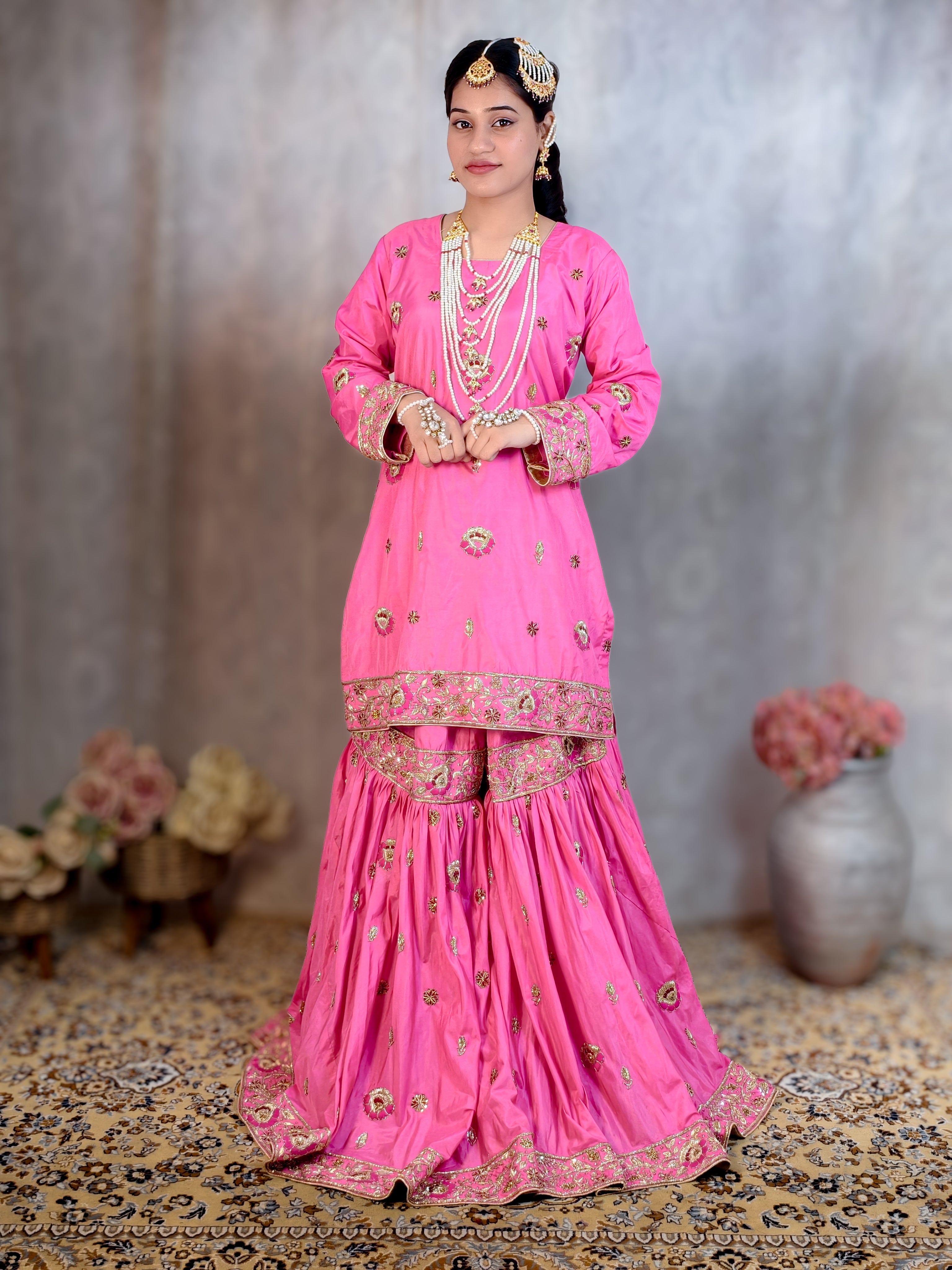 Gharara: Luxurious silk with handcrafted embellishments and heavy Dabka Zardozi border work.