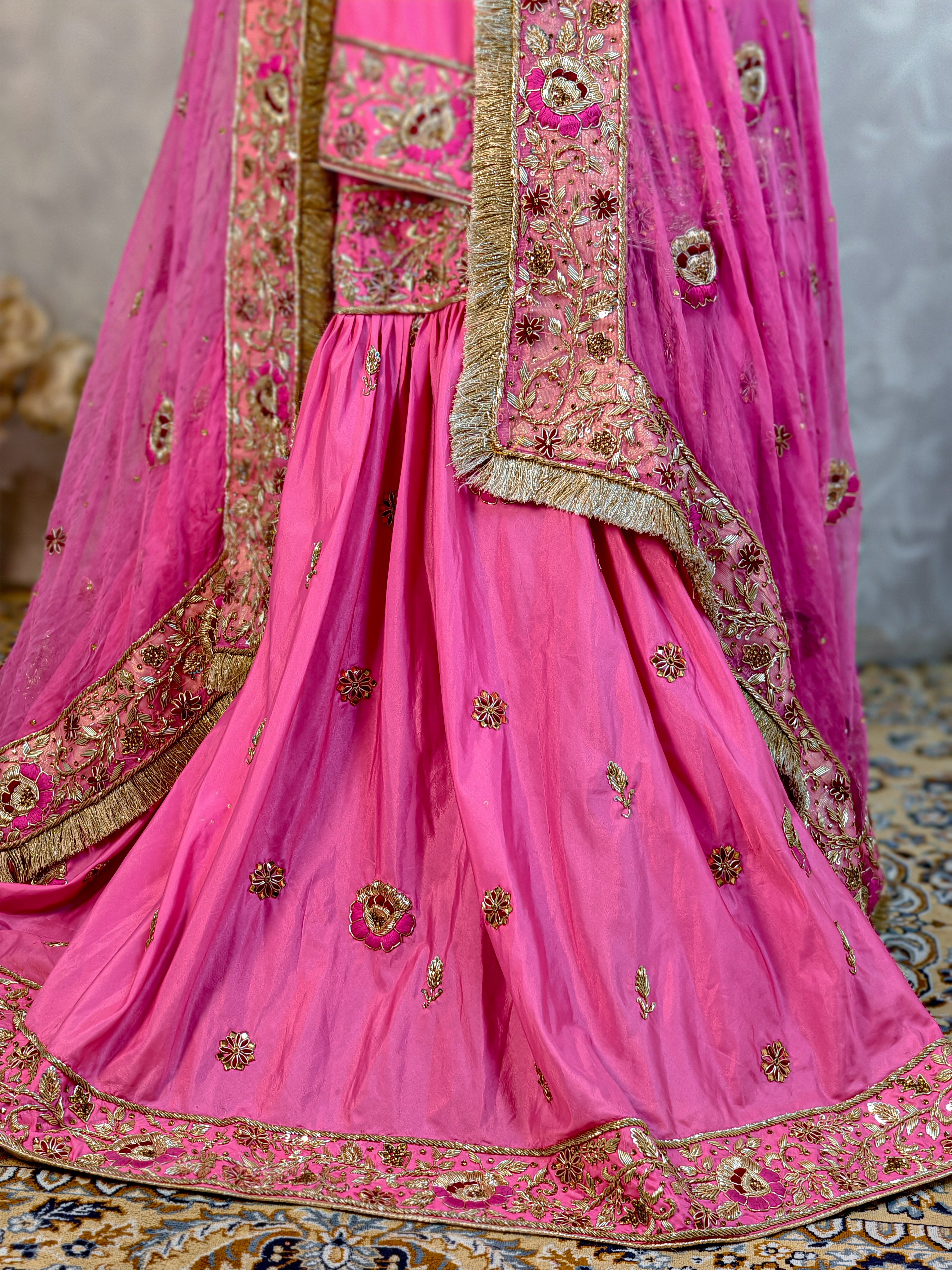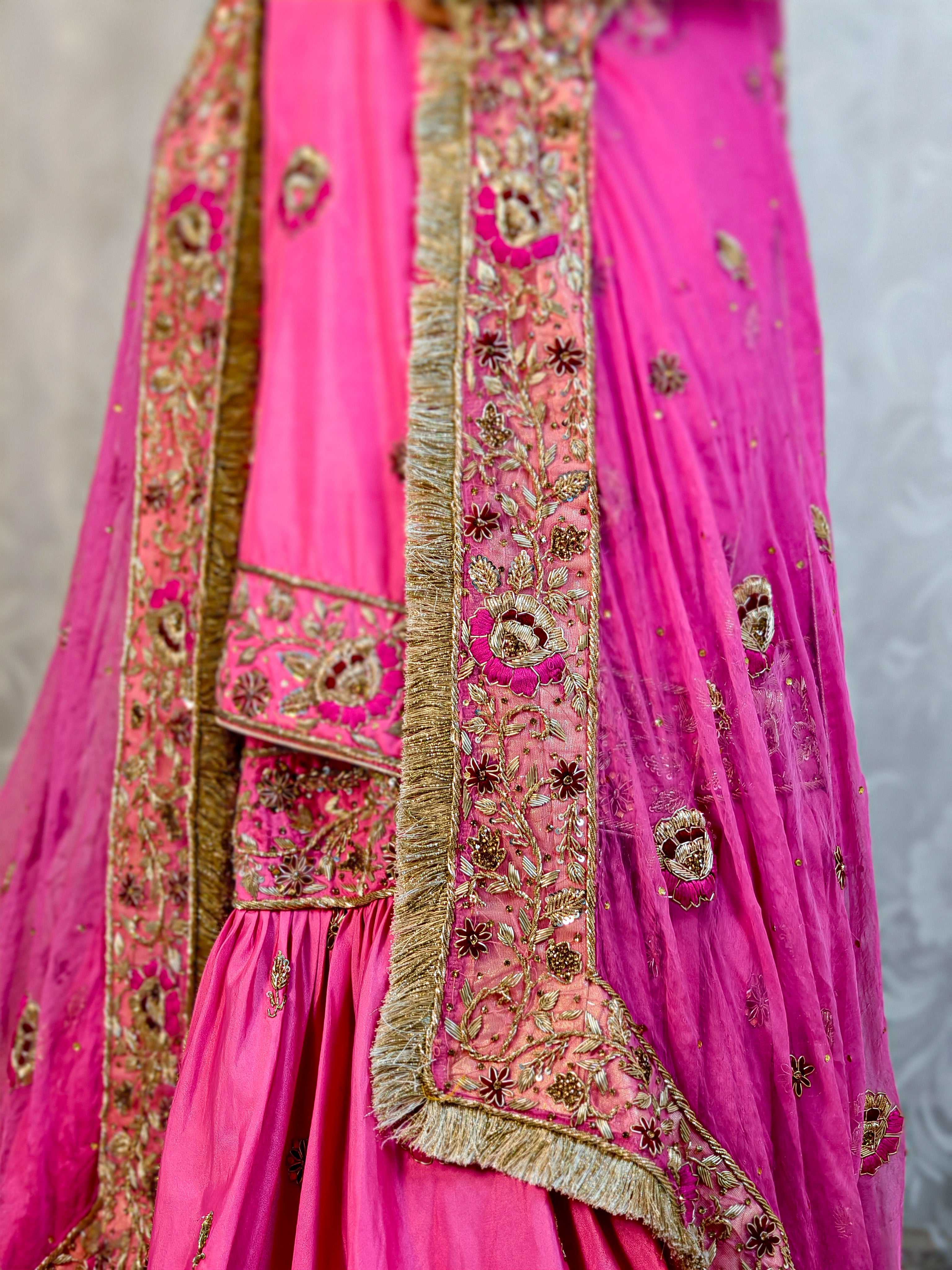 💖 Vibrant Hot Pink Kameez – Rich silk fabric with heavy golden embroidery and zardozi work.