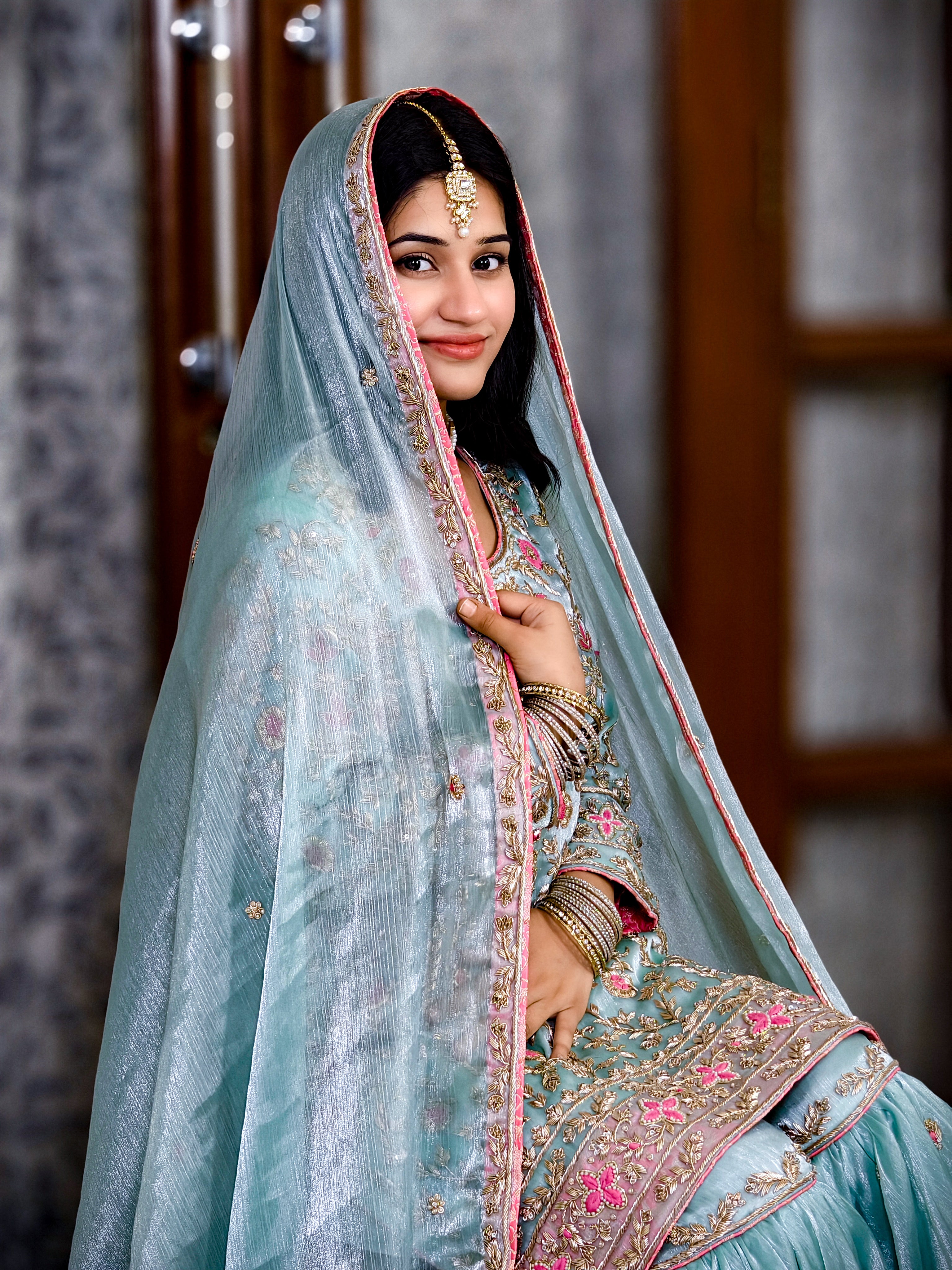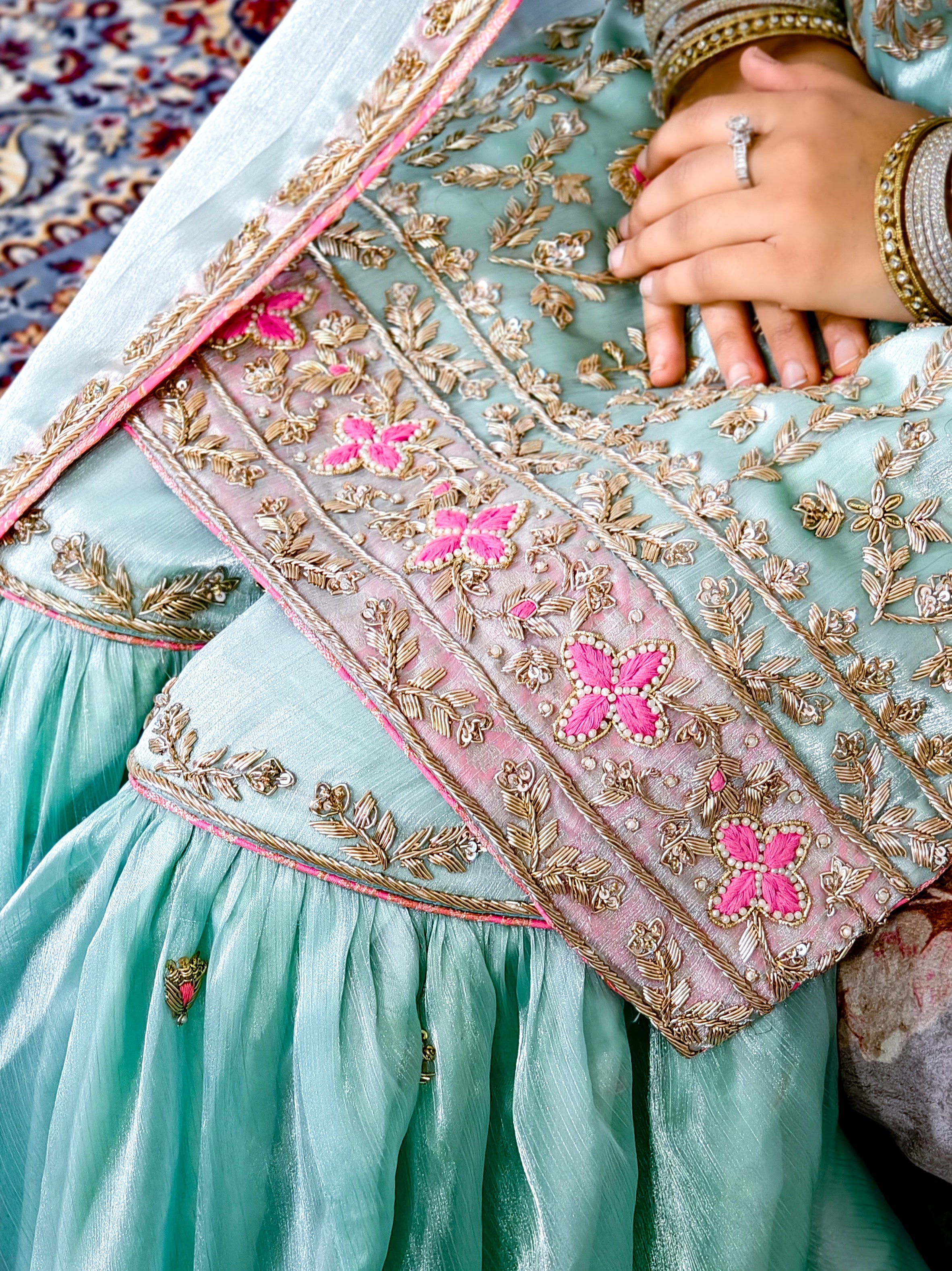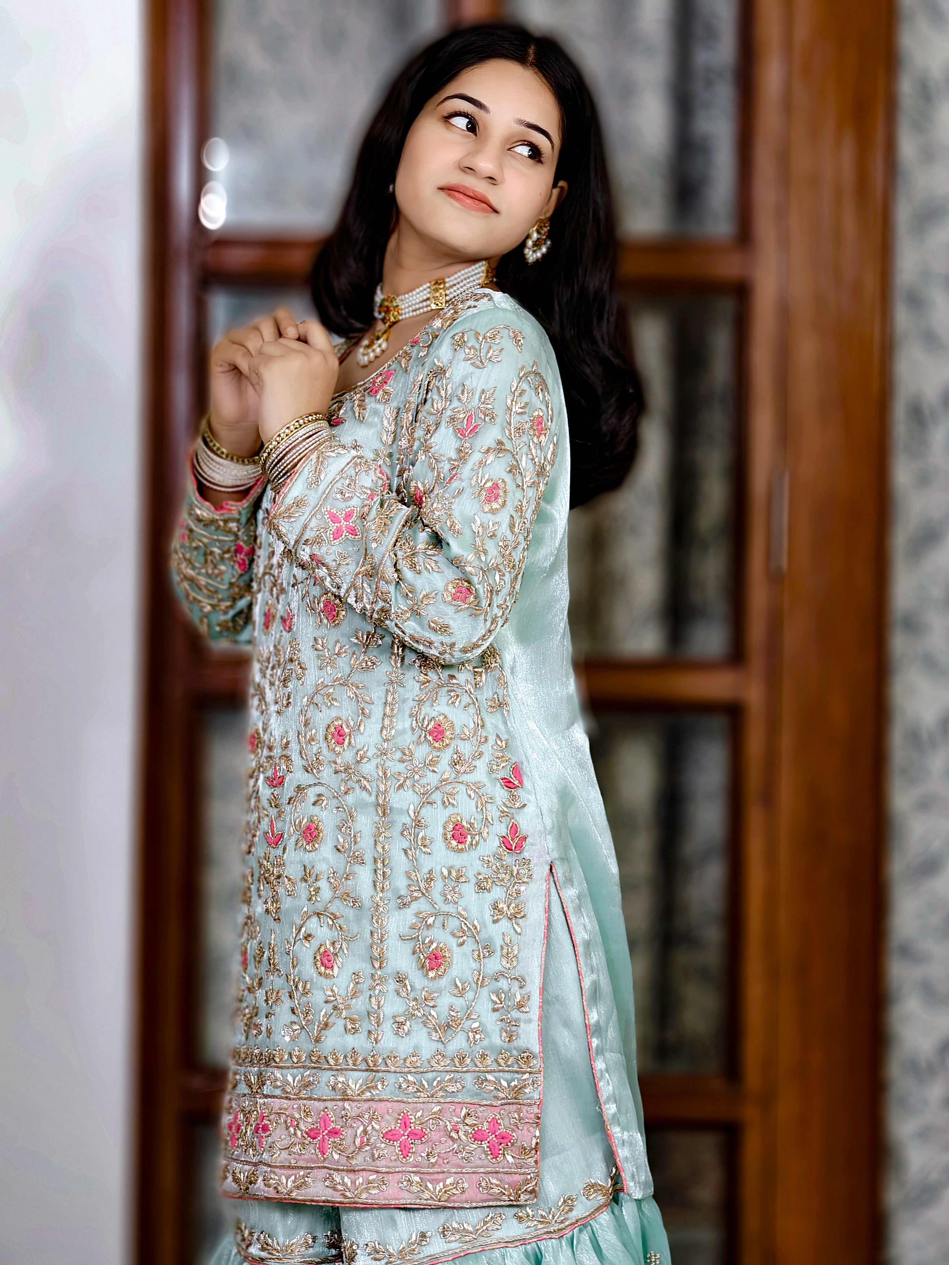 Grace meets tradition in this breathtaking ice blue gharara set, handcrafted on luxurious organza fabric. Perfect for weddings, festive occasions, or intimate family functions, this ensemble reflects timeless elegance through its rich embroidery and dreamy pastel hue.