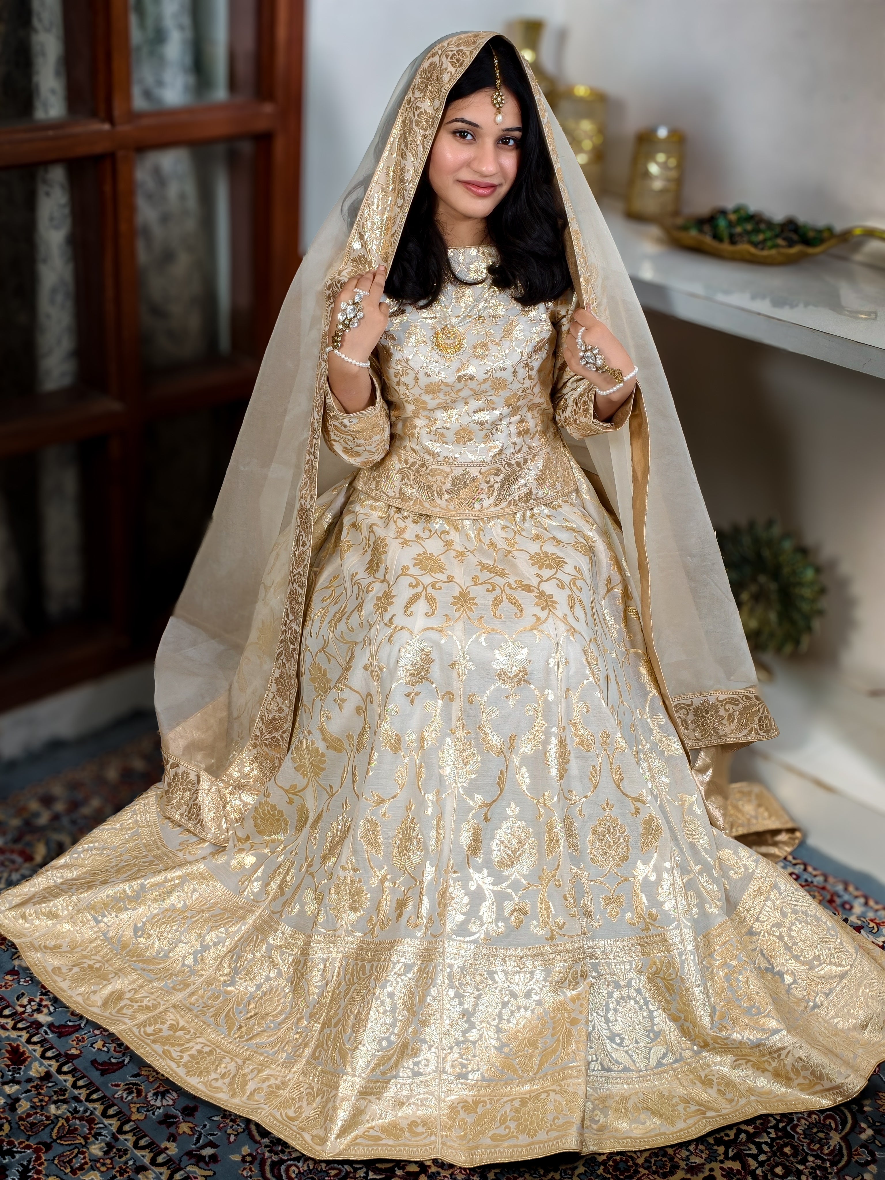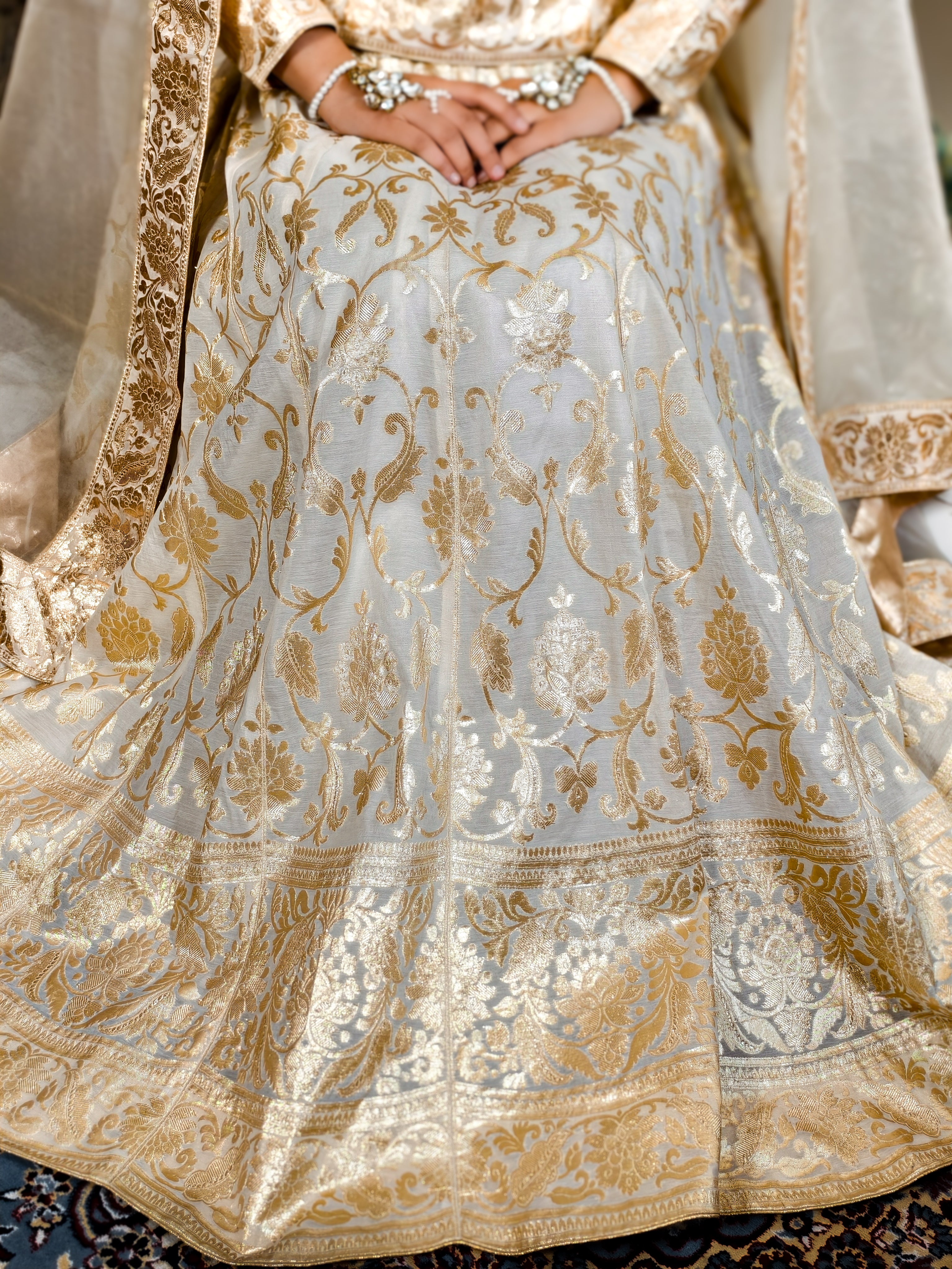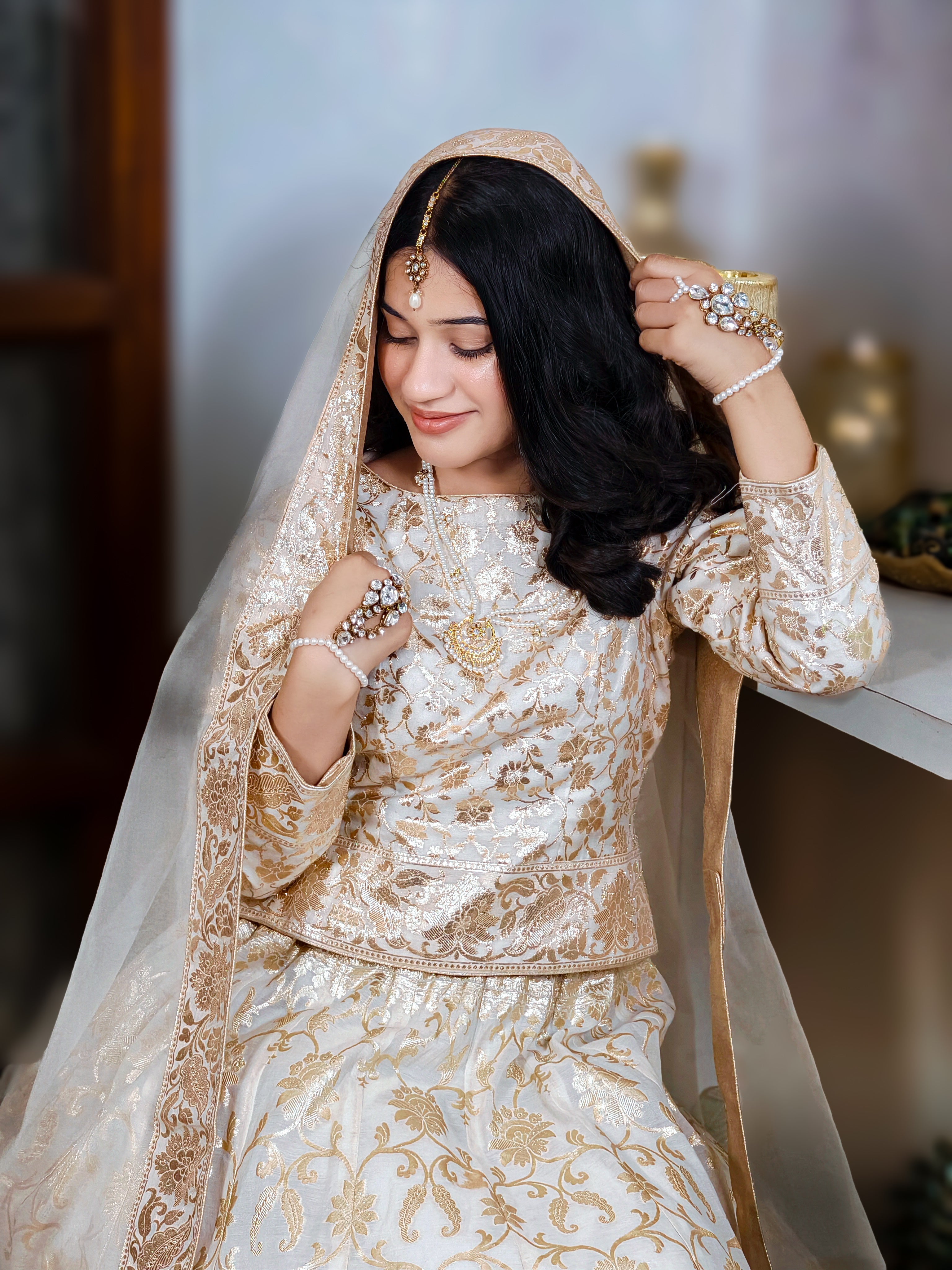 Drape yourself in elegance and grace with this stunning ivory and gold lehenga kurti set. Perfect for nikkah, walima, bridal wear, and festive occasions, this outfit blends traditional craftsmanship with contemporary sophistication. The ivory kurti is adorned with delicate gold zari embroidery, complementing the exquisitely designed lehenga with intricate banarasi brocade patterns. A sheer golden dupatta with embroidered lace borders completes this ethereal ensemble, making it a luxurious choice for any bride or wedding guest.