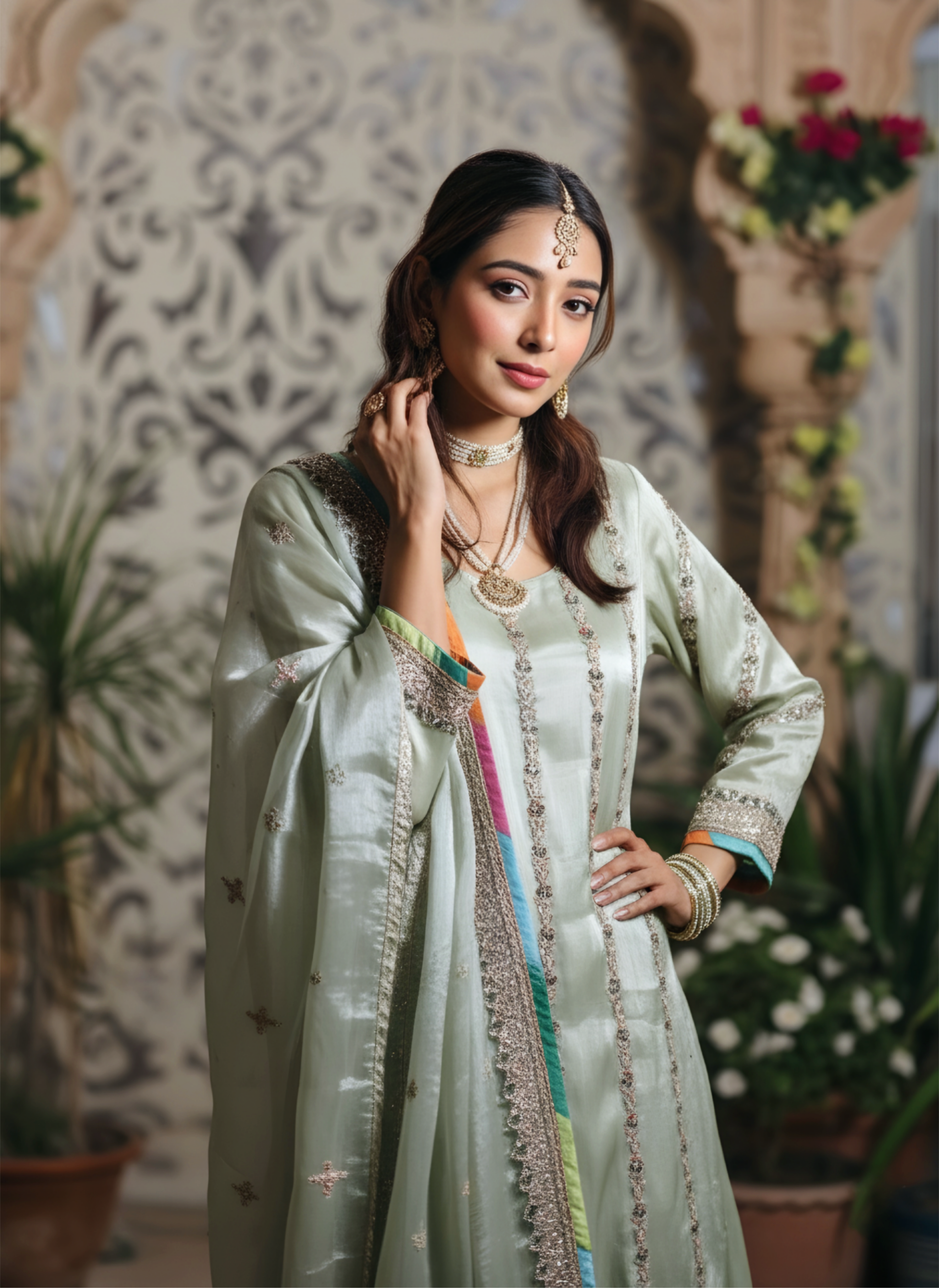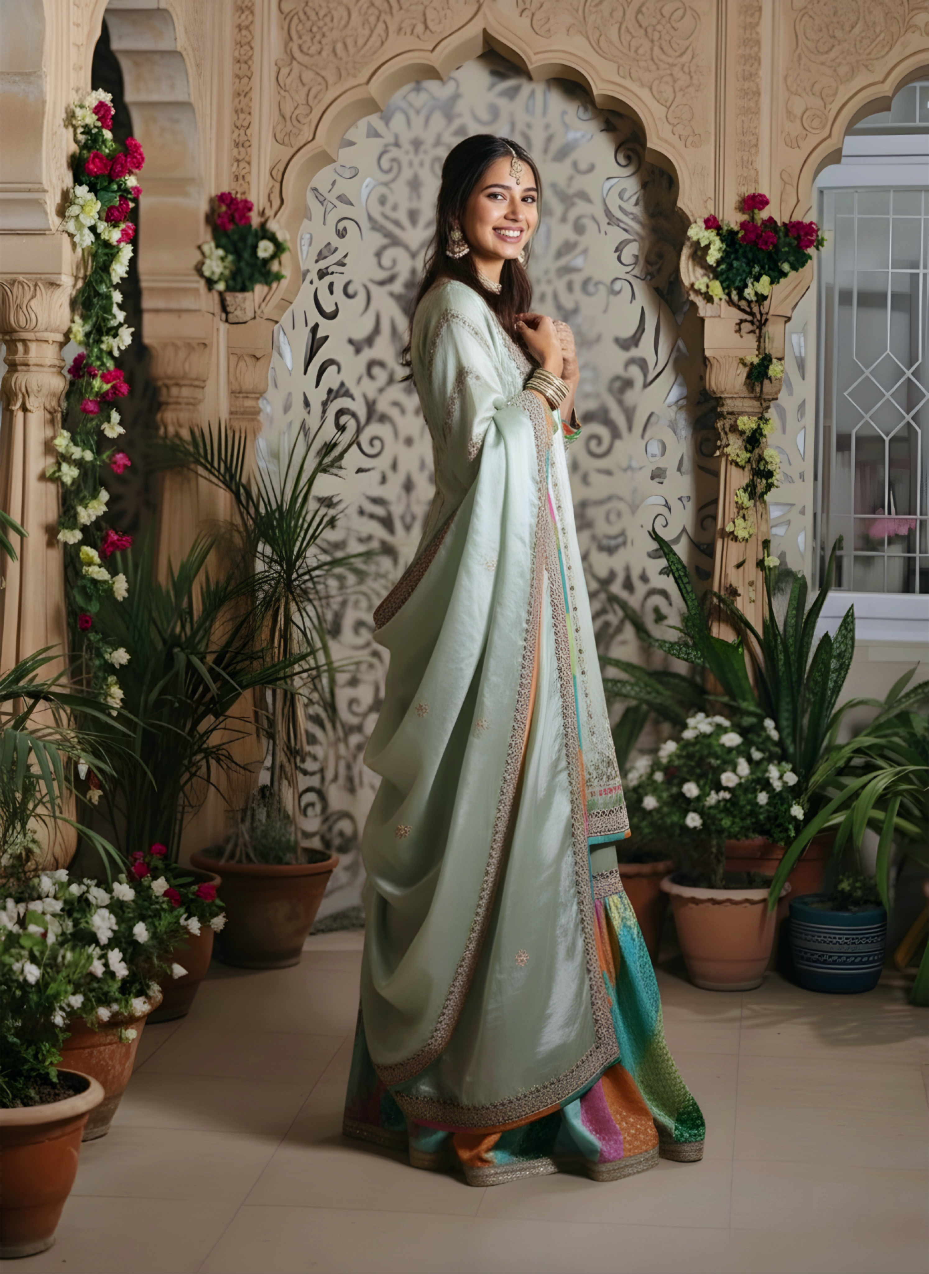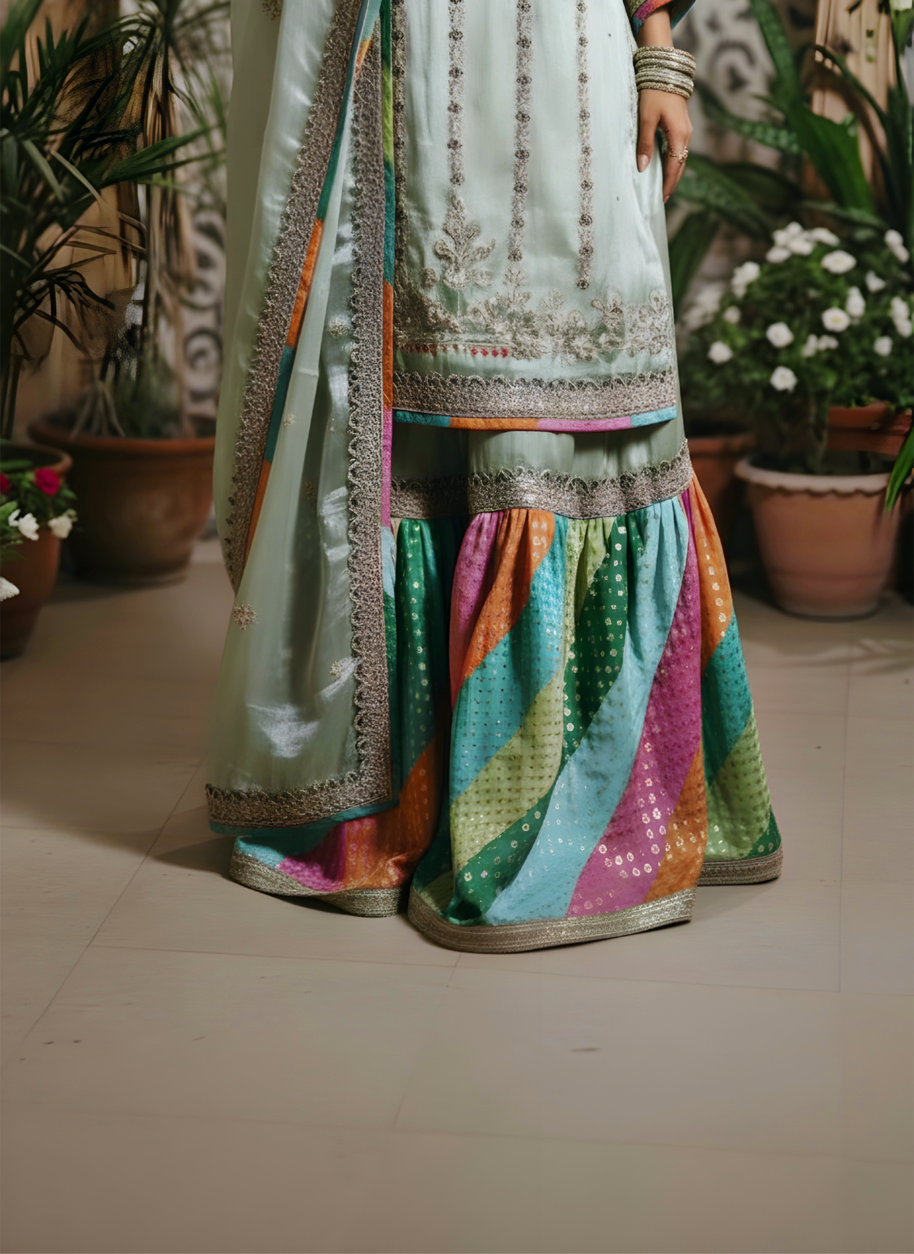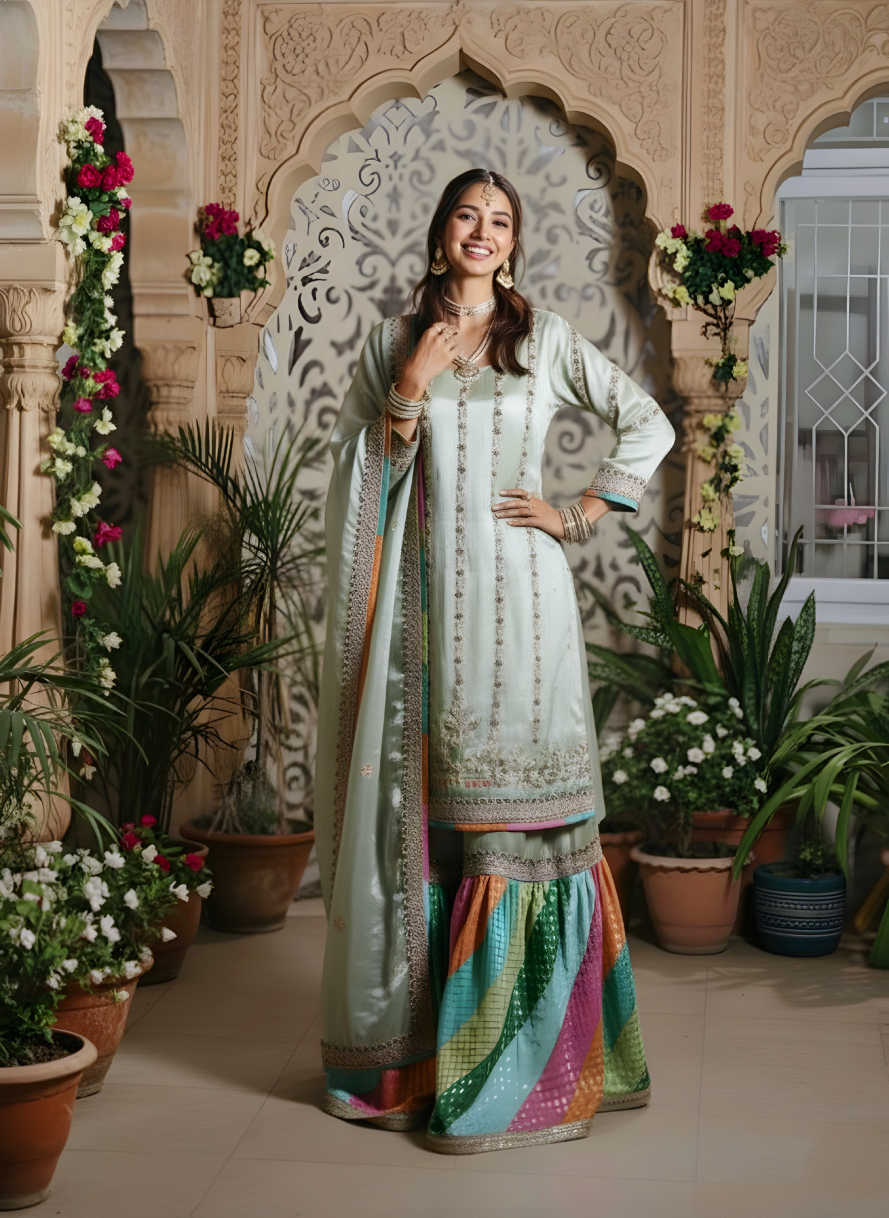Drape yourself in sheer elegance with our Luxury Handcrafted Pastel Green & Multicolor Chatapati Gharara Set, a perfect fusion of traditional artistry and modern sophistication. Adorned with intricate zari embroidery, pearl embellishments, and delicate sequins, this exquisite ensemble is designed to elevate your bridal and festive wardrobe. The pastel green base with multicolor accents adds a regal touch, making it an ideal choice for weddings, mehendi functions, and grand celebrations.