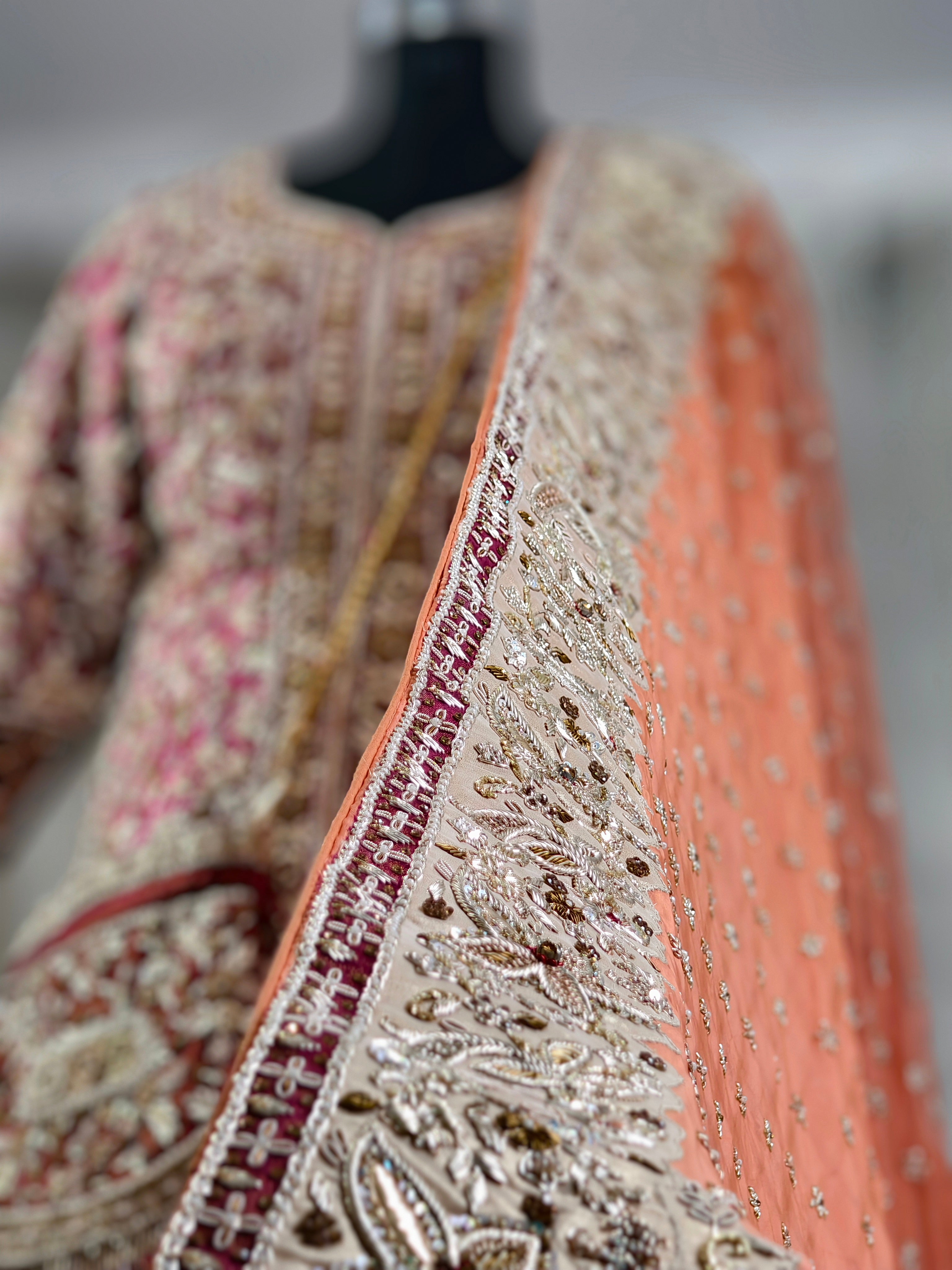 Dupatta: Peach net with four-sided zardozi border and all-over buti work