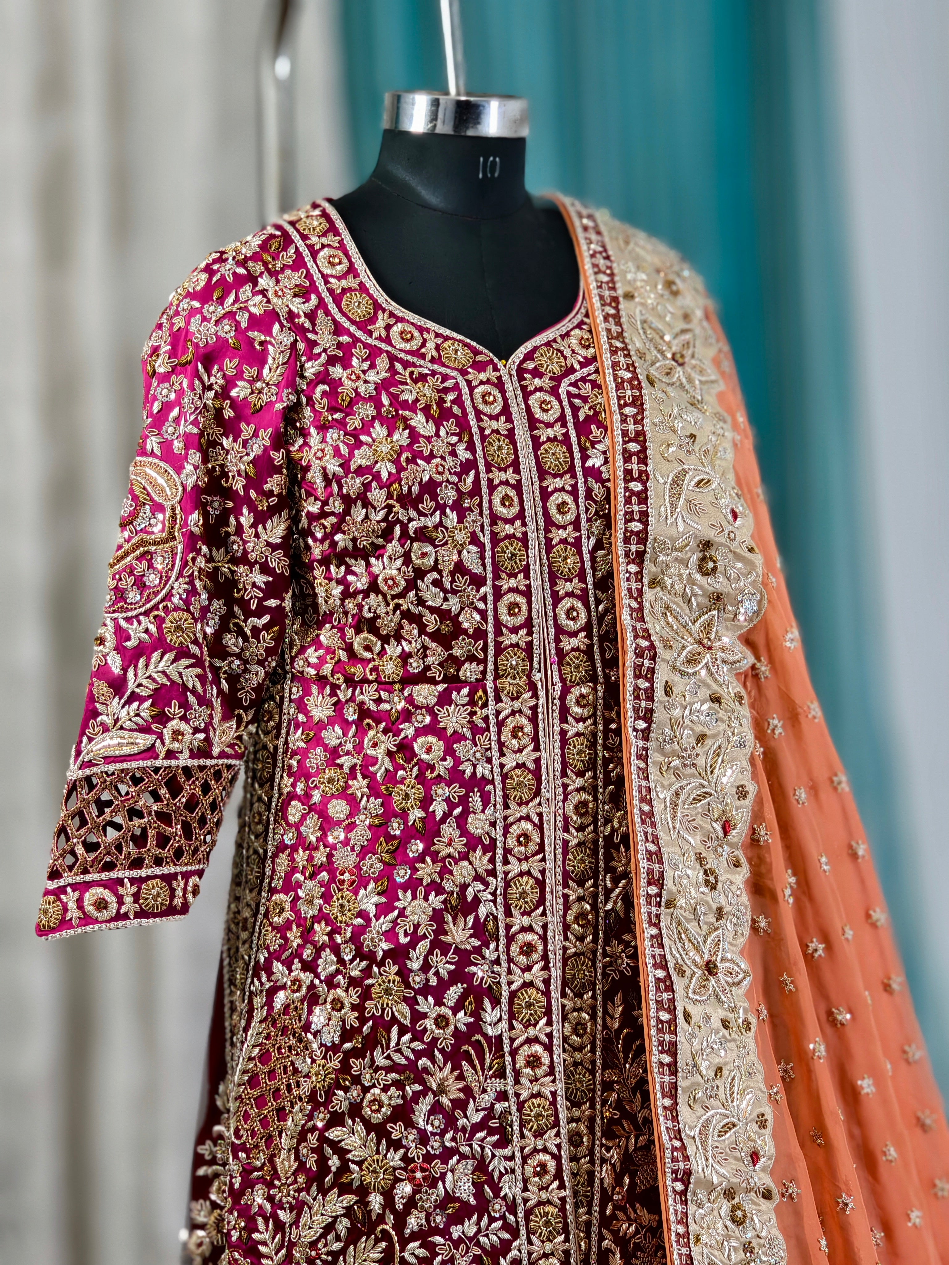 Step into timeless elegance with this royal farshi gharara set designed for weddings and grand celebrations. The long kameez is richly adorned with handcrafted dabka zardozi embroidery, featuring traditional floral and vine patterns. The luxurious farshi gharara, with its extended trail and rich flare, is detailed with delicate buti work, making it ideal for dramatic bridal looks. The outfit is completed with a peach dupatta crafted from fine net, bordered with heavy zardozi lace and scattered buti embroidery all over — creating a perfect blend of richness, grace, and heritage.