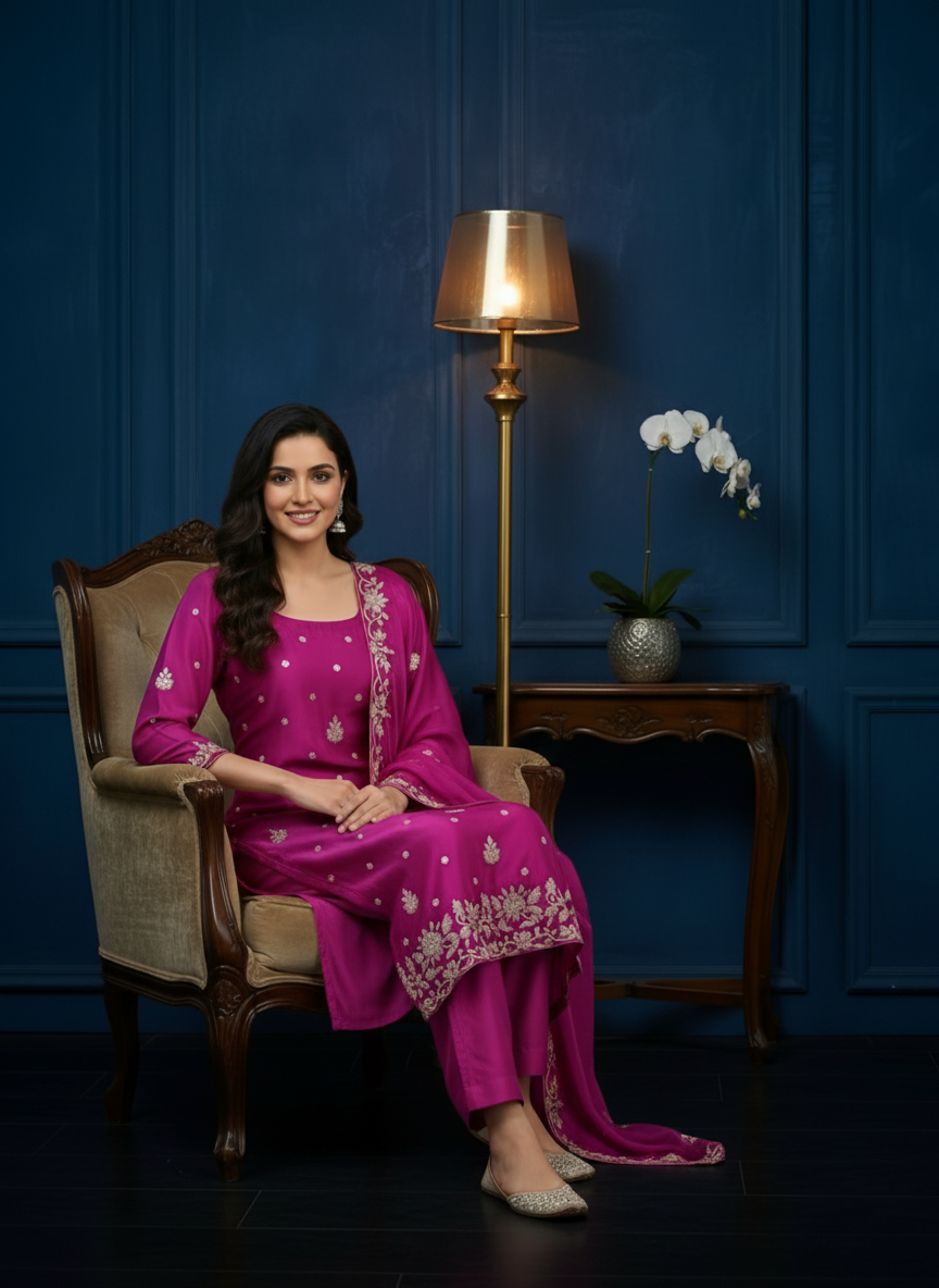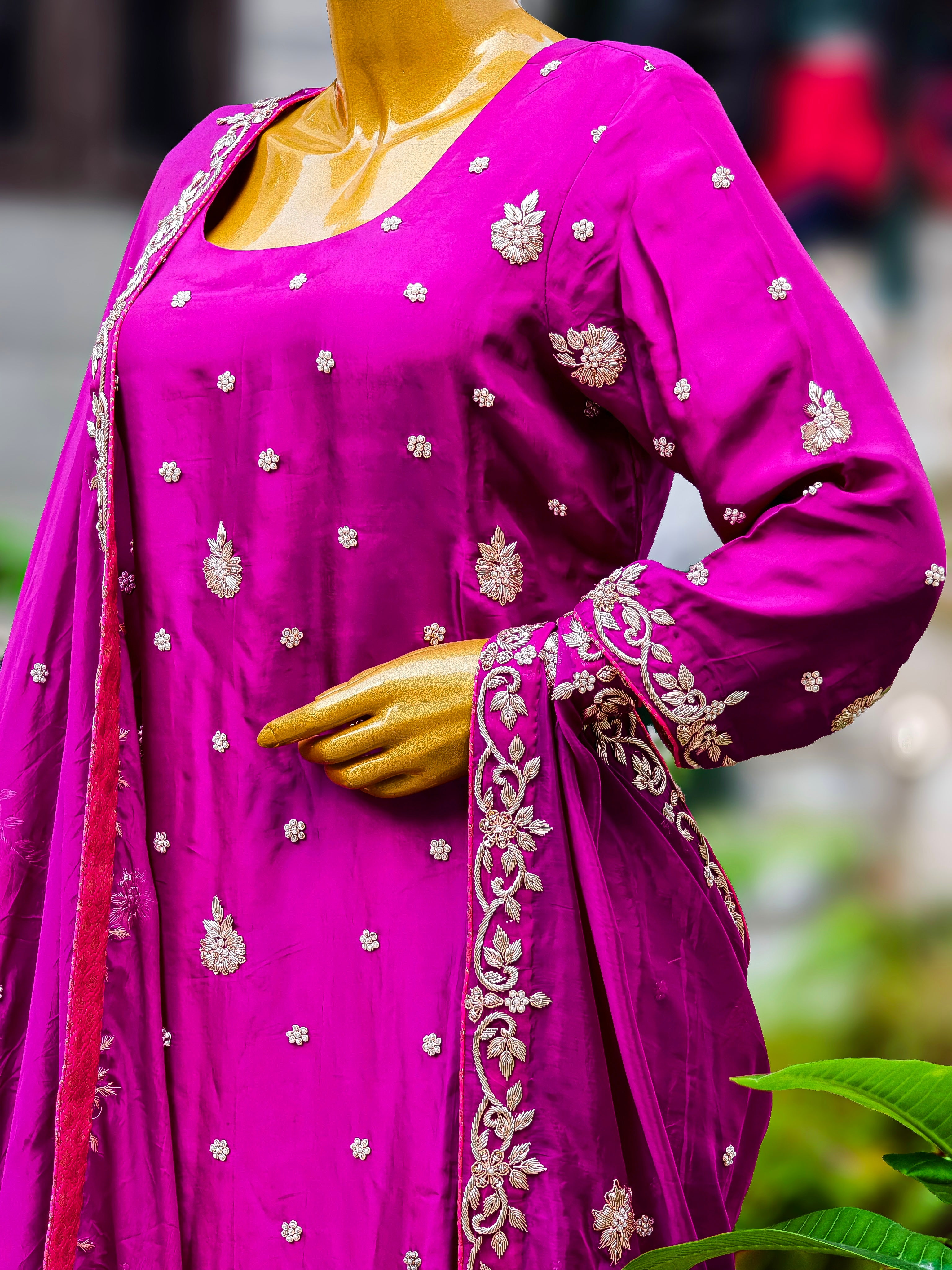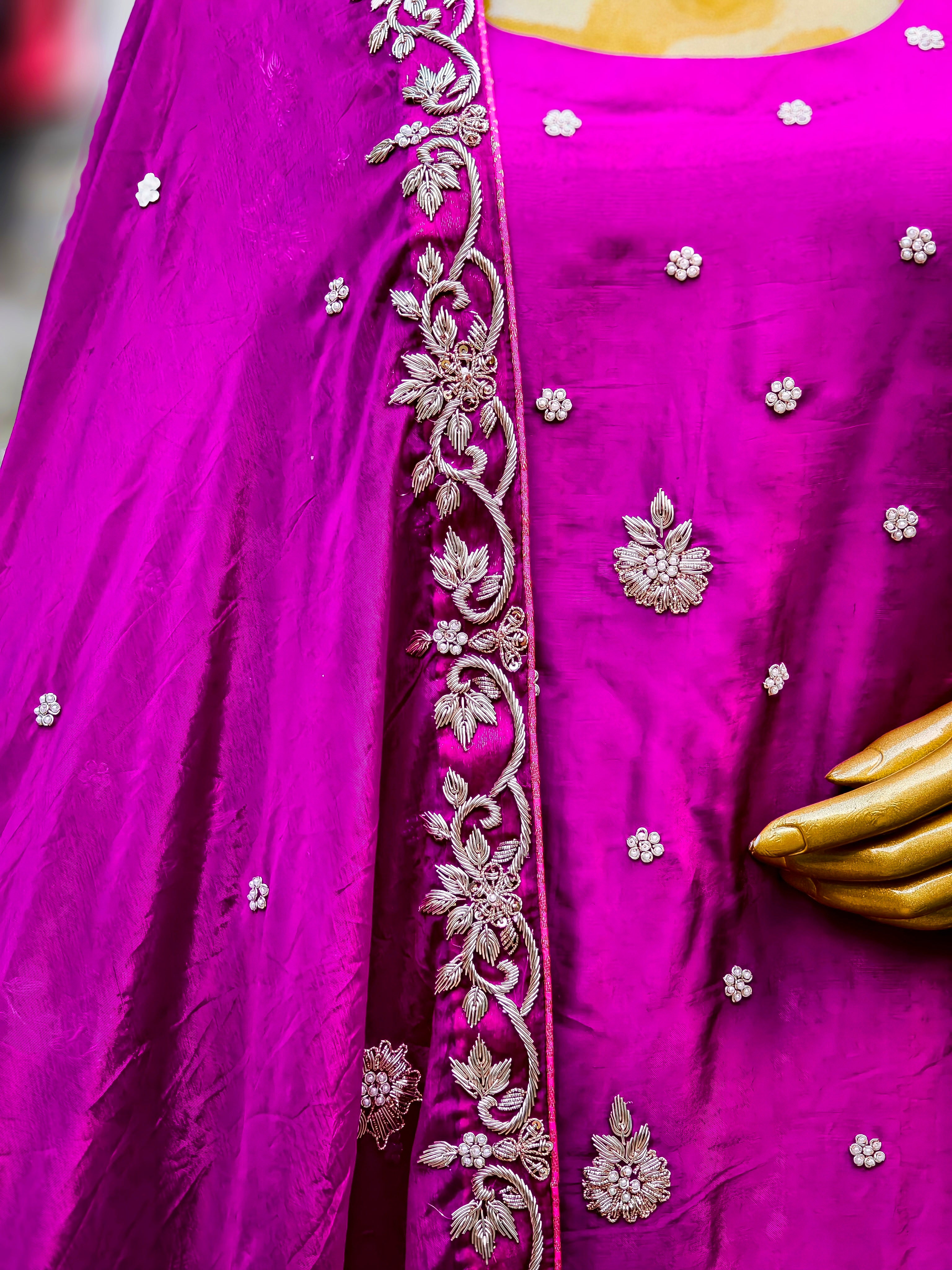 Step into timeless elegance with this purple Upada silk suit, crafted with exquisite dabka and zardozi embroidery. The deep royal purple color adds sophistication, while the intricate handwork enhances its regal charm.