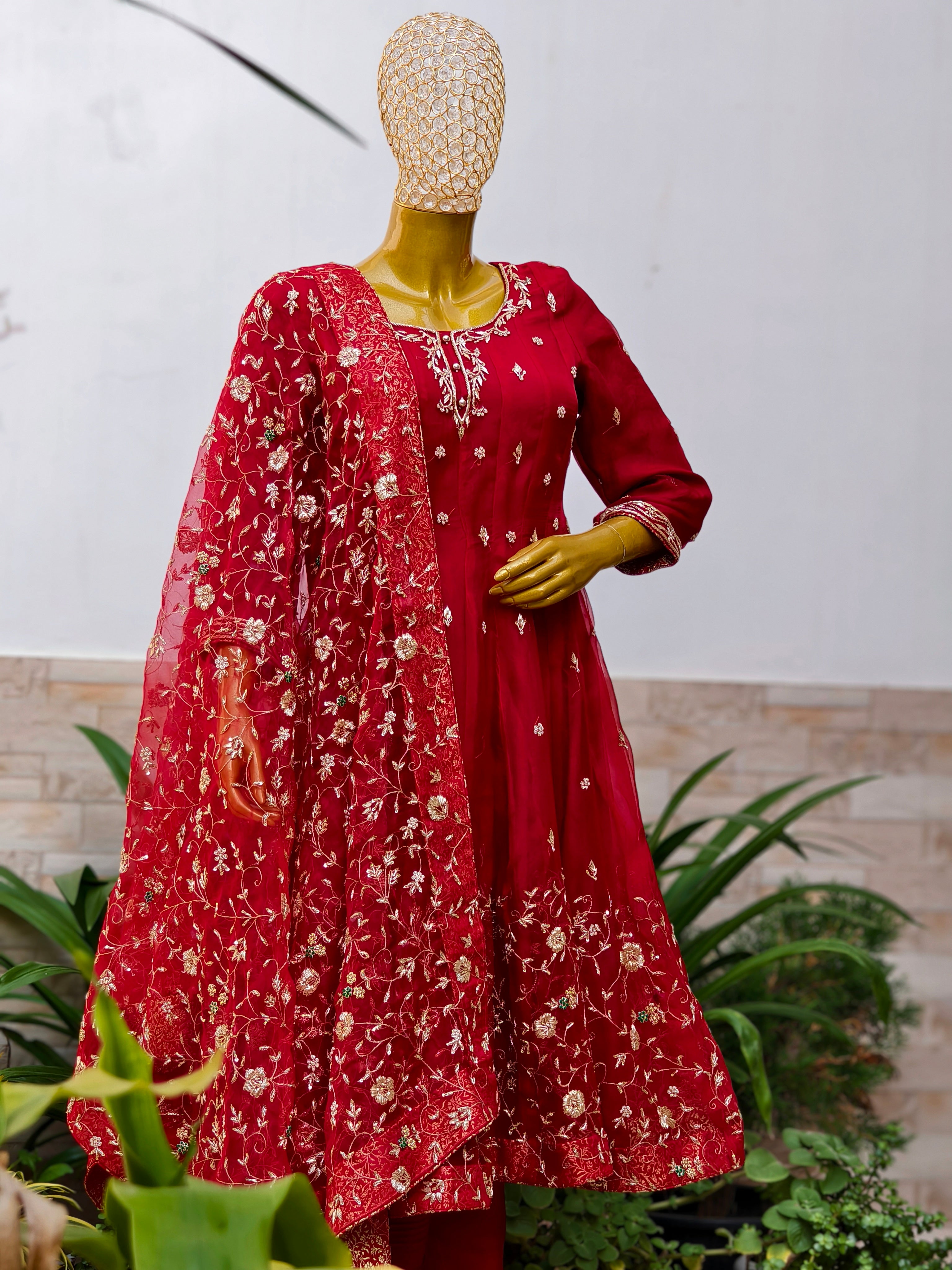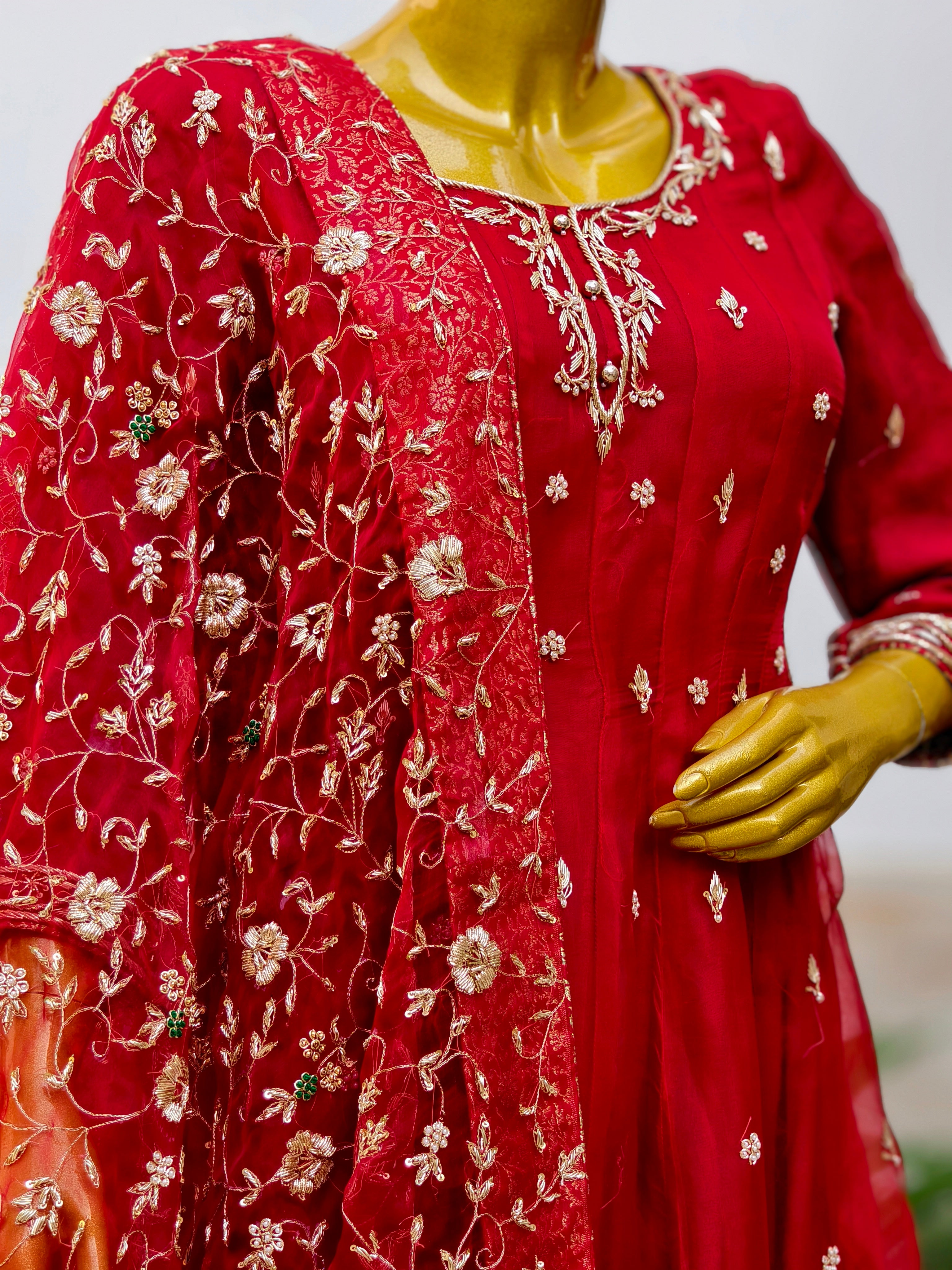 Adorned with intricate dabka, zardozi, zari, and resham embroidery, the outfit tells a story of tradition meeting timeless beauty. The pure organza dupatta adds a touch of dreamy luxury, perfectly complementing the flow of the gown.