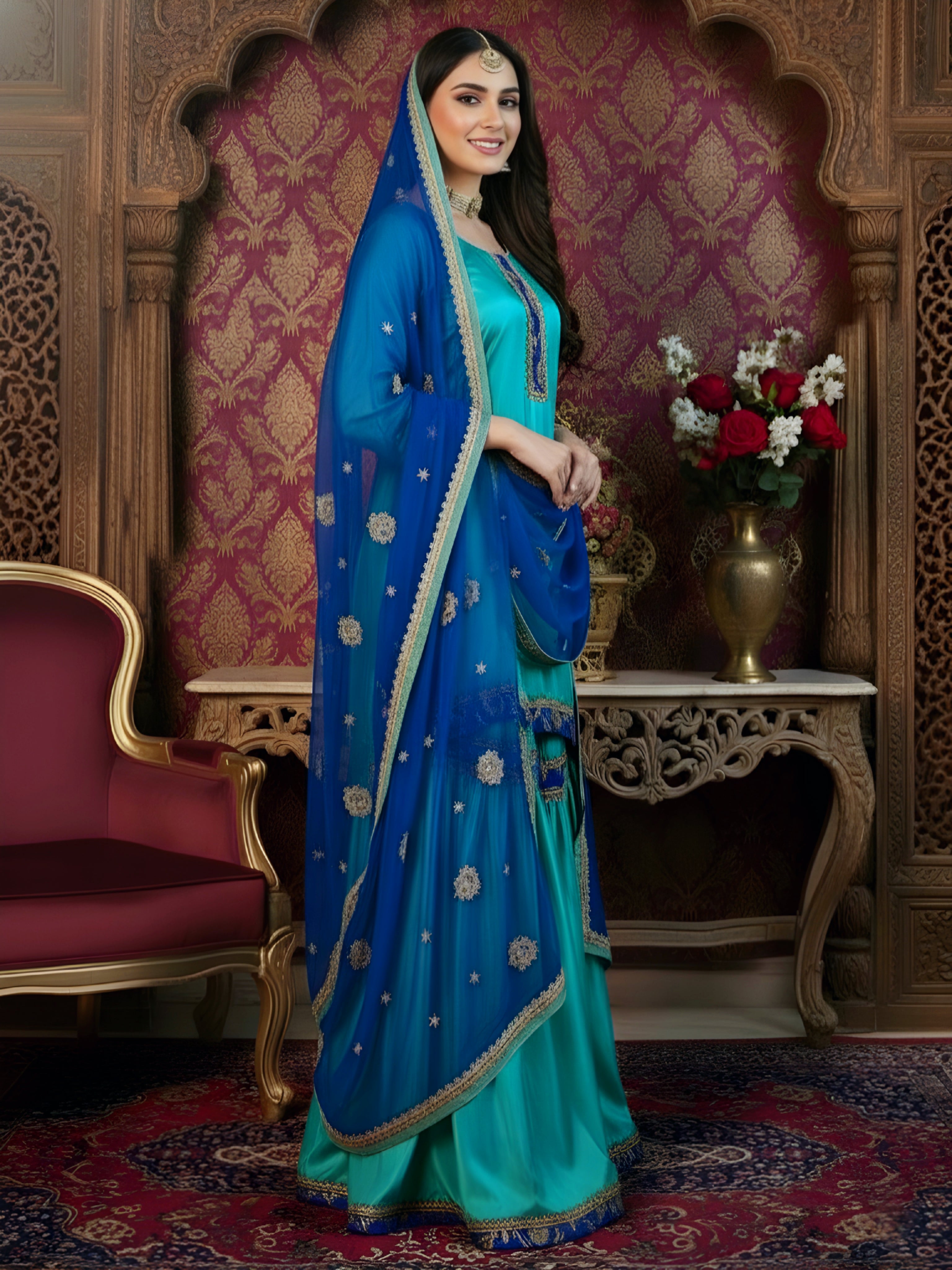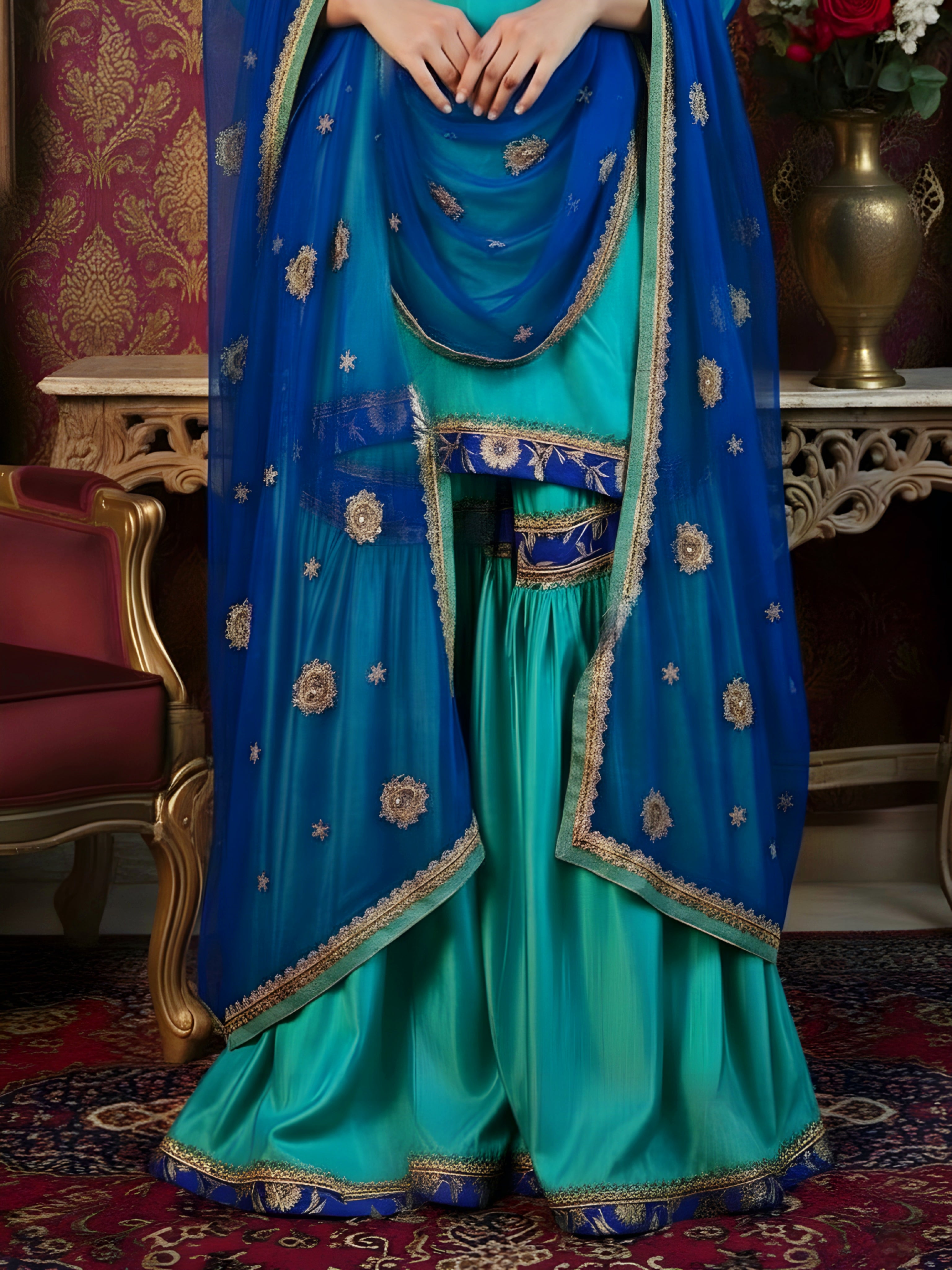 This stunning royal blue and green gharara set is a perfect blend of grace and tradition, crafted for wedding celebrations, mehendi functions, and festive occasions. The rich green kameez features intricate golden embroidery, paired with a flowy matching gharara that adds volume and elegance. The look is beautifully complemented with a royal blue embroidered dupatta, making it a must-have for bridesmaids, wedding guests, or cultural events.