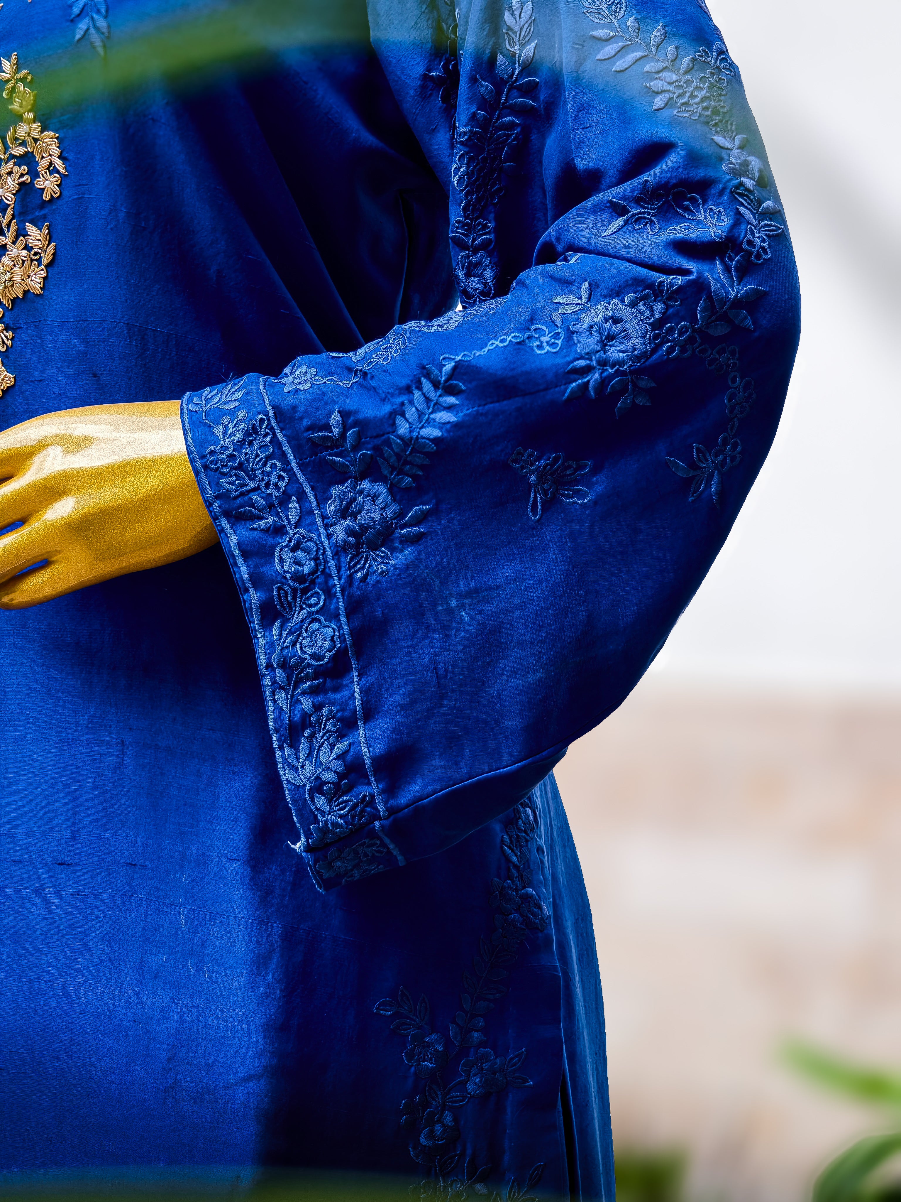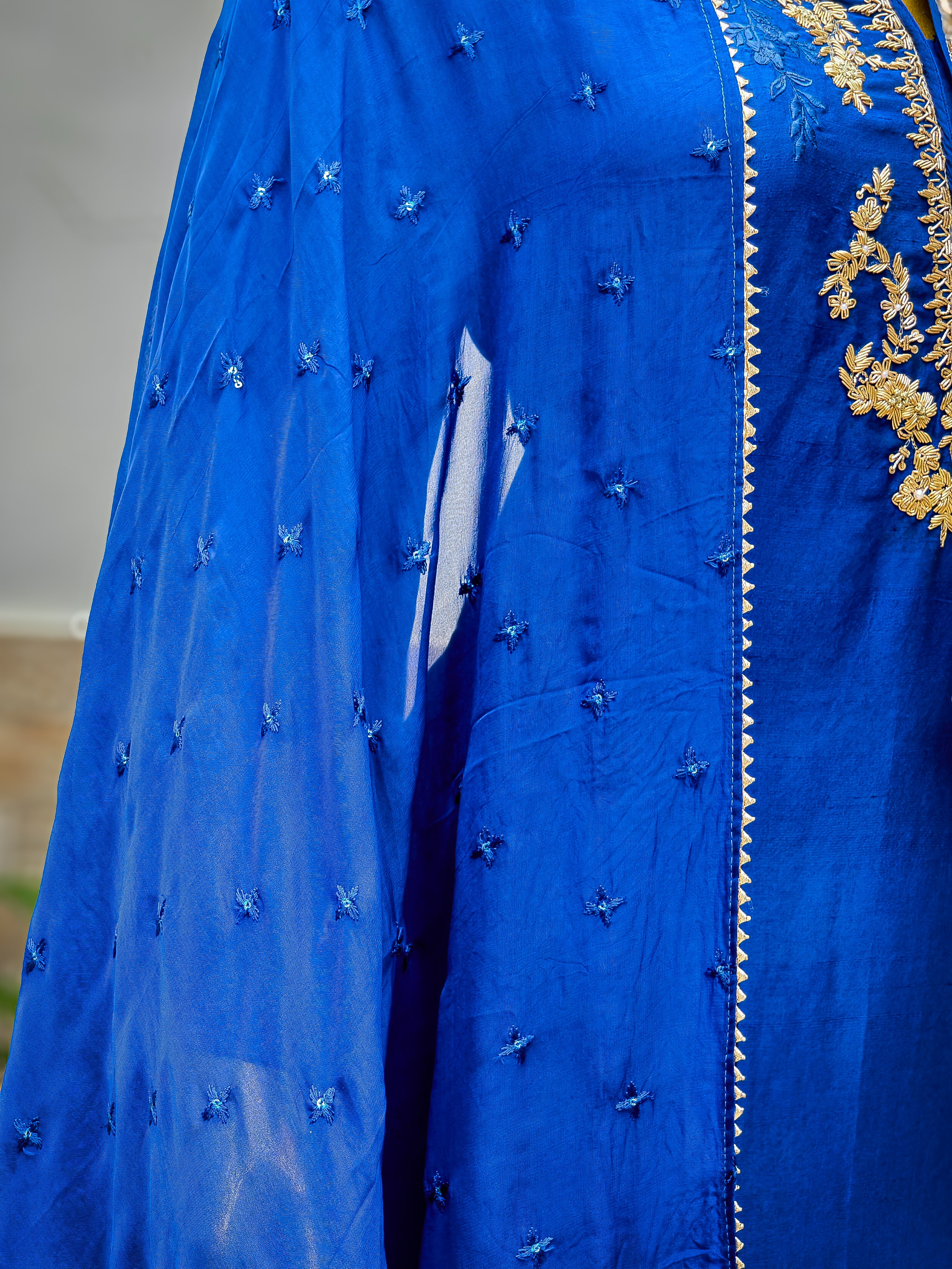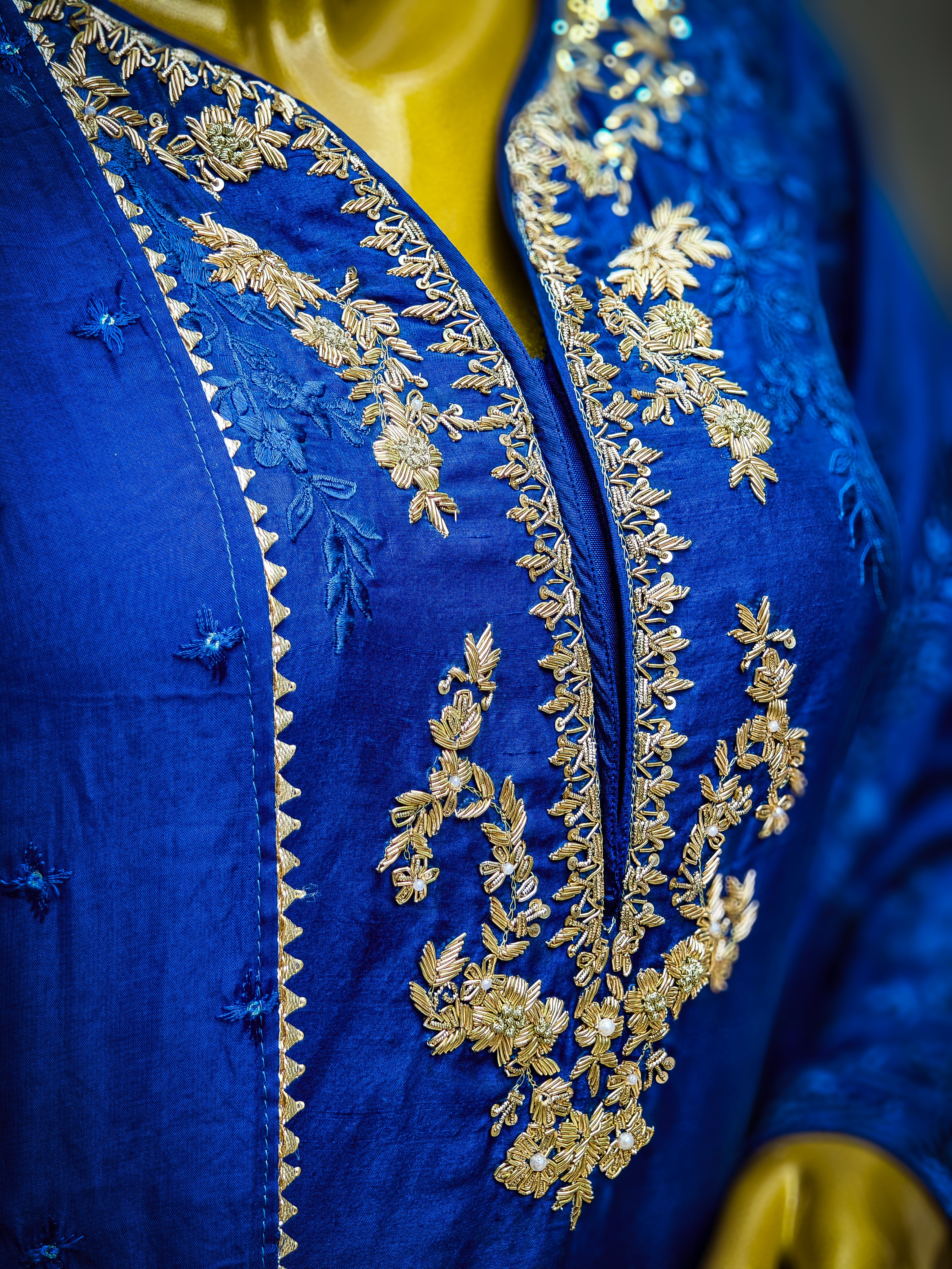 Exude timeless elegance in this royal blue Chanderi suit, delicately hand-embroidered with resham and dabka work. The kurta showcases intricate embroidery along the neckline, sleeves, and hem, reflecting traditional artistry with a regal touch.