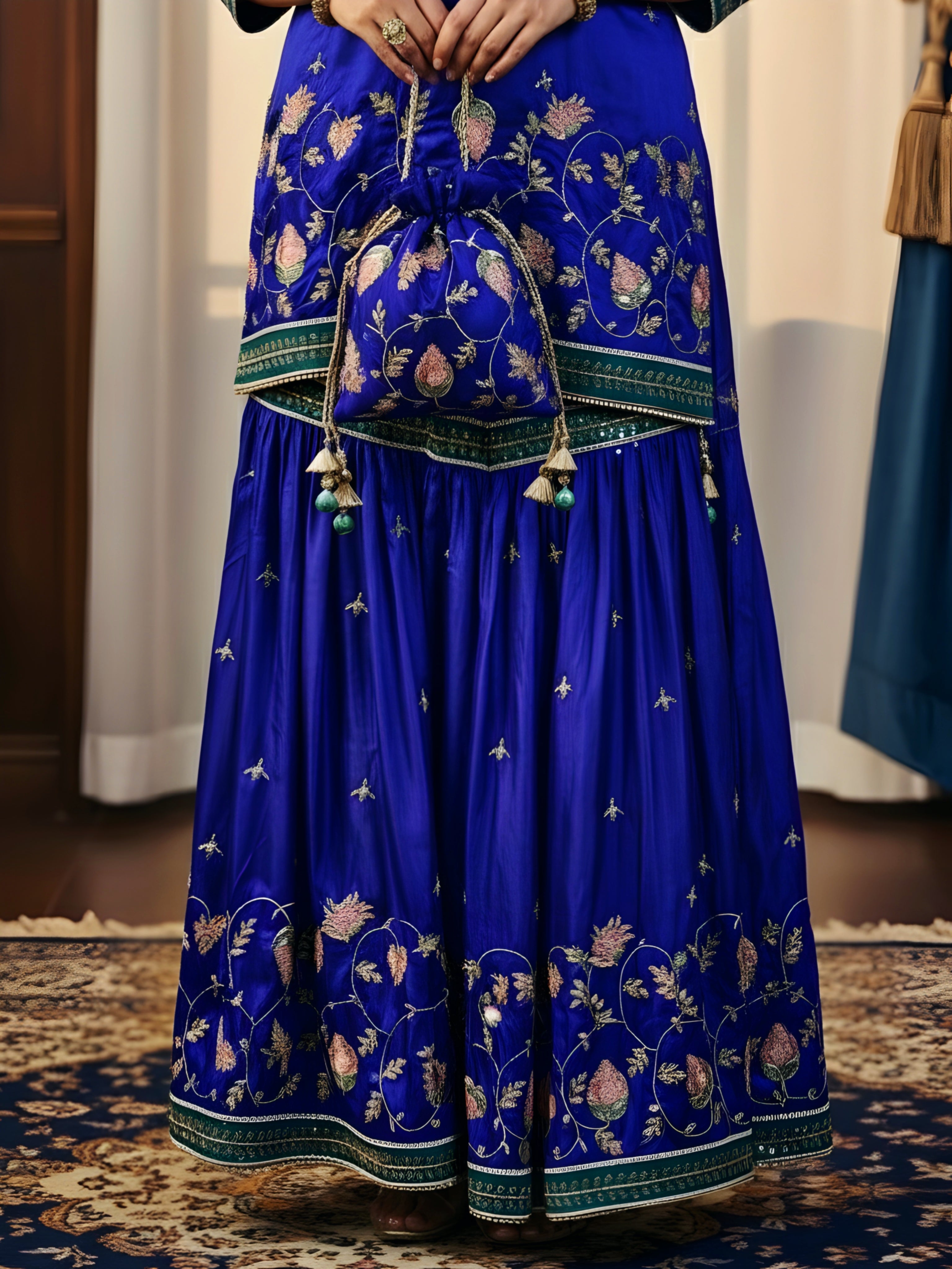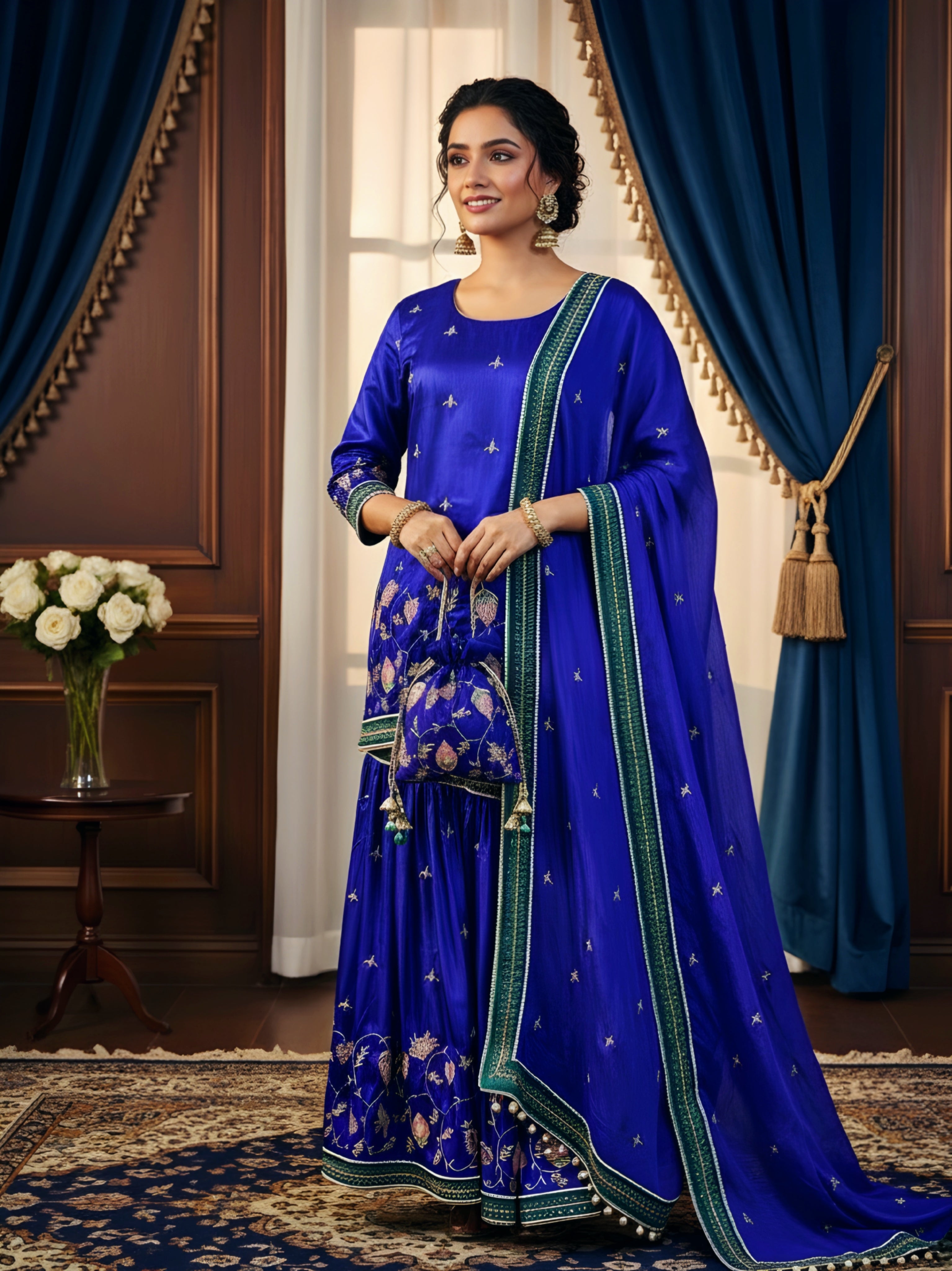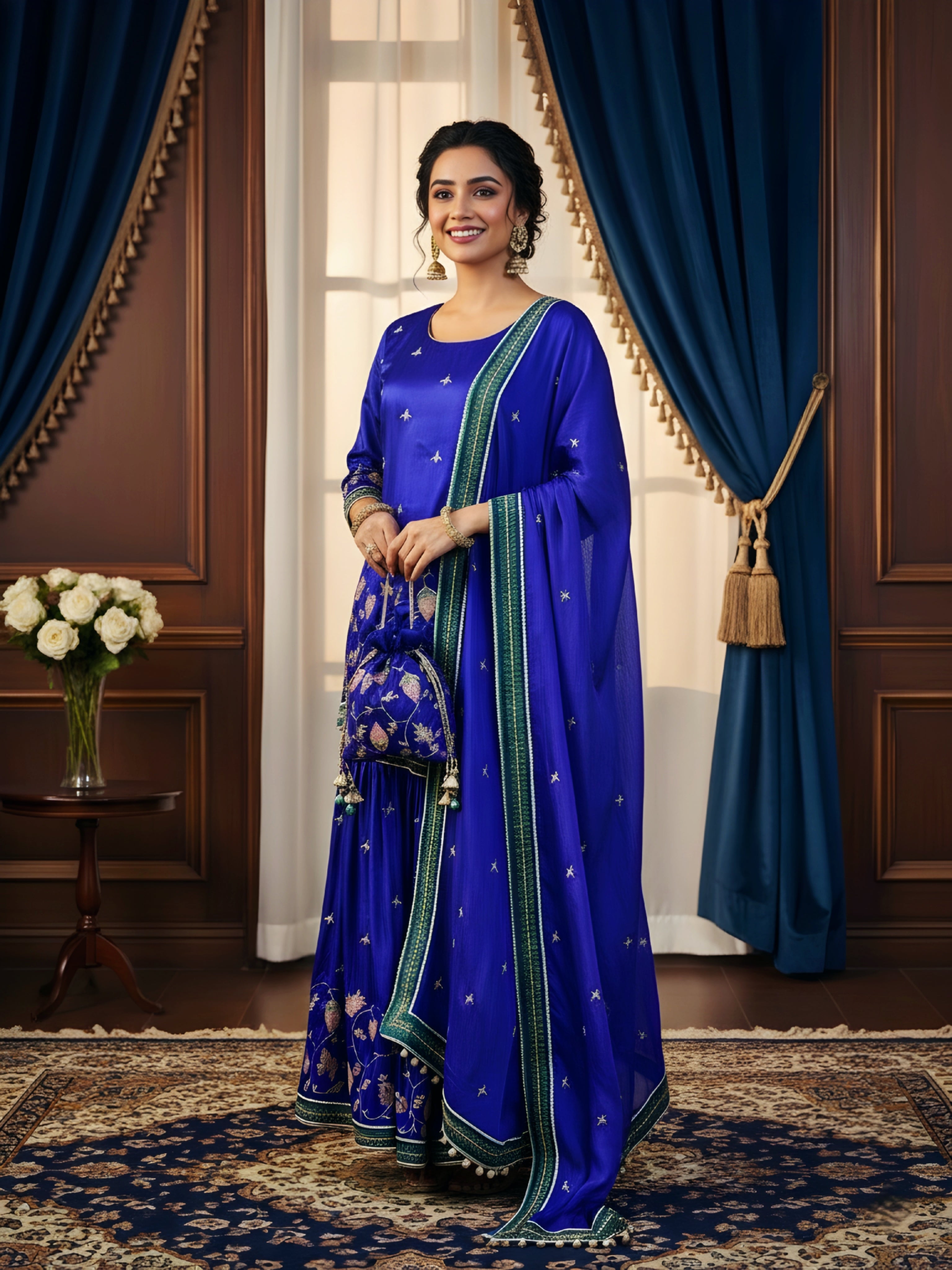 Step into the spotlight with the elegance of deep royal blue — a color that reflects confidence, royalty, and grace. This Pure Silk Gharara set is crafted for the woman who loves making every occasion unforgettable.