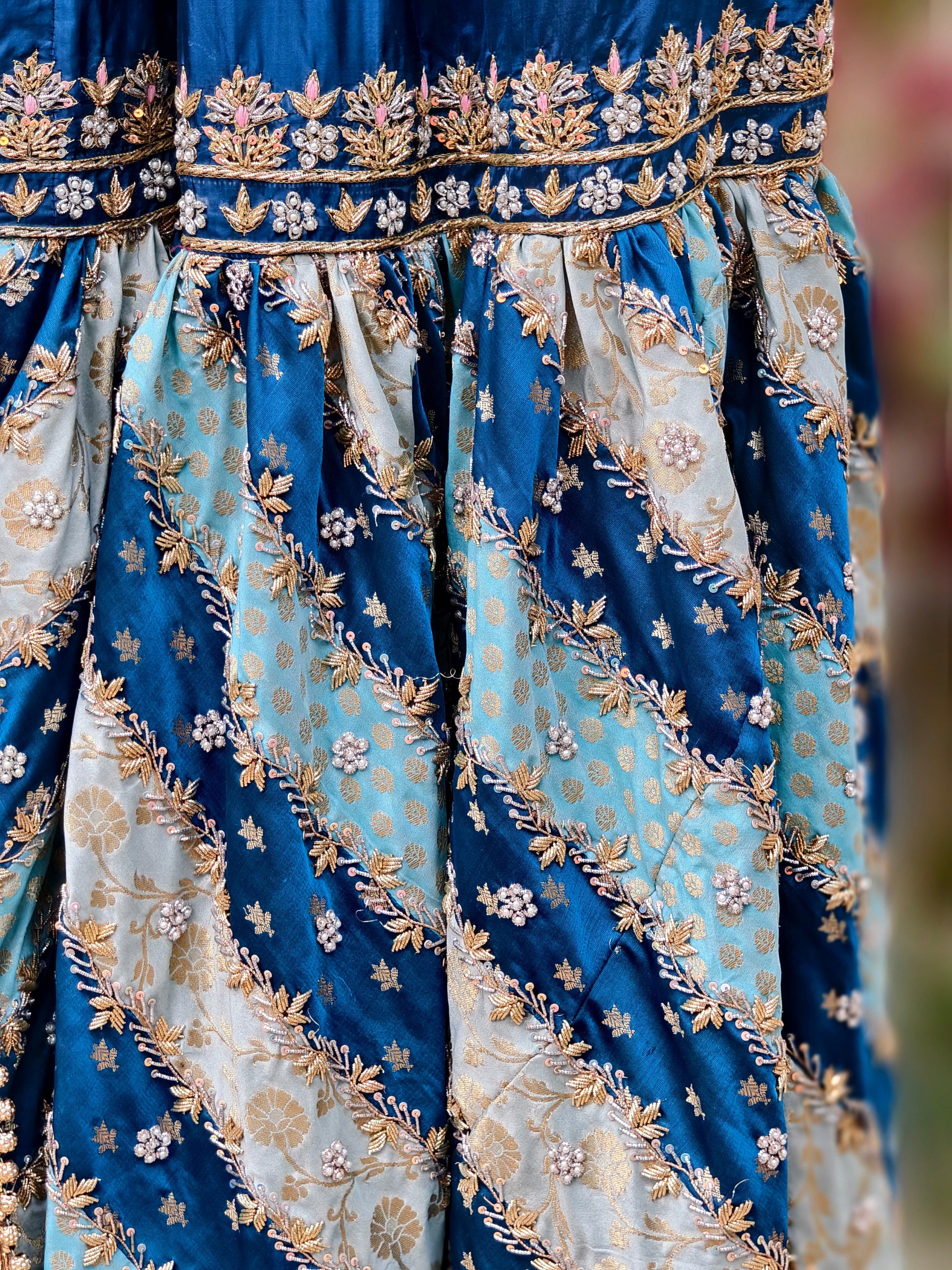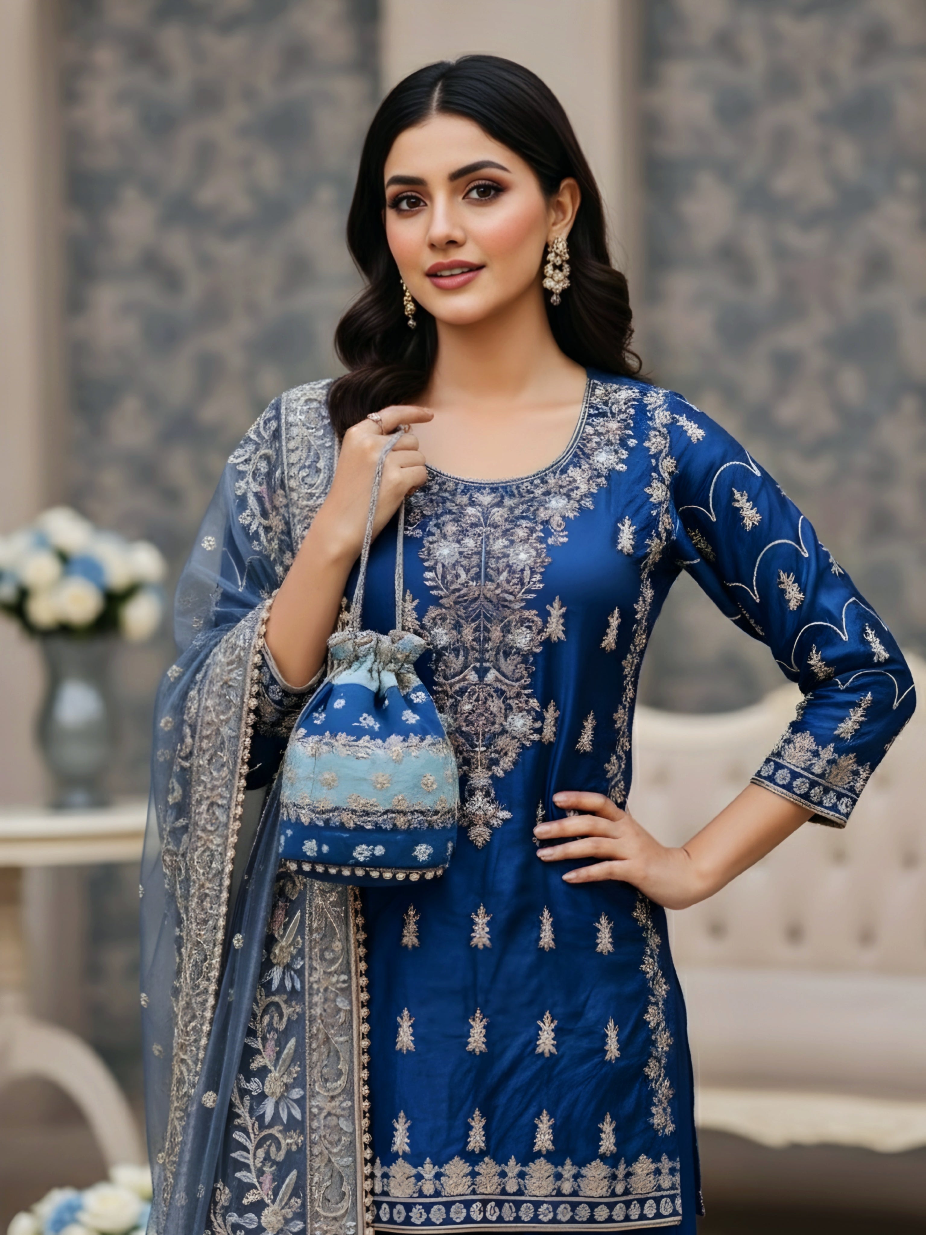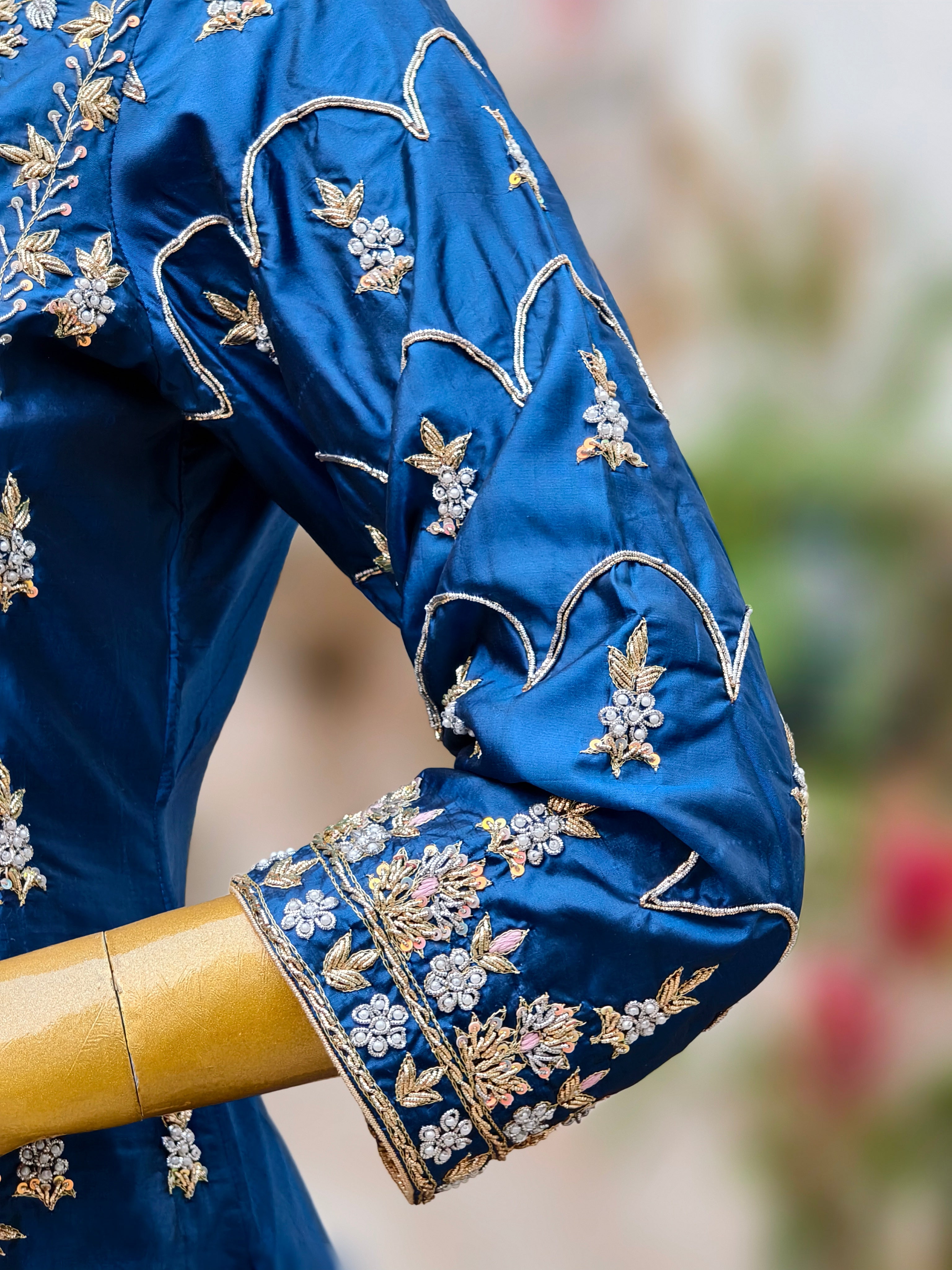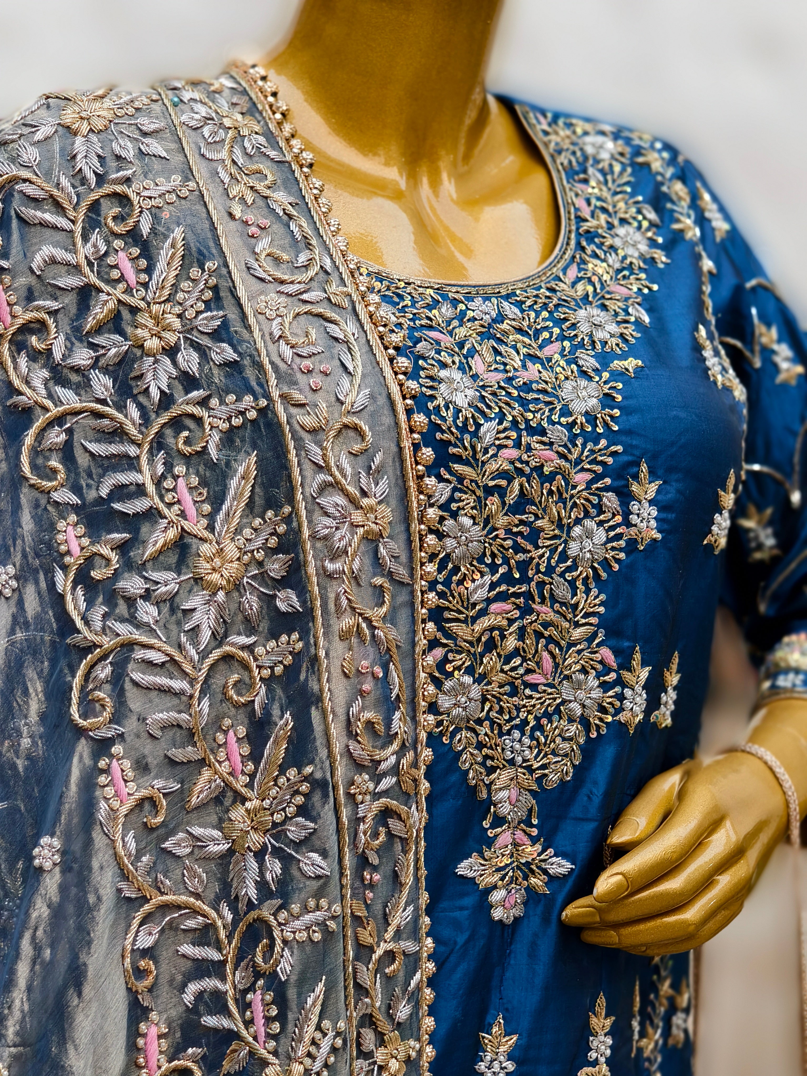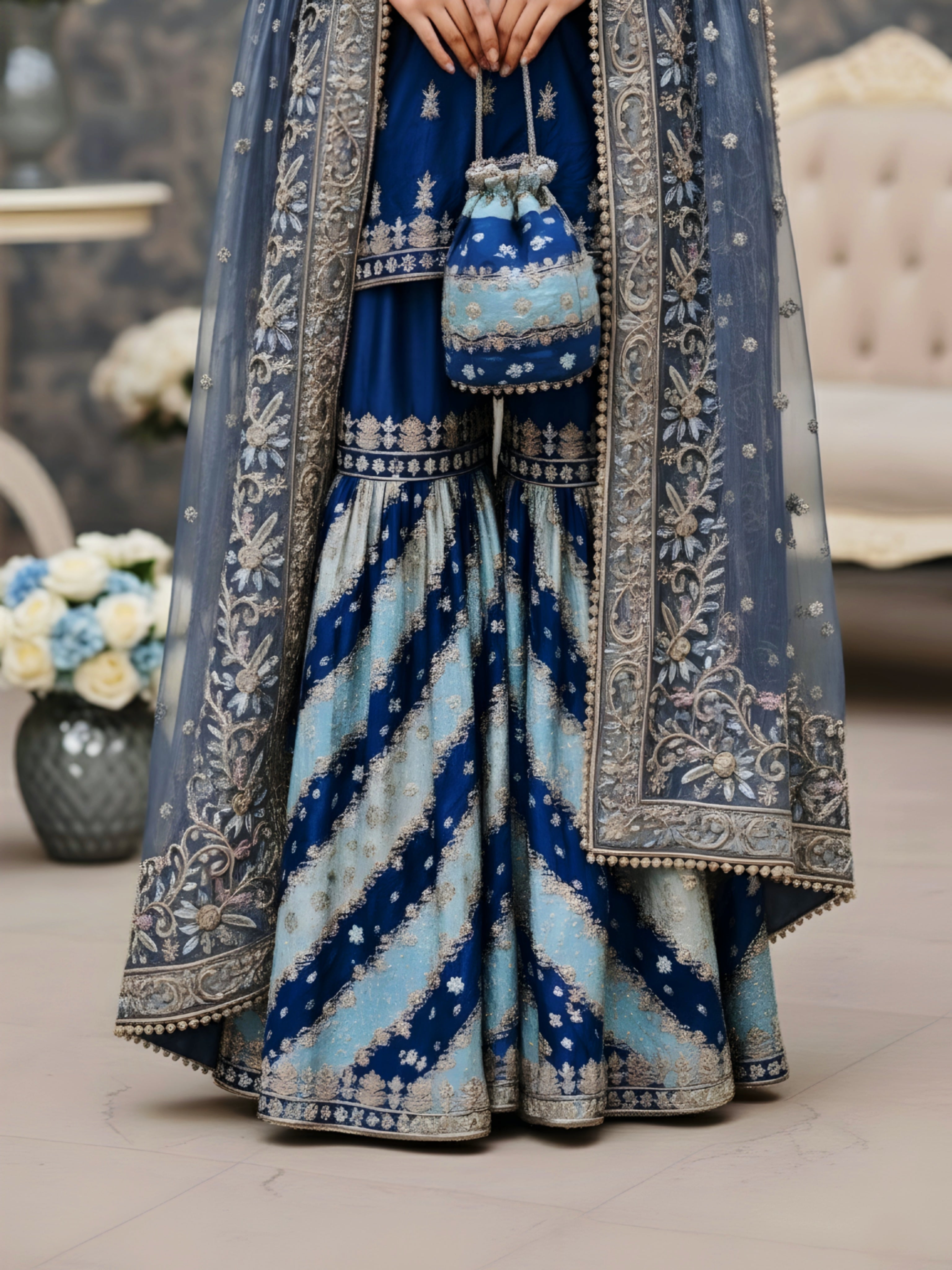 Step into pure elegance with this breathtaking Royal Blue Gharara Set, crafted for women who love luxurious traditional fashion. The outfit features a rich pure silk shirt, adorned with exquisite dabka zardozi embroidery that sparkles with every movement. The deep blue shade adds a regal charm that stands out beautifully in both day and night functions.