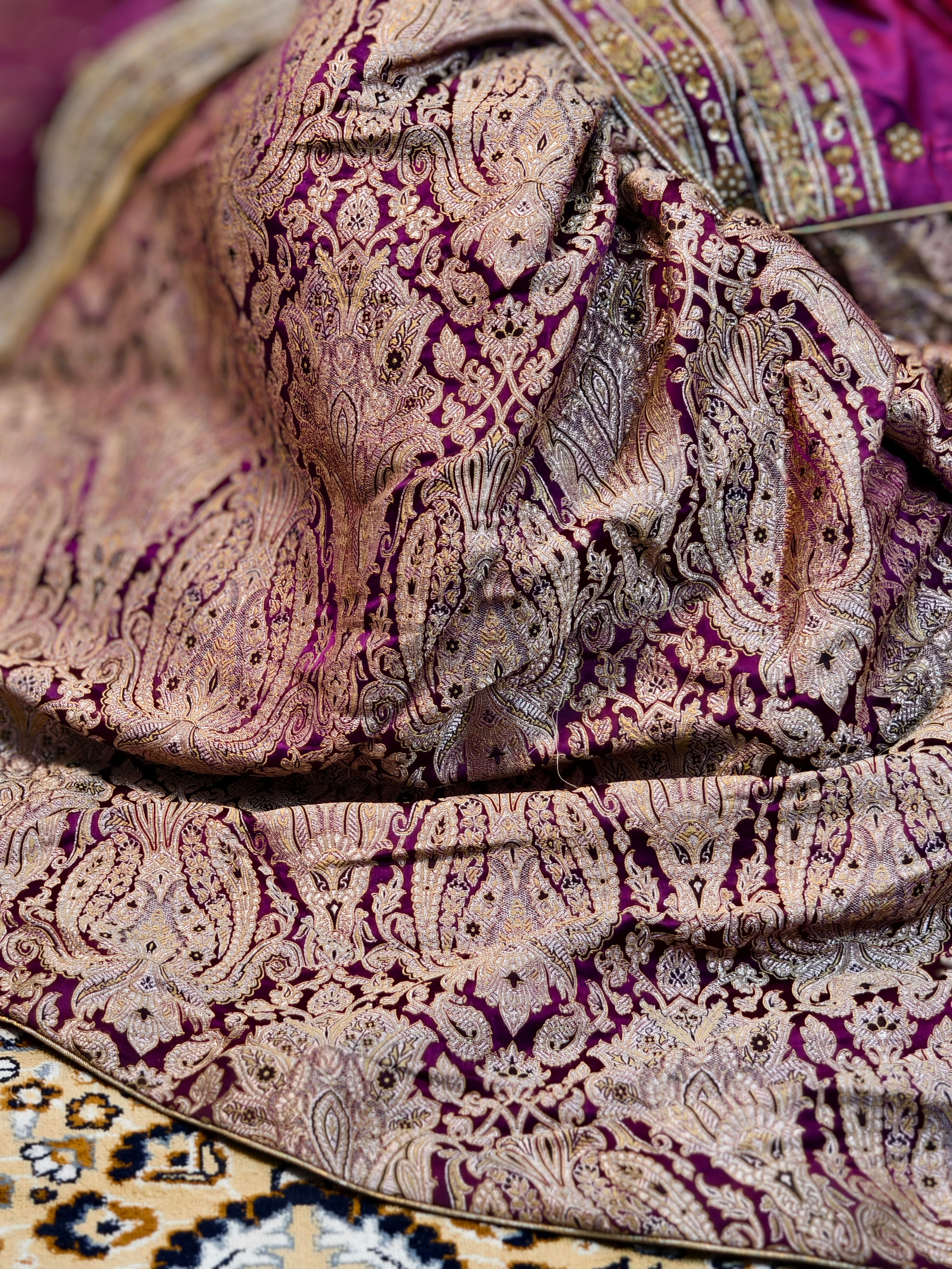 Exude regal charm with this luxurious Banarasi Gharara set, crafted for bridesmaids, wedding guests, or festive occasions where elegance matters. The ensemble features a pure silk kameez in a deep royal purple shade, embellished with handworked dabka and zardozi embroidery that adds traditional richness to its contemporary grace.