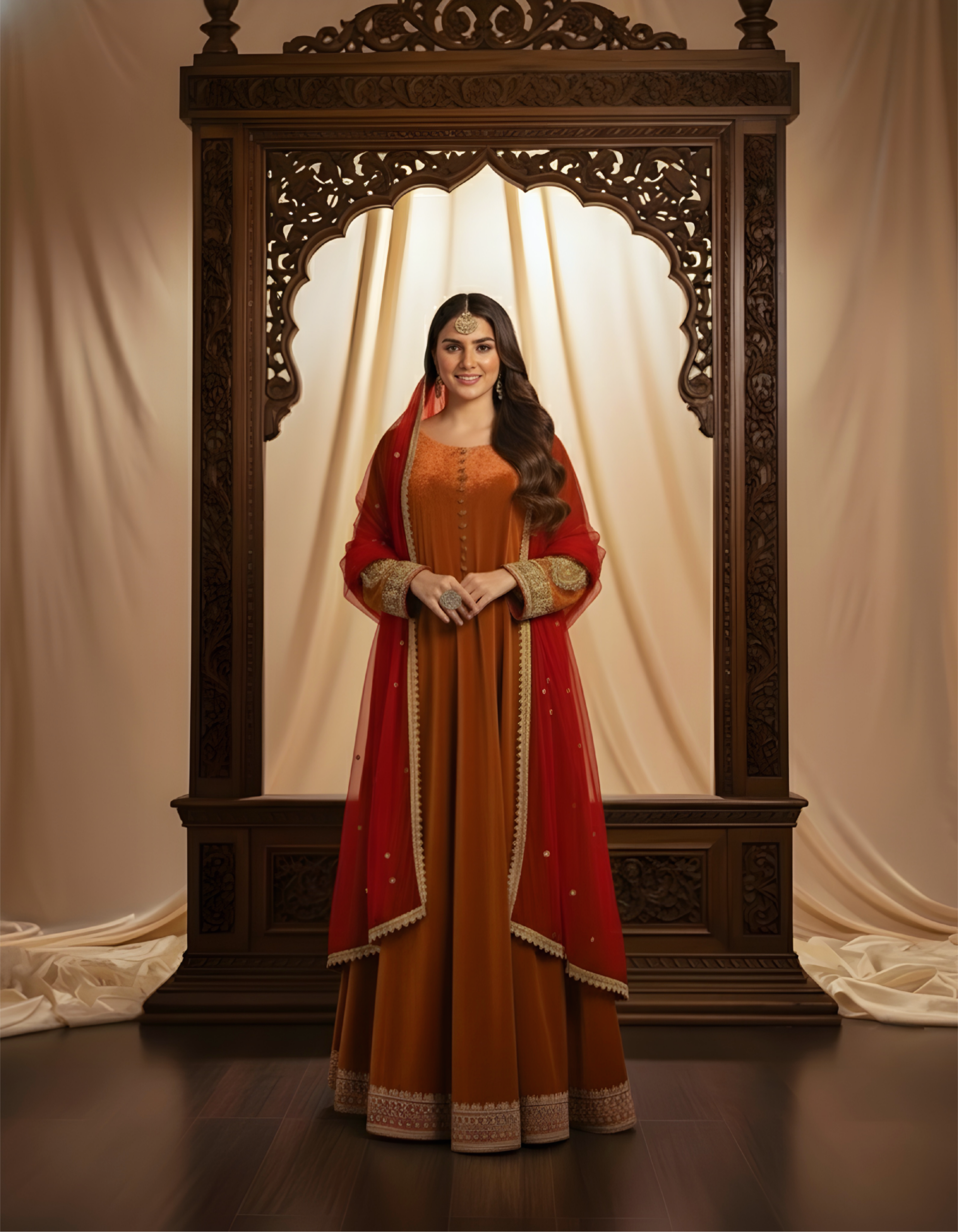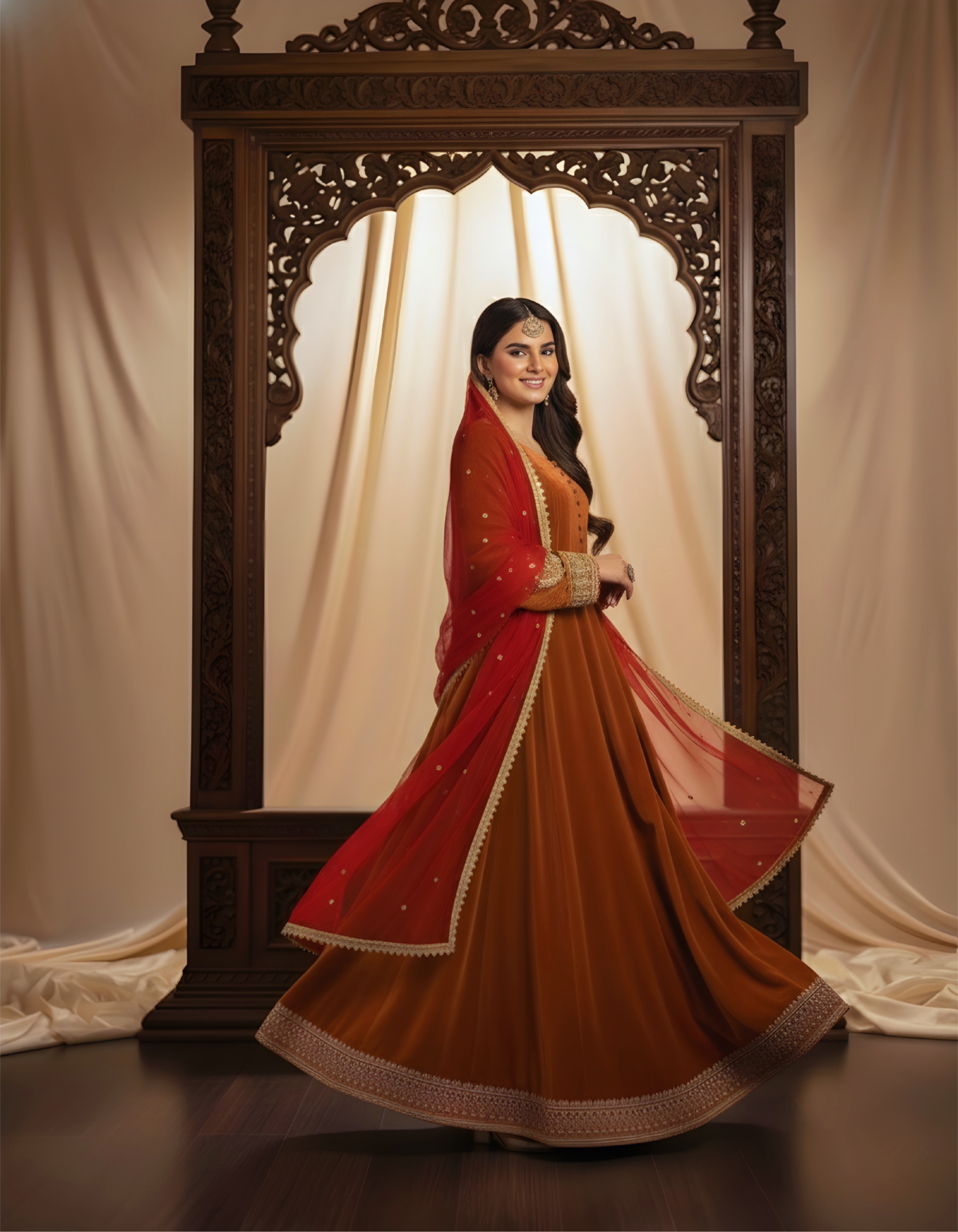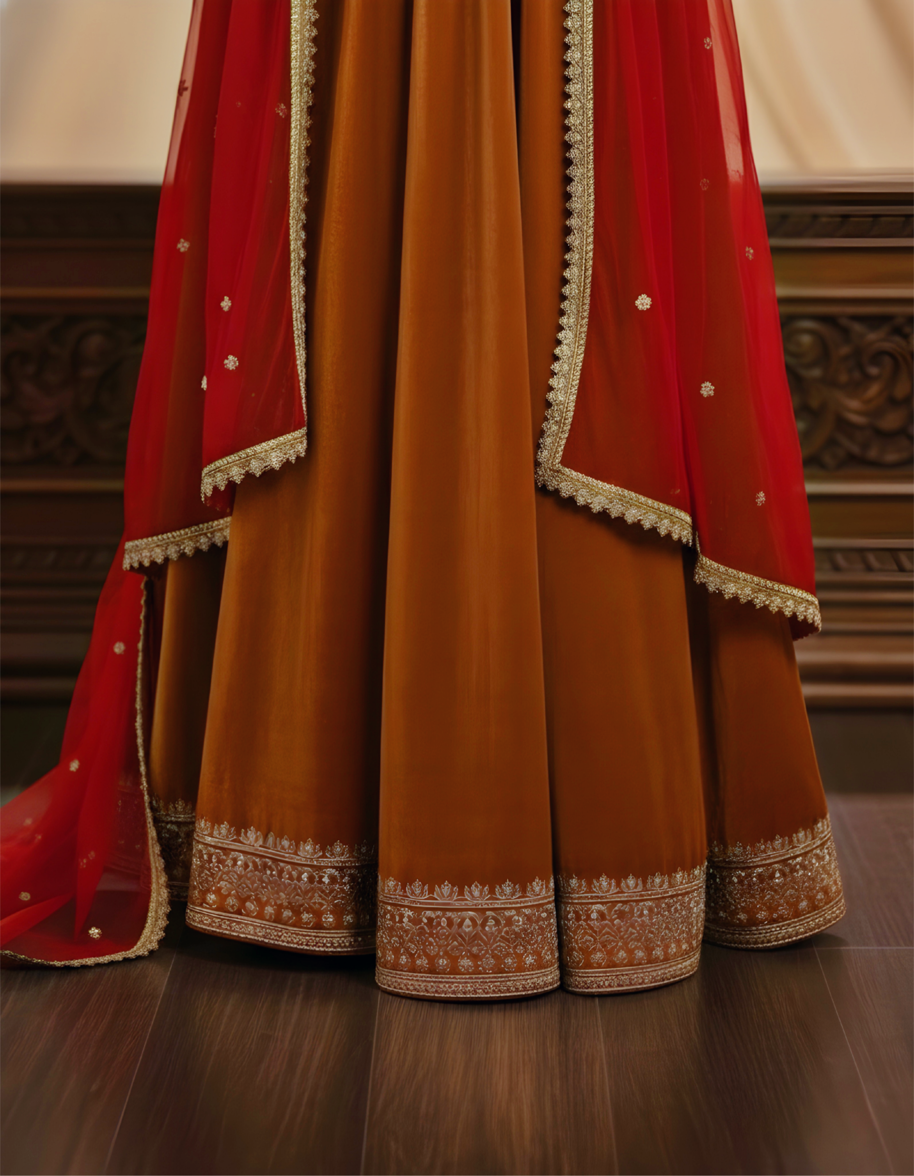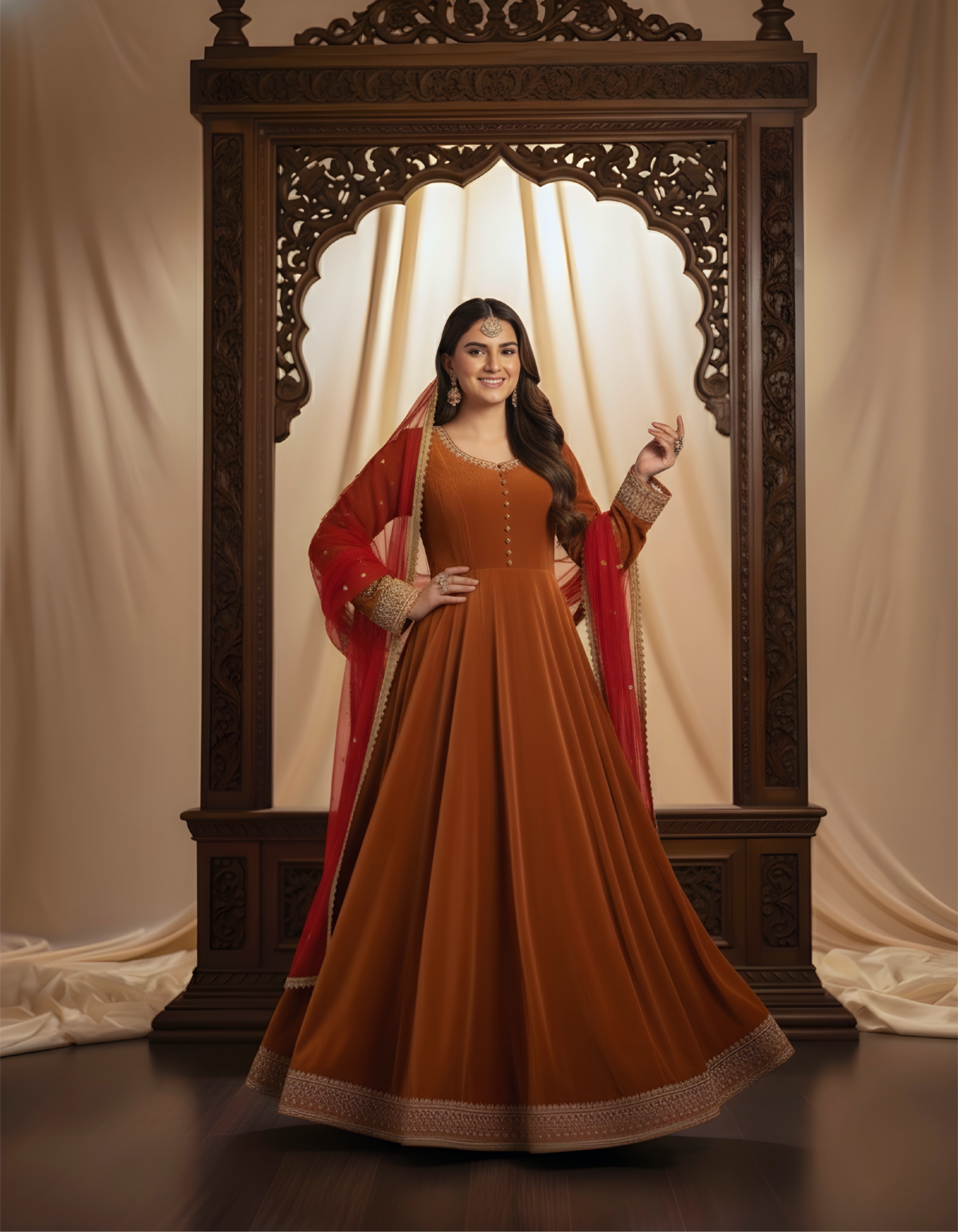Turn heads at any occasion with this luxurious Anarkali gown with dupatta, crafted in rich rust-colored velvet. The gown is beautifully adorned with handcrafted golden embroidery, featuring intricate dabka, zardozi, and resham work on the cuffs and hemline. The soft organza dupatta with four-sided lace and delicate buti work adds a graceful finish to this royal ensemble.