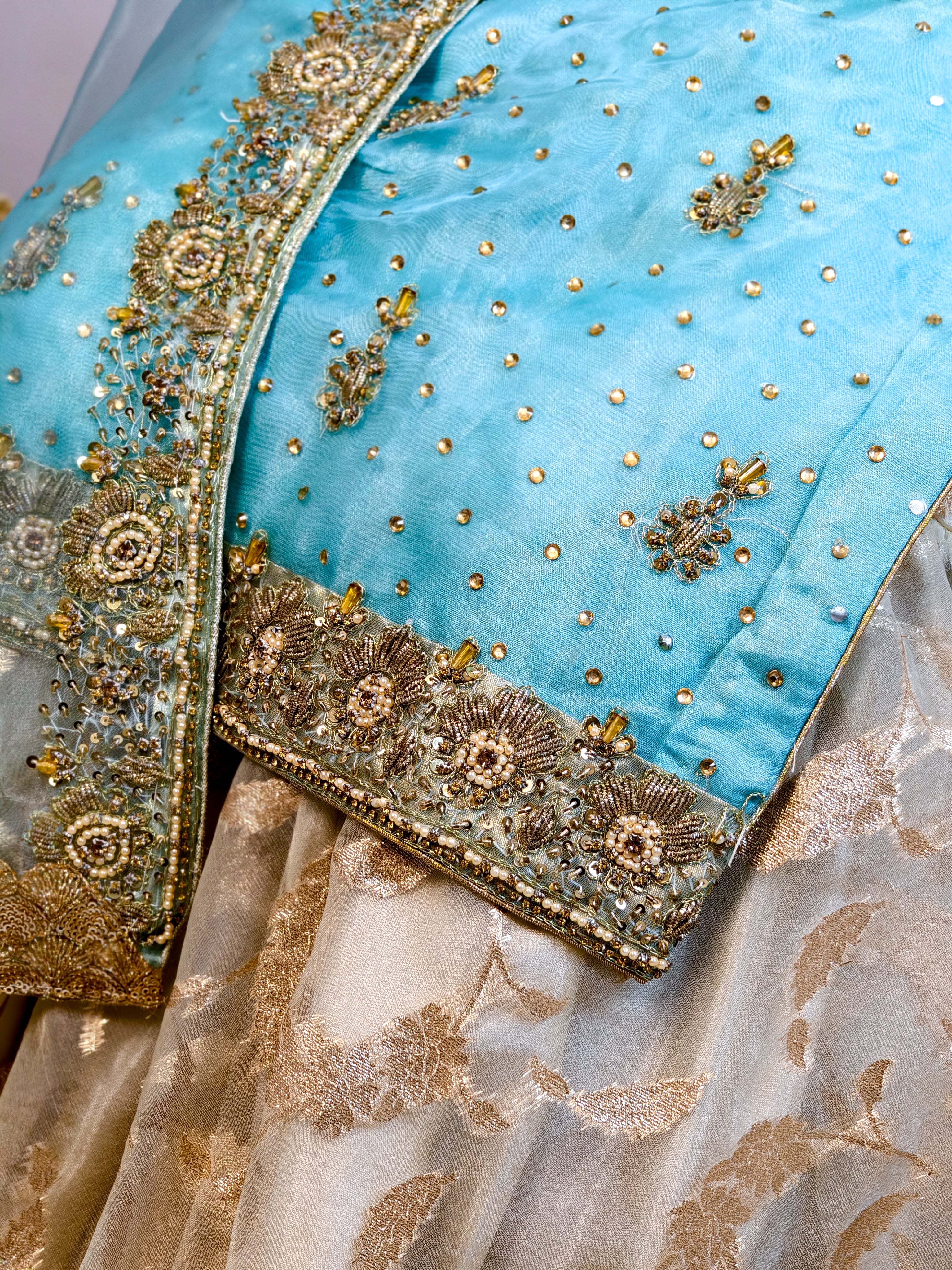Elevate your festive wardrobe with this breathtaking gharara dress in soft sky blue and rich gold. Crafted for elegance and tradition, the sky-blue organza tissue kameez is adorned with intricate hand-embroidered zardozi and zarkan work, radiating timeless charm.