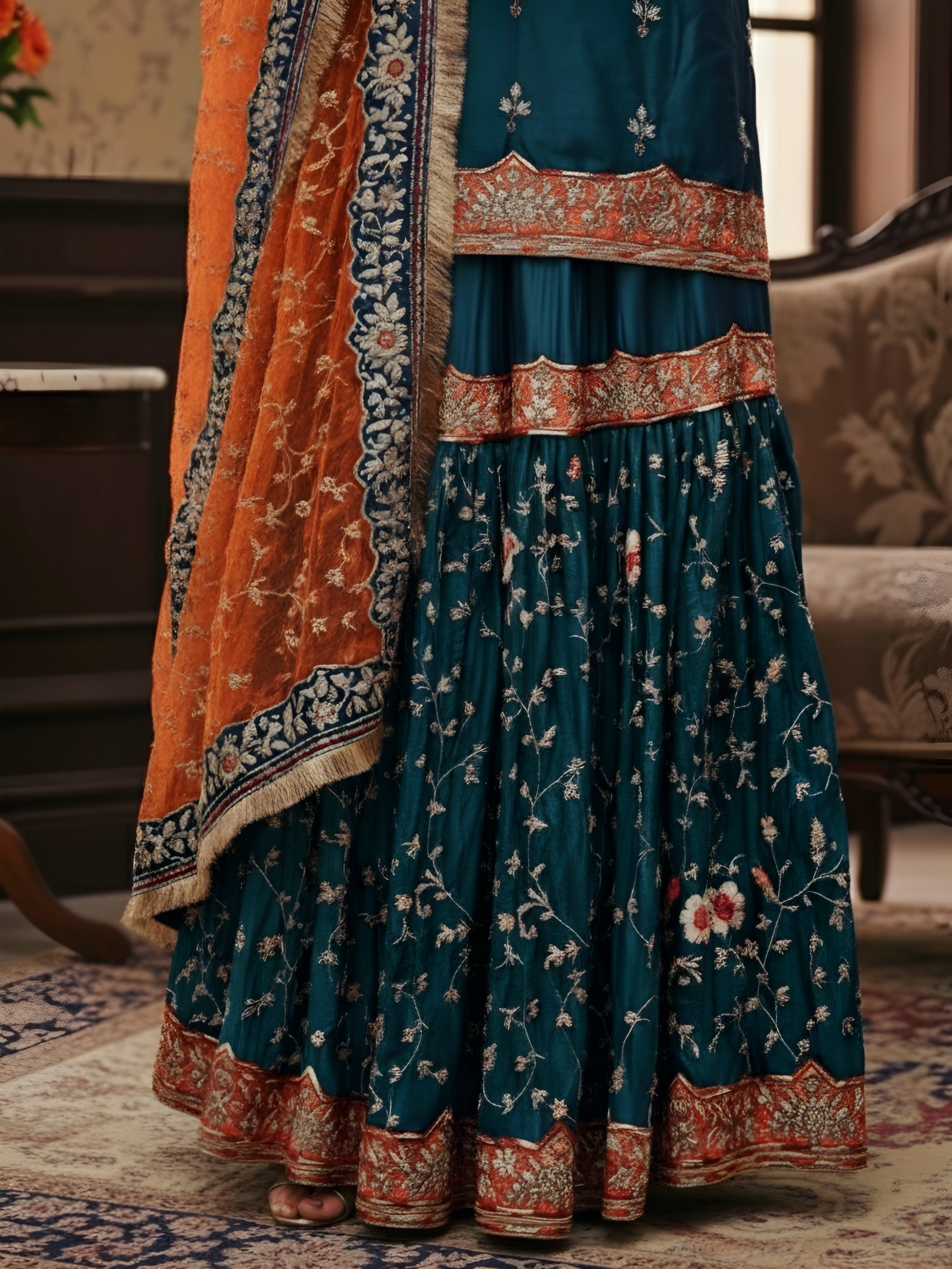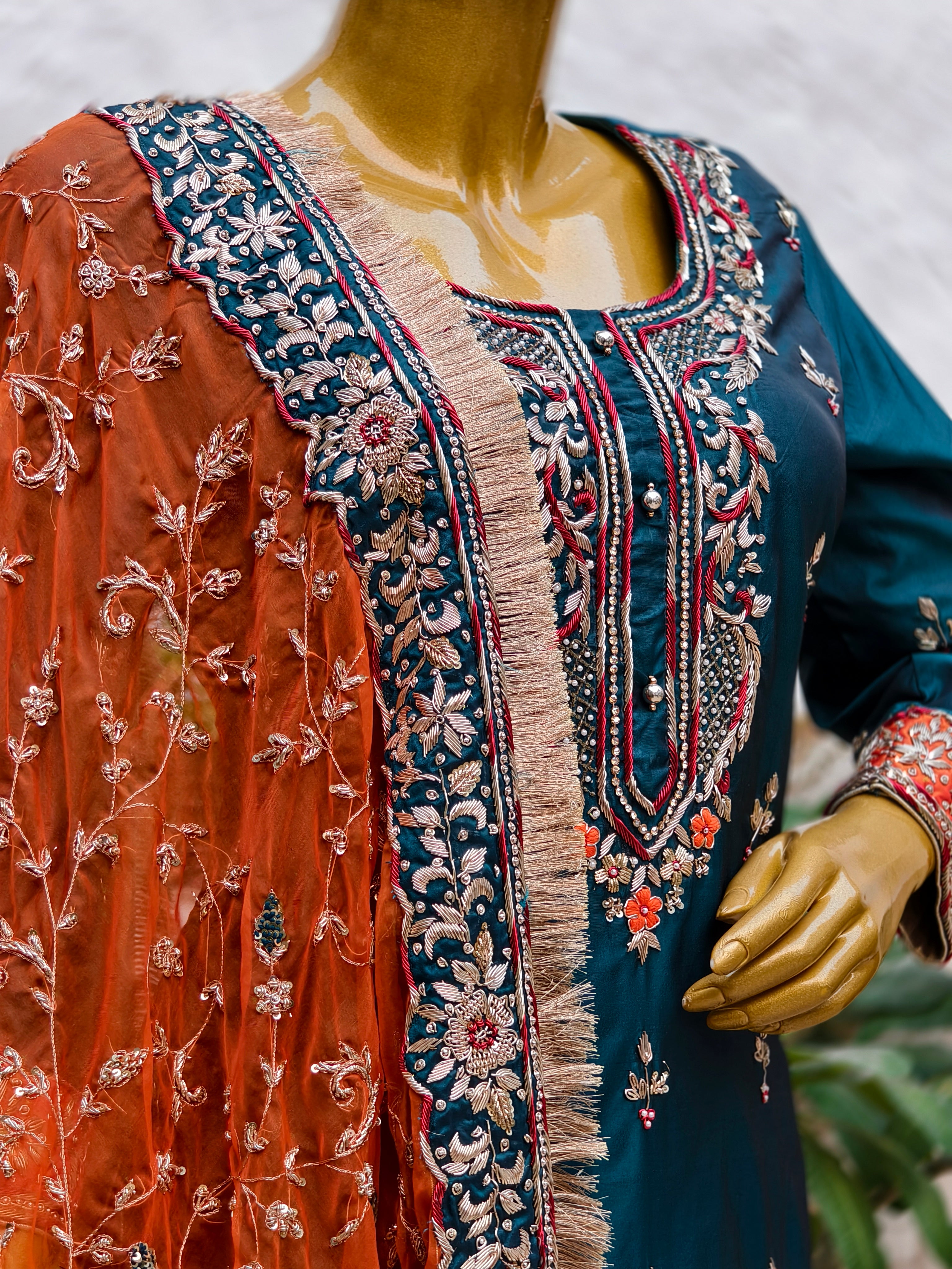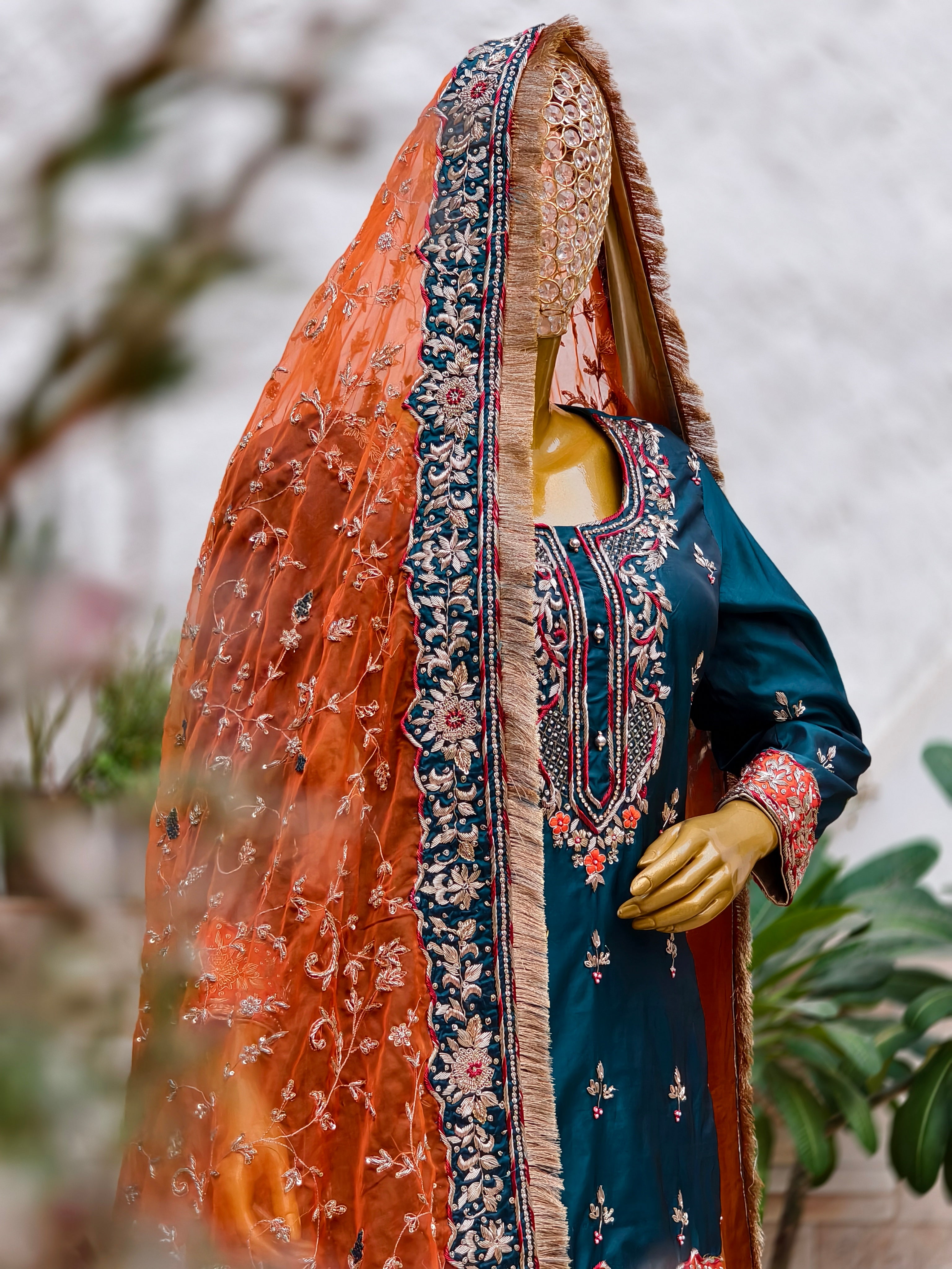 The rich teal silk is adorned with handcrafted dabka zardozi embroidery, brought to life by the skilled hands of artisans. The contrasting Pure Organza Dupatta in a luxurious burnt orange shade adds a mesmerizing charm — flowing softly with a queen-like aura, turning every step into a celebration.
