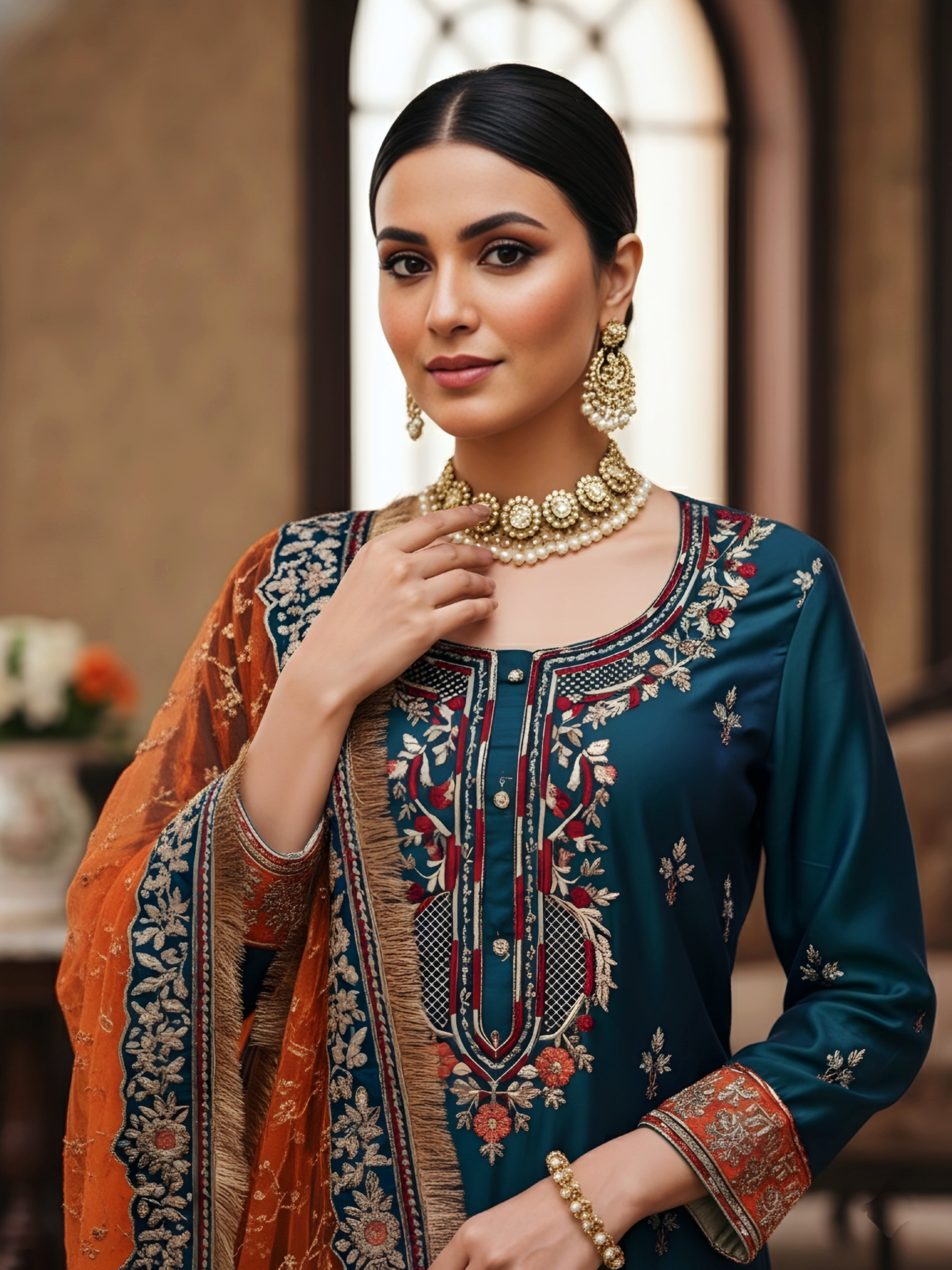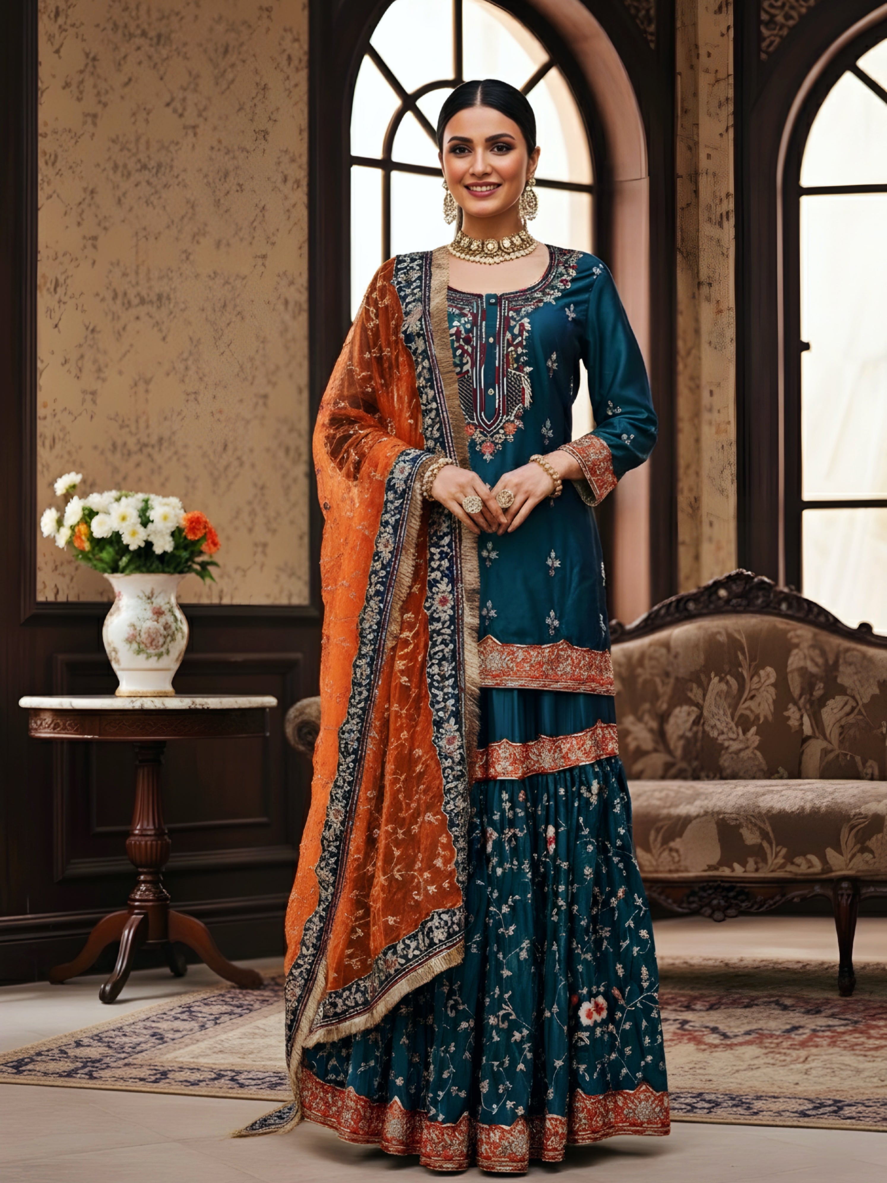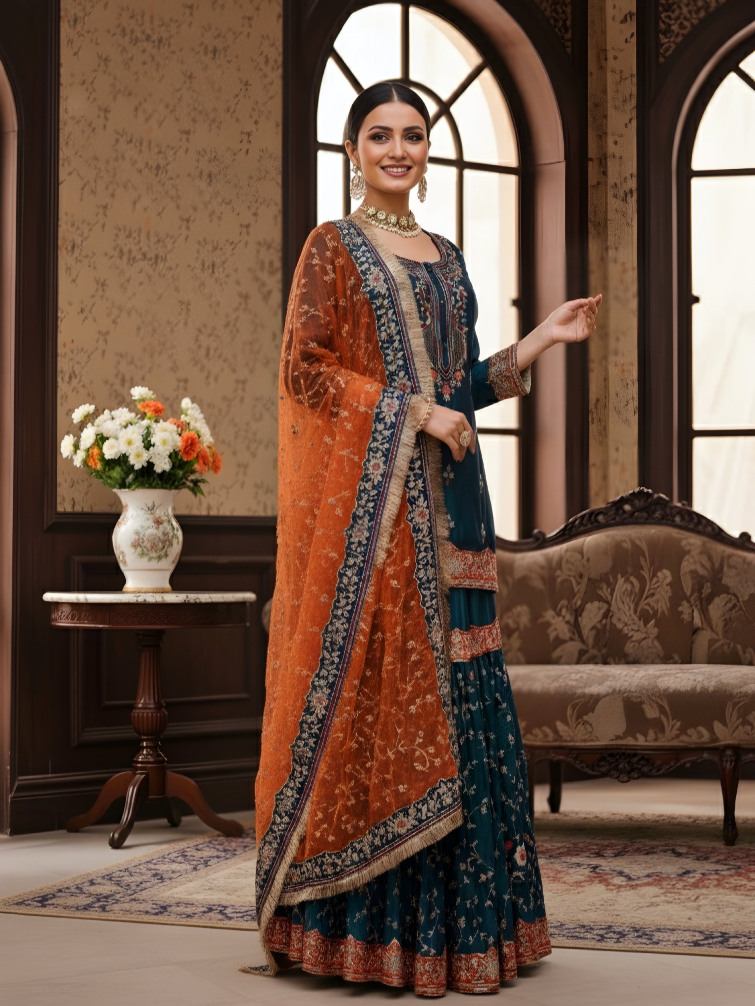 The rich teal silk is adorned with handcrafted dabka zardozi embroidery, brought to life by the skilled hands of artisans. The contrasting Pure Organza Dupatta in a luxurious burnt orange shade adds a mesmerizing charm — flowing softly with a queen-like aura, turning every step into a celebration.