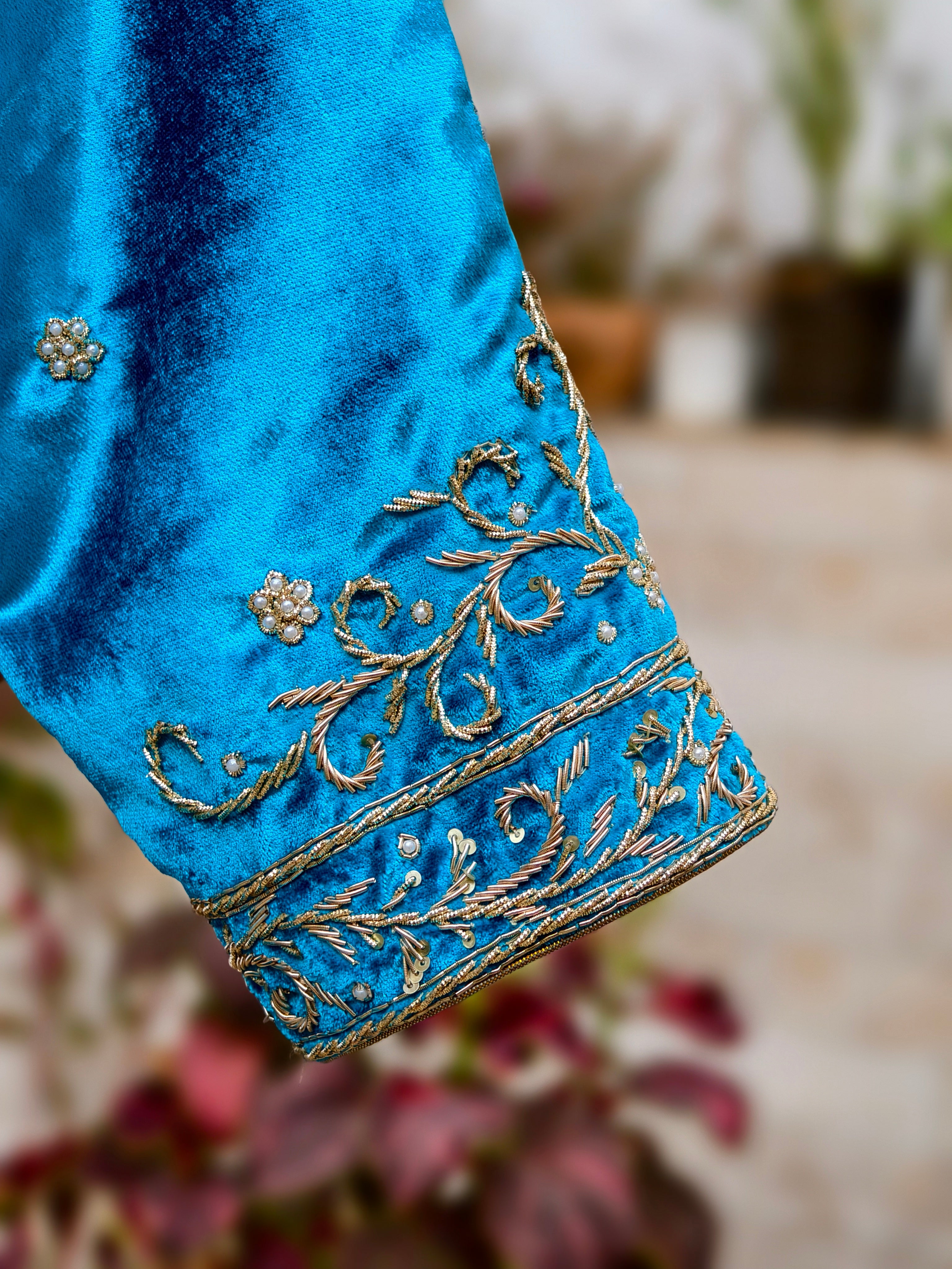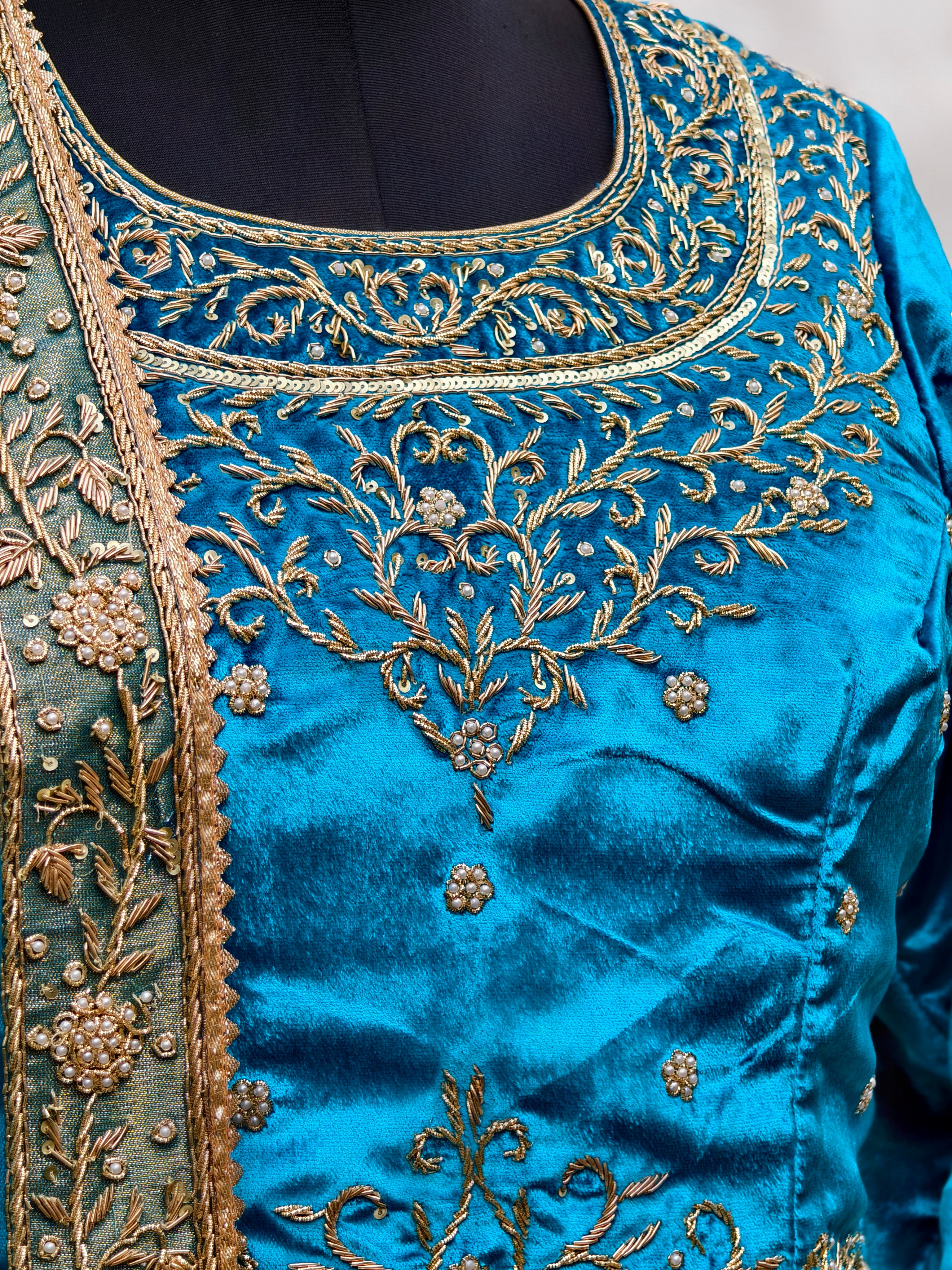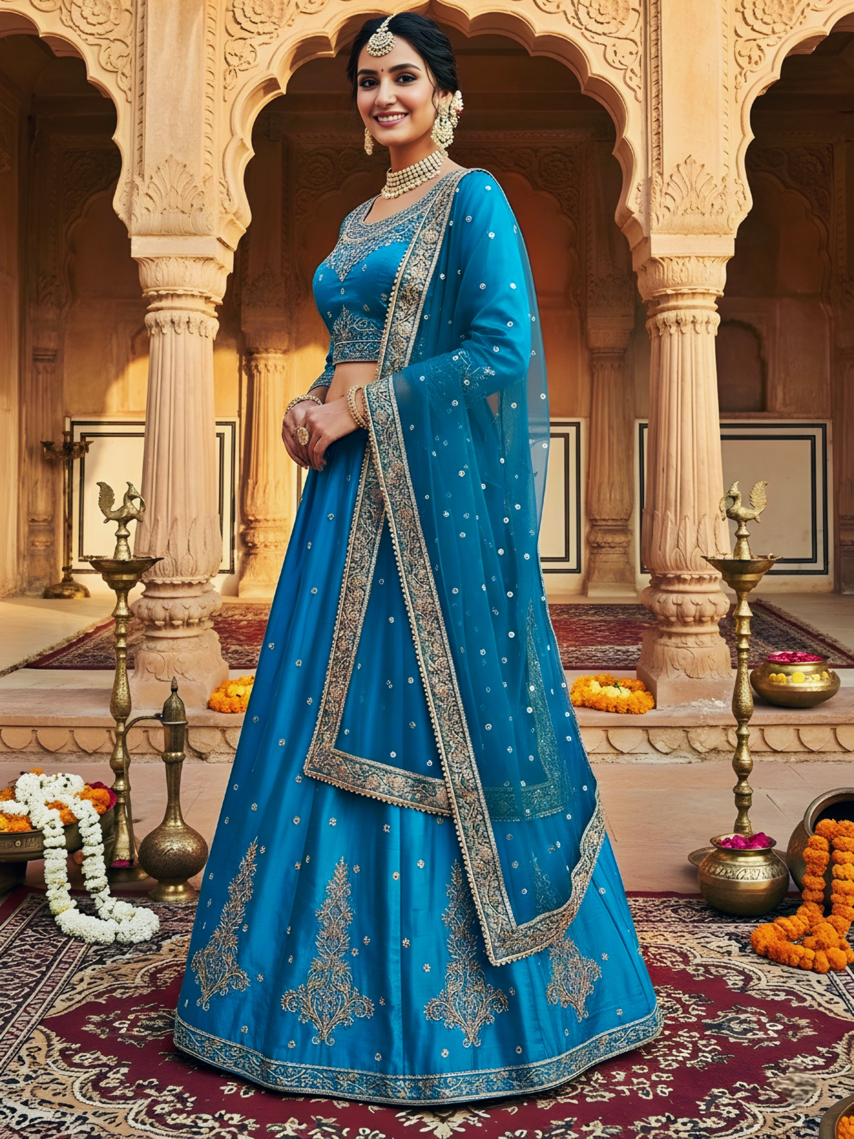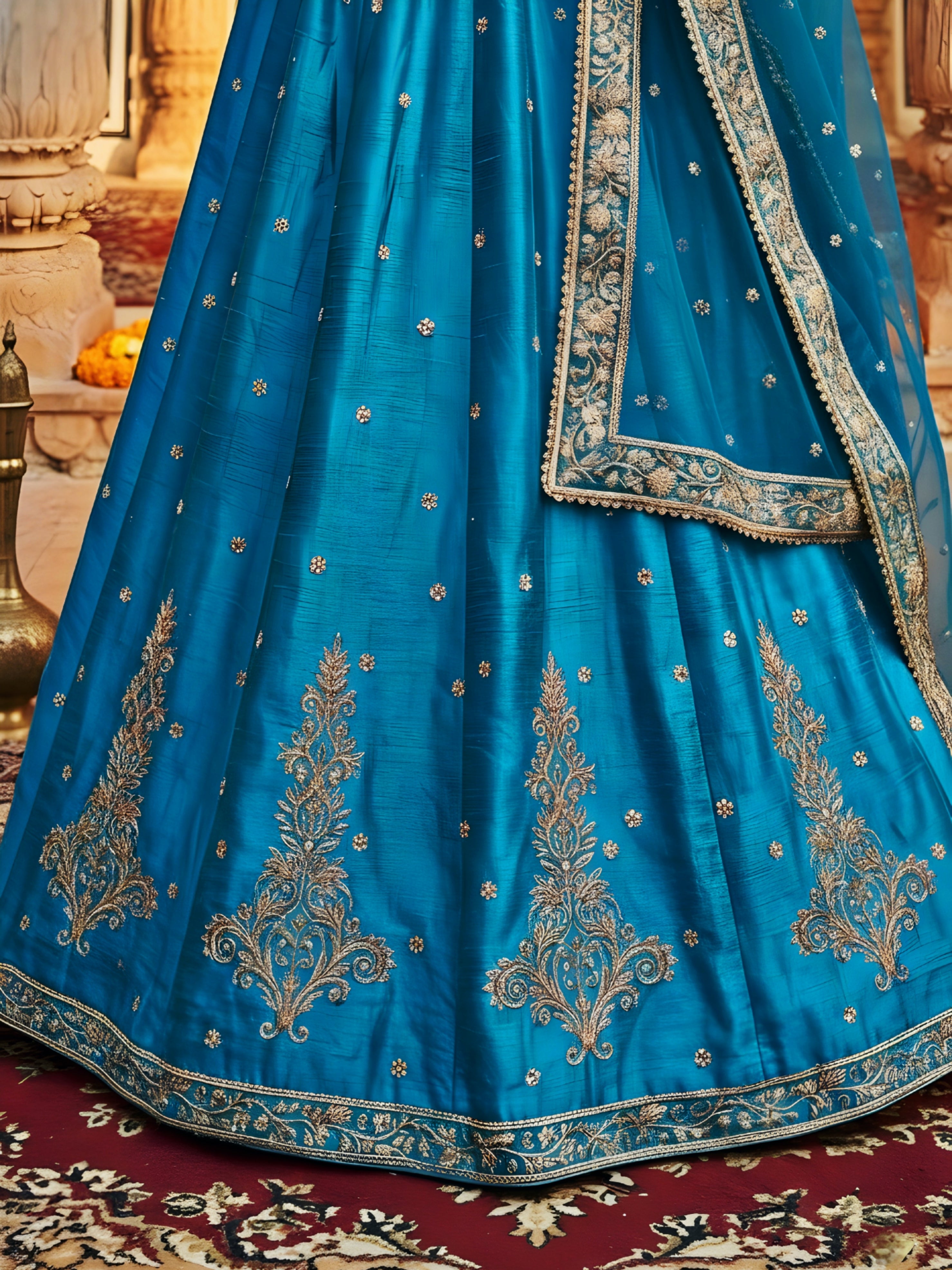 This stunning teal lehenga choli is crafted for women who love luxurious, royal fashion.