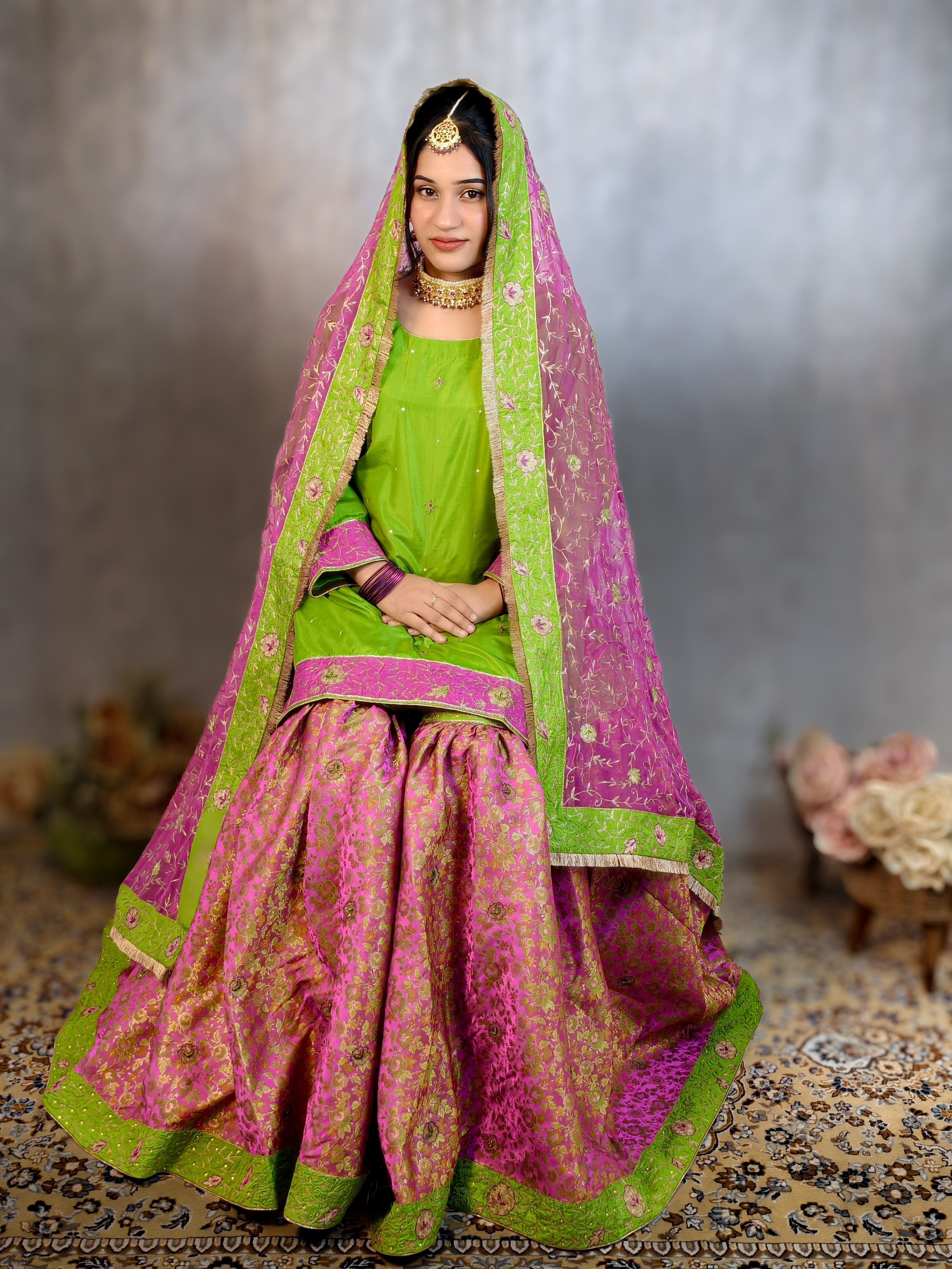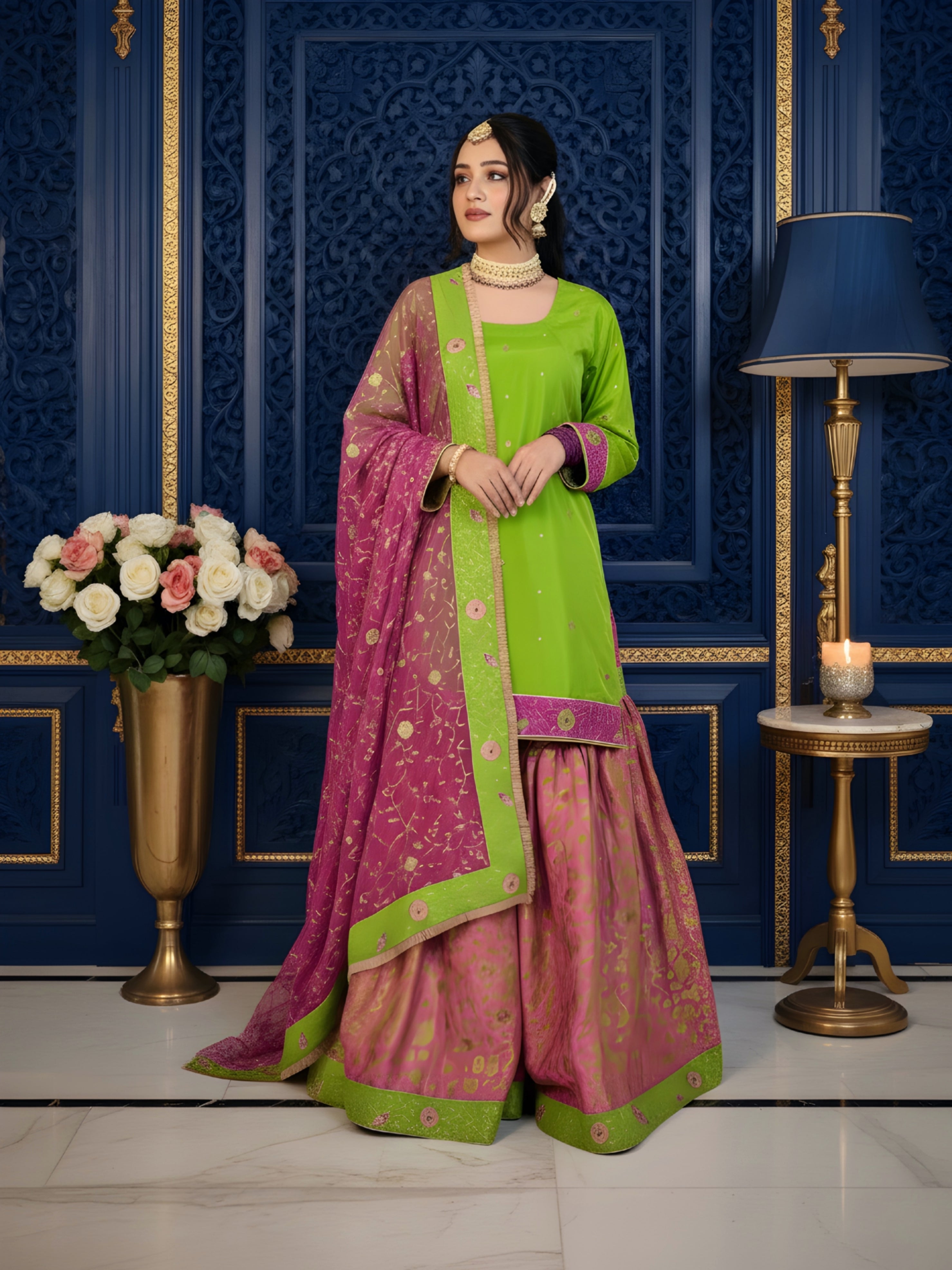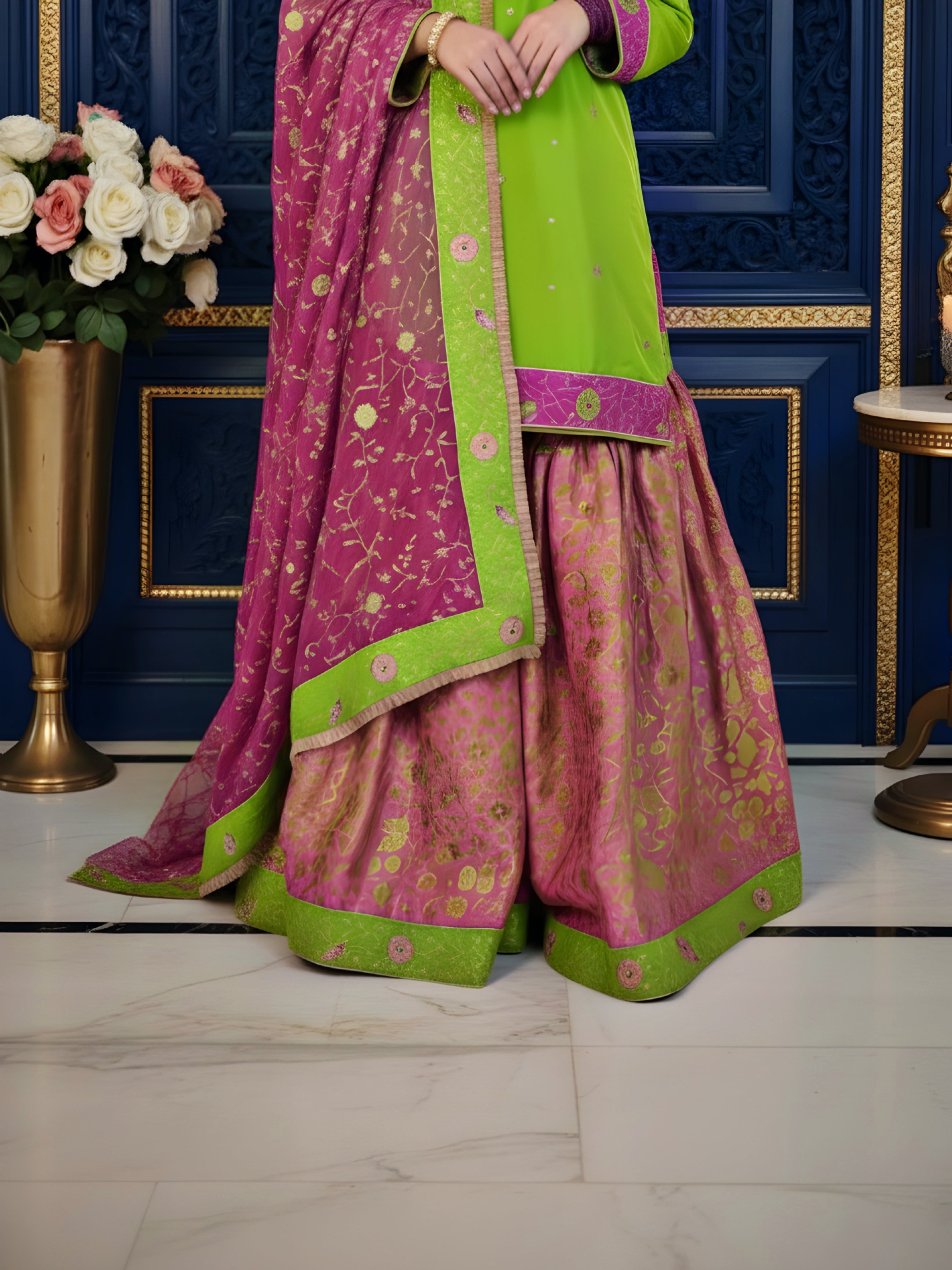This vibrant and regal Banarasi gharara set is designed for brides and wedding attendees who love a blend of tradition and bold colors. The green kameez is beautifully paired with a pink Banarasi gharara, while the heavily embroidered dual-tone dupatta enhances its royal charm. This outfit is perfect for Mehendi, Nikkah, and festive celebrations.