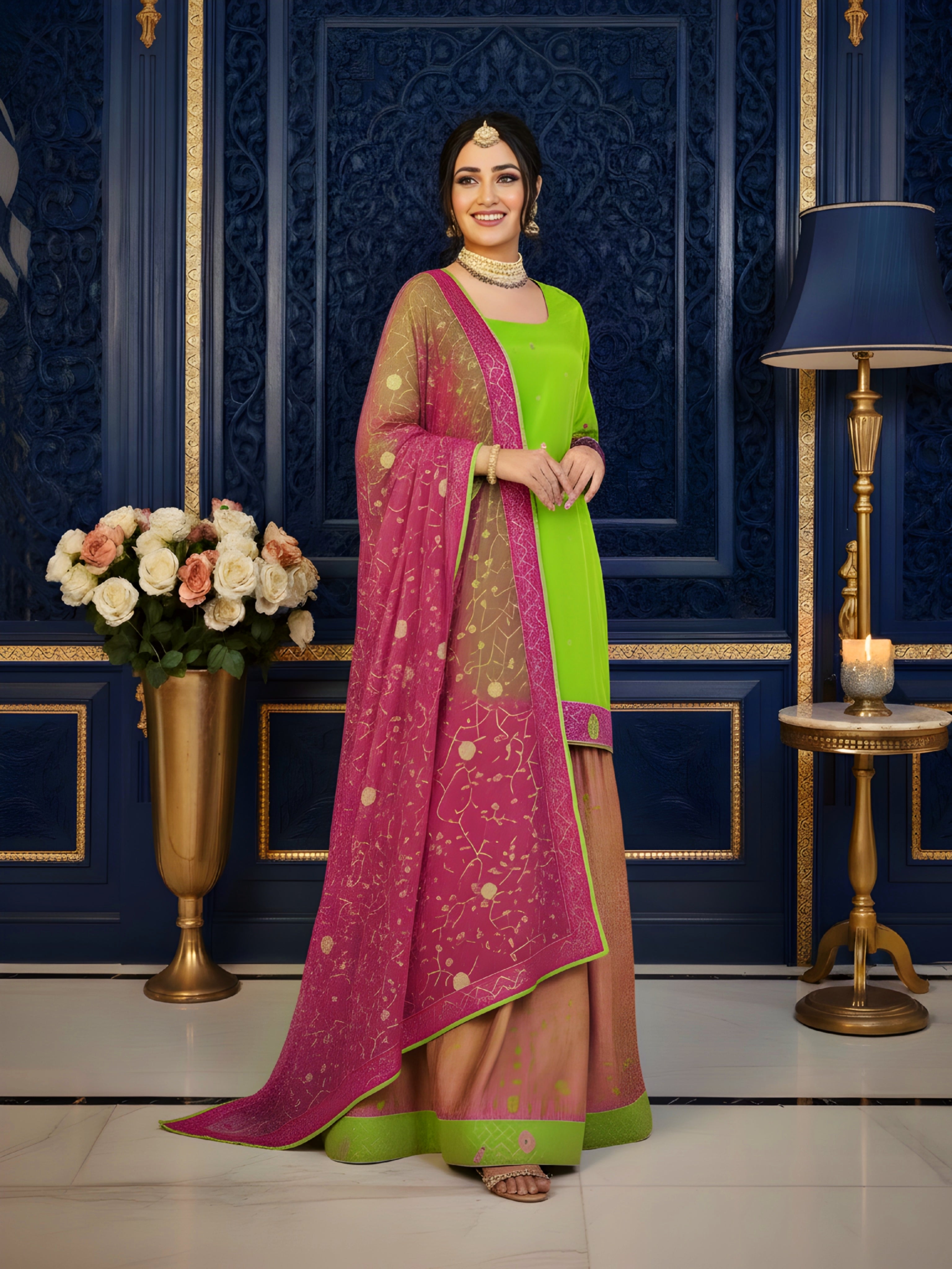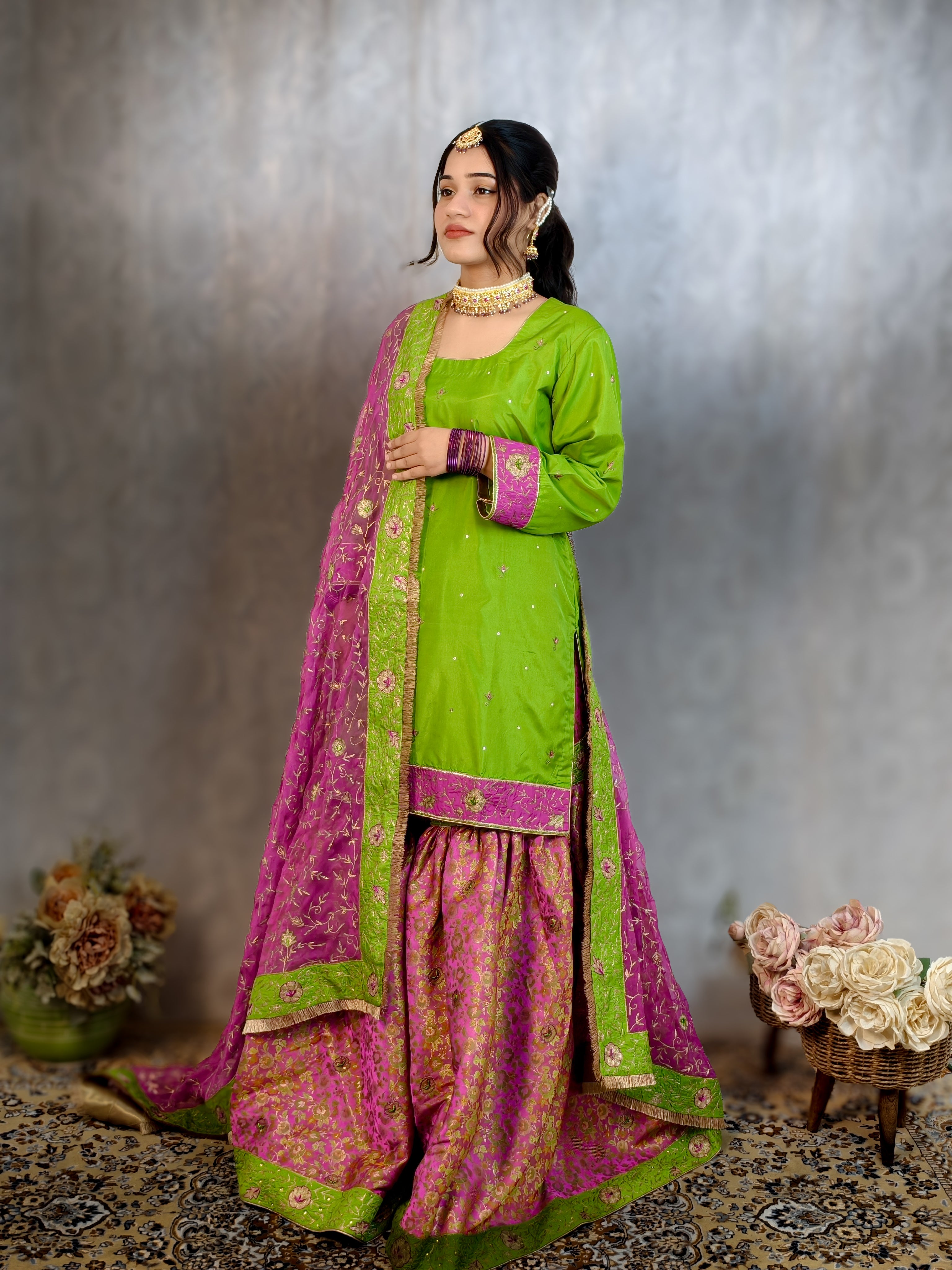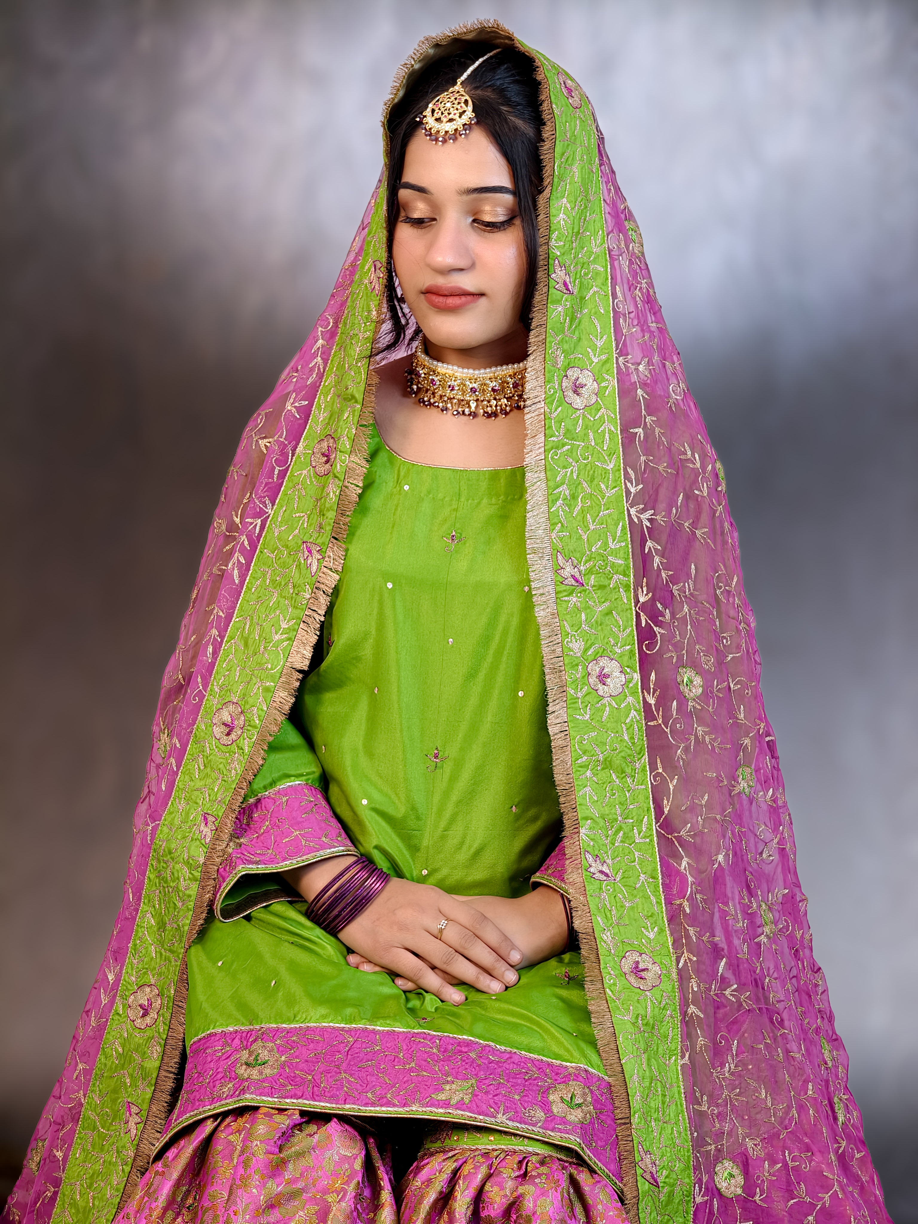 This vibrant and regal Banarasi gharara set is designed for brides and wedding attendees who love a blend of tradition and bold colors. The green kameez is beautifully paired with a pink Banarasi gharara, while the heavily embroidered dual-tone dupatta enhances its royal charm. This outfit is perfect for Mehendi, Nikkah, and festive celebrations.